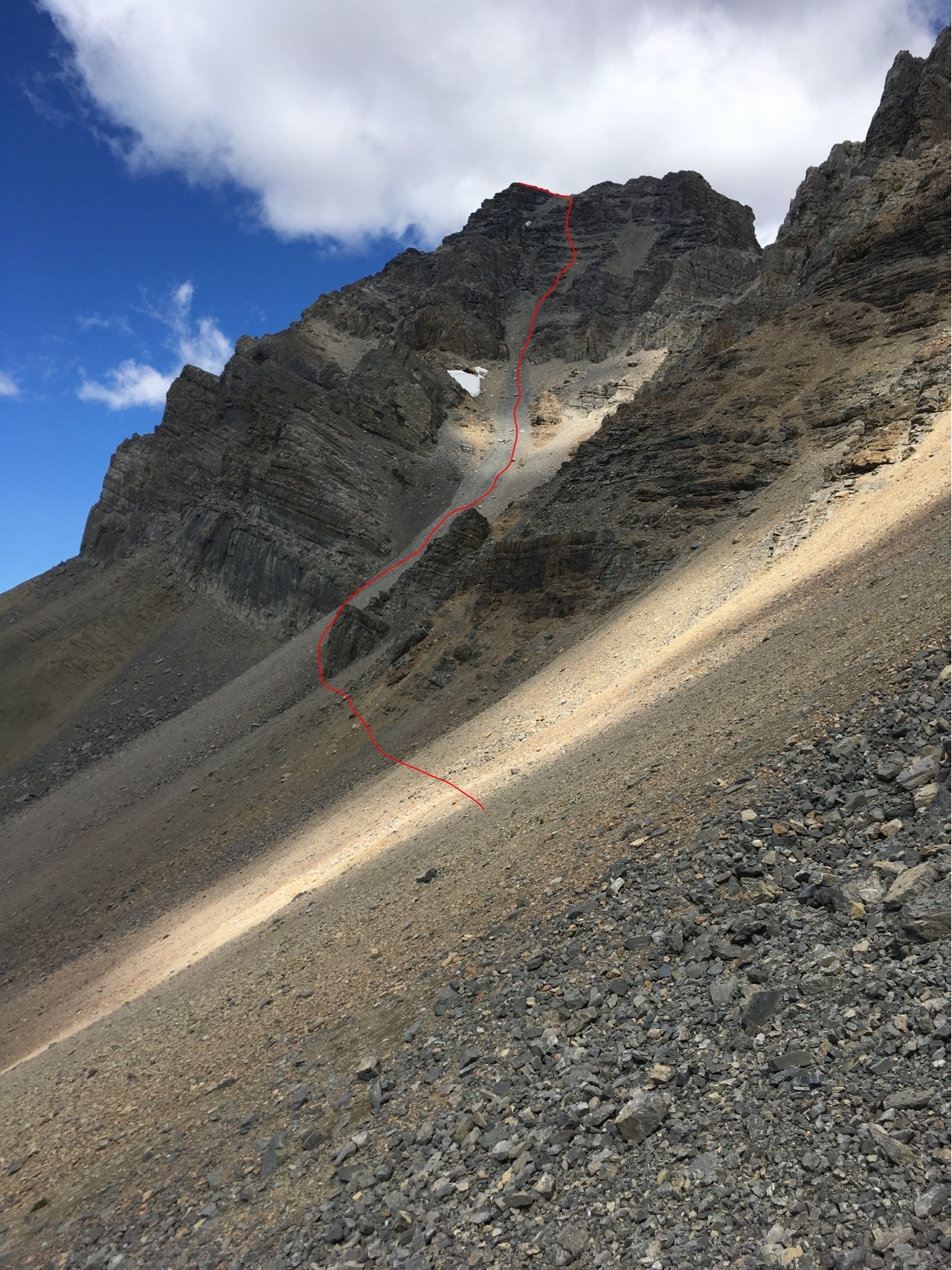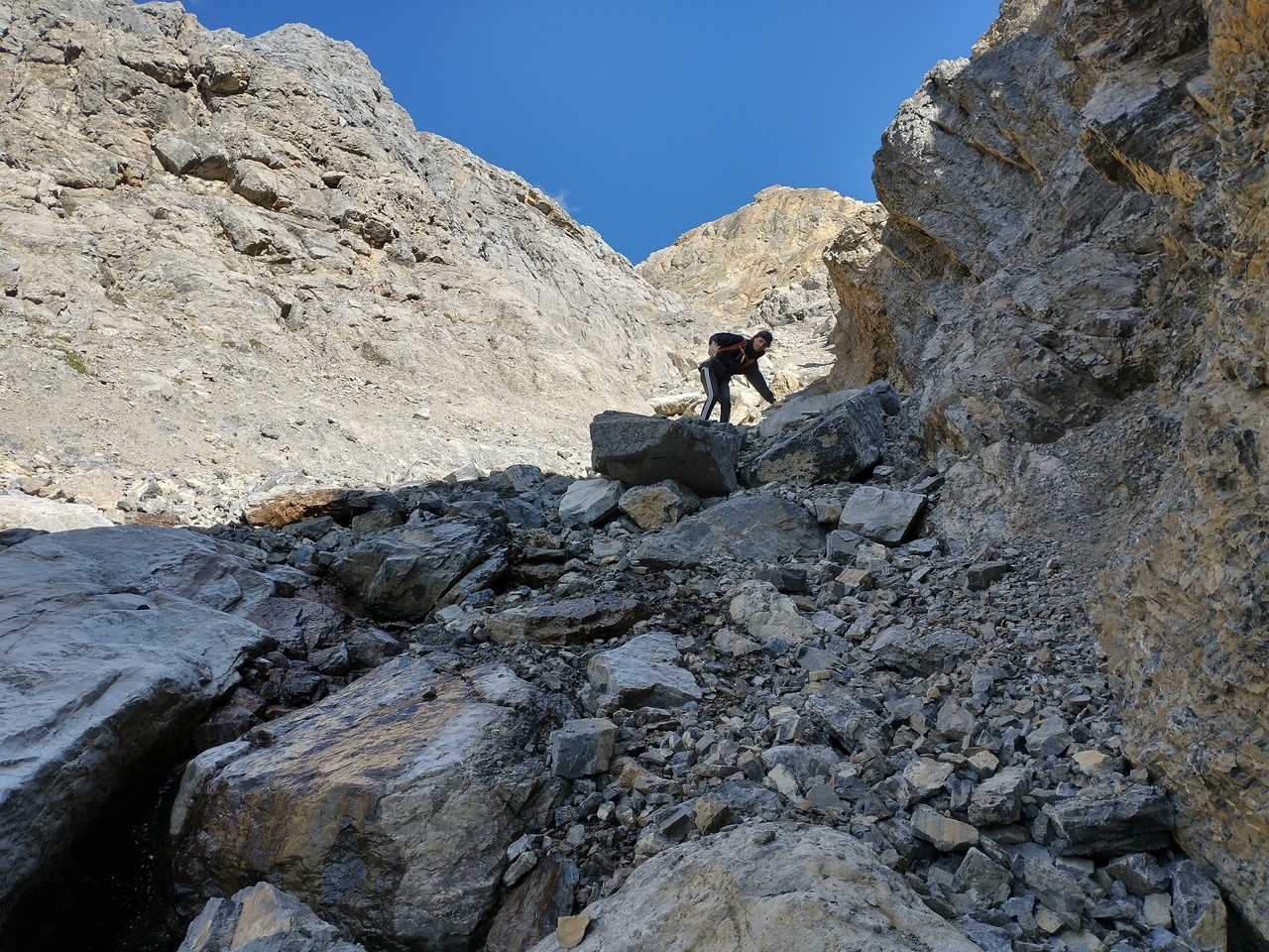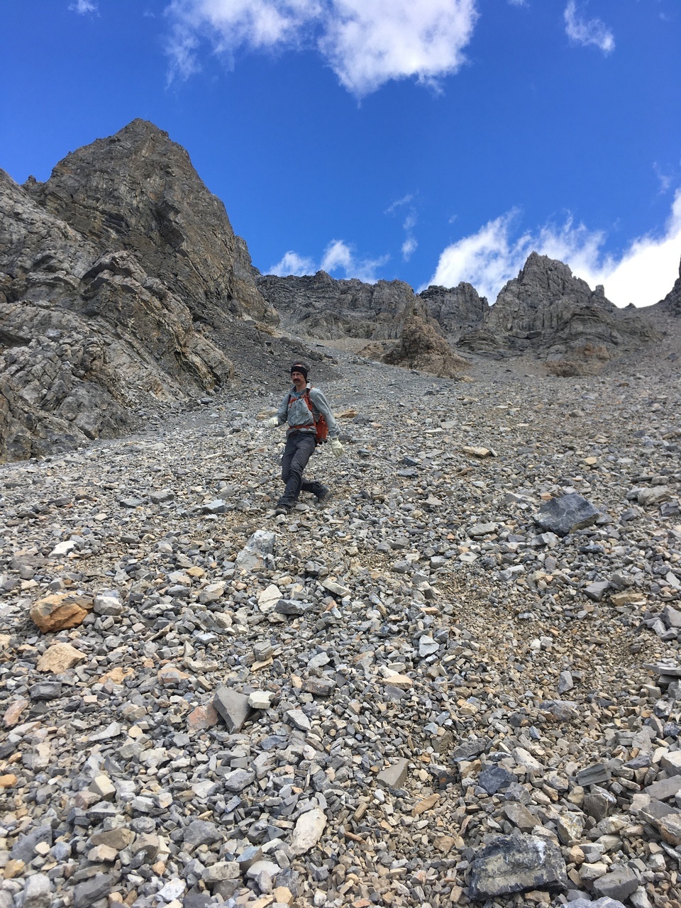 Once below the solid rock, we continued to descend down scree until near the bottom of the gully, when we could start traversing towards Silverhorn!