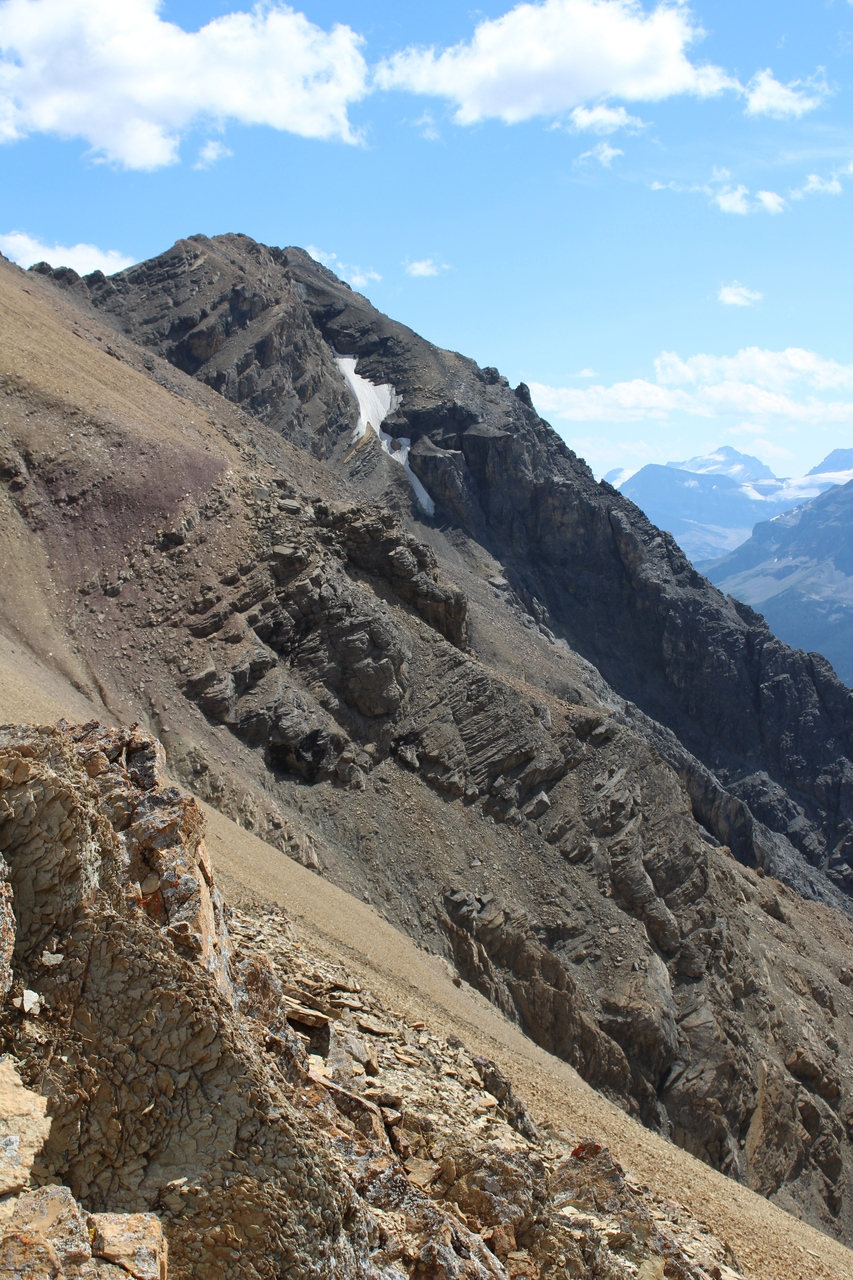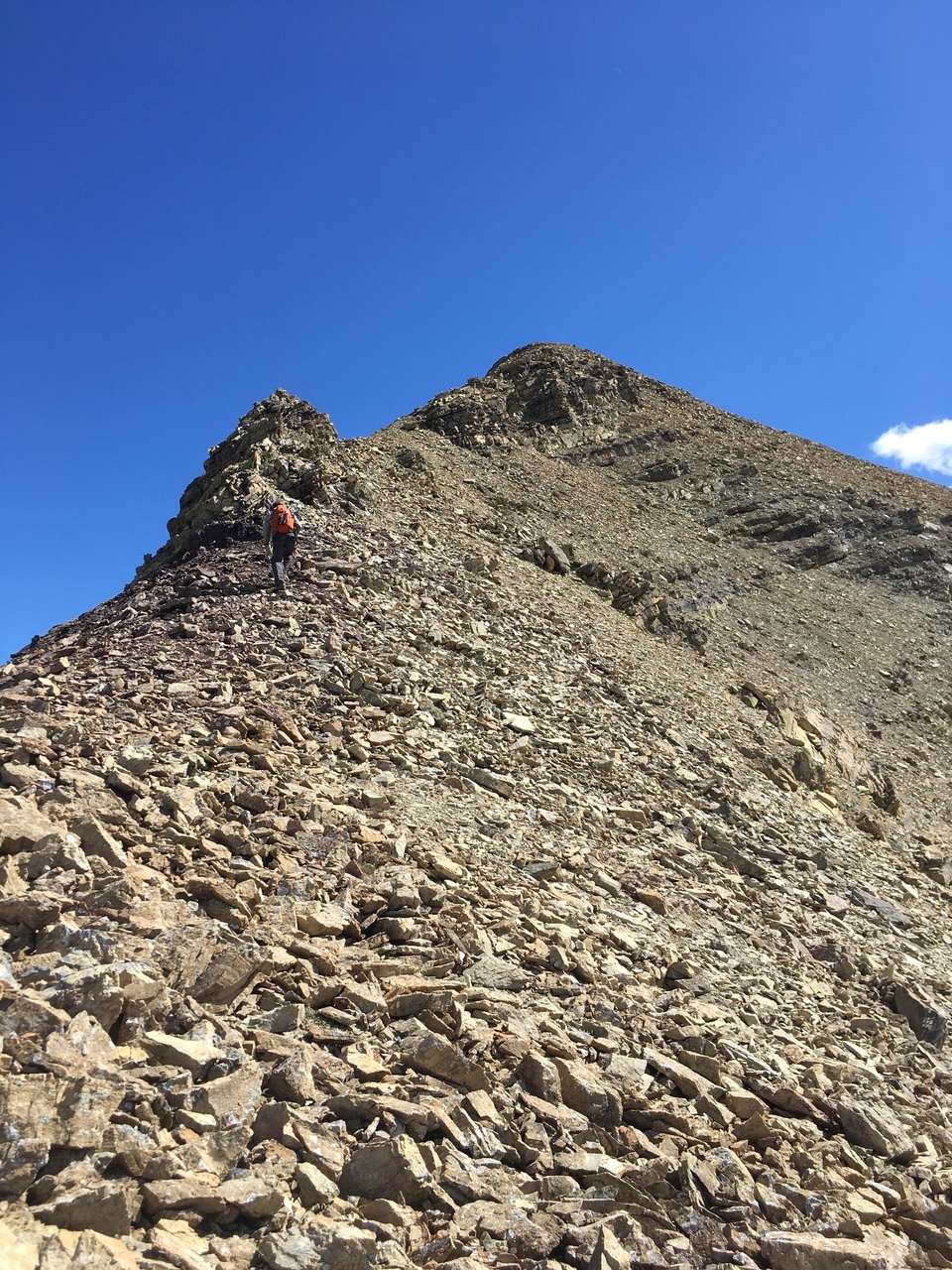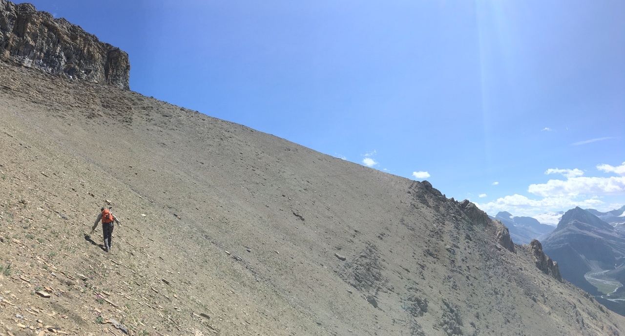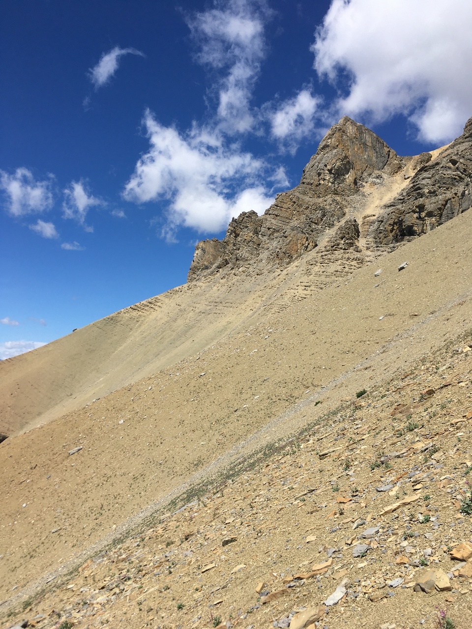 My dad looks like a tiny speck on this big slope! Soon the side-hilling did improve (on soft dirt and scree), which was a good thing, because it's a lot more of it than I initially thought to reach the beginning of the ridge to Silverhorn! The first highpoint on the ridge can be seen (center-right) with a patch of snow. The summit of Silverhorn (darker grey) is in the distance, peeking out just to the right of that!