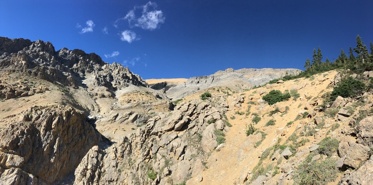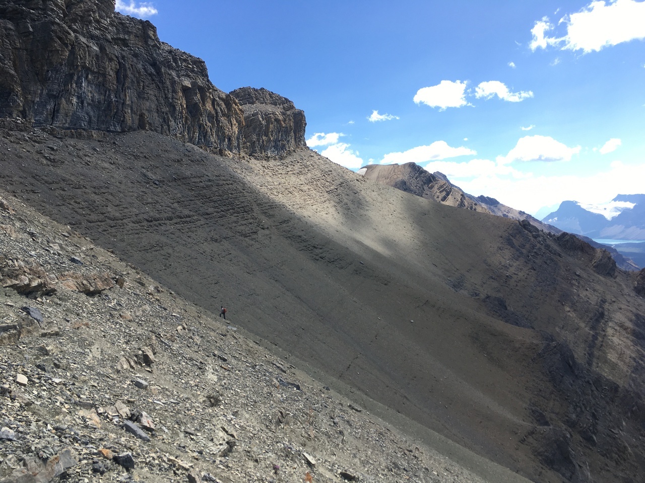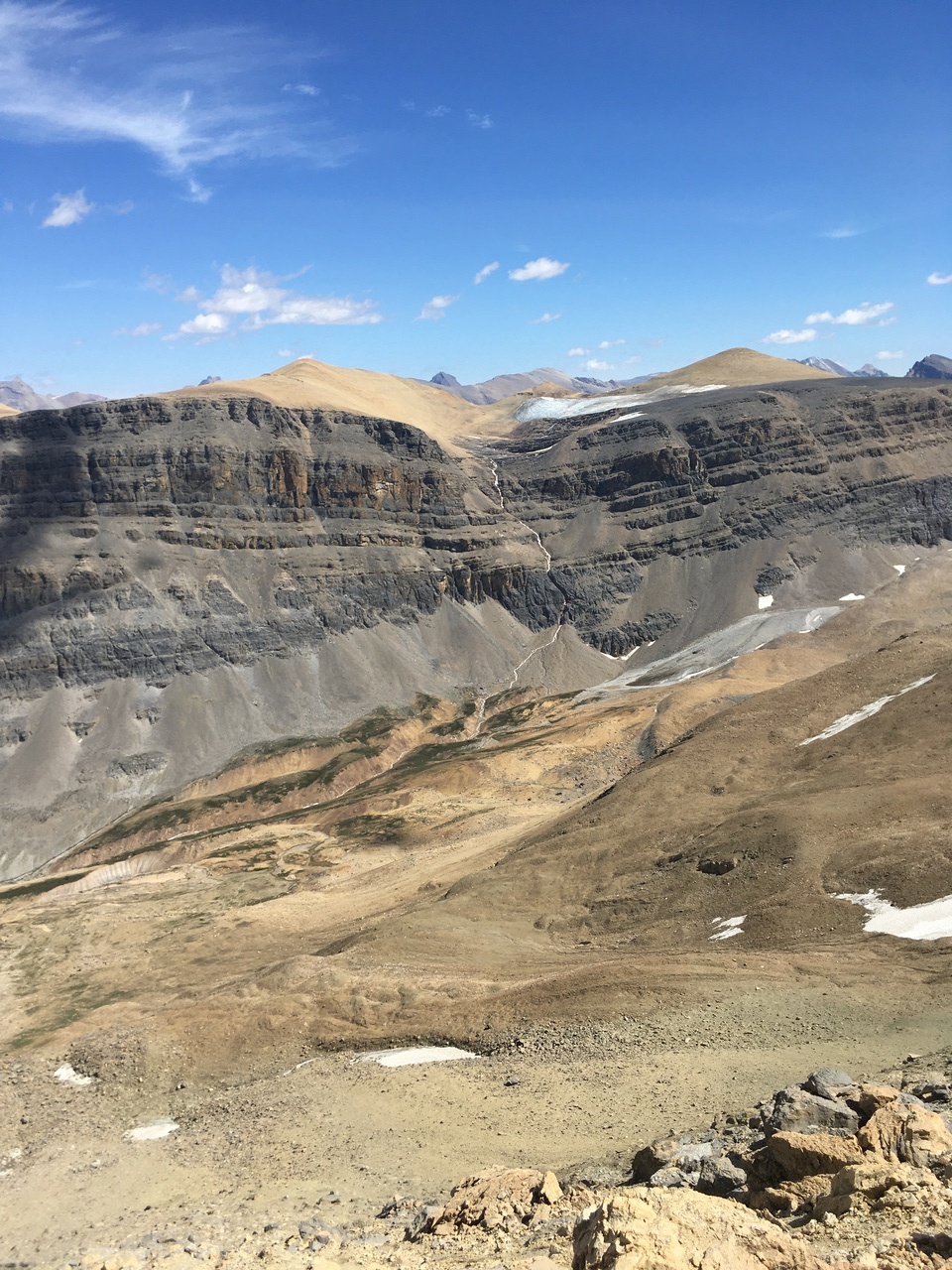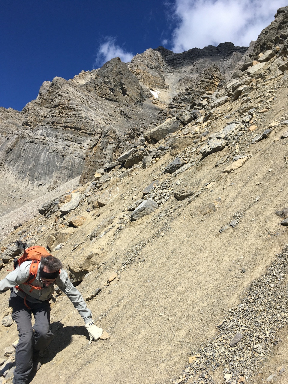 My dad looks like a tiny speck on this big slope! Soon the side-hilling did improve (on soft dirt and scree), which was a good thing, because it's a lot more of it than I initially thought to reach the beginning of the ridge to Silverhorn! The first highpoint on the ridge can be seen (center-right) with a patch of snow. The summit of Silverhorn (darker grey) is in the distance, peeking out just to the right of that!