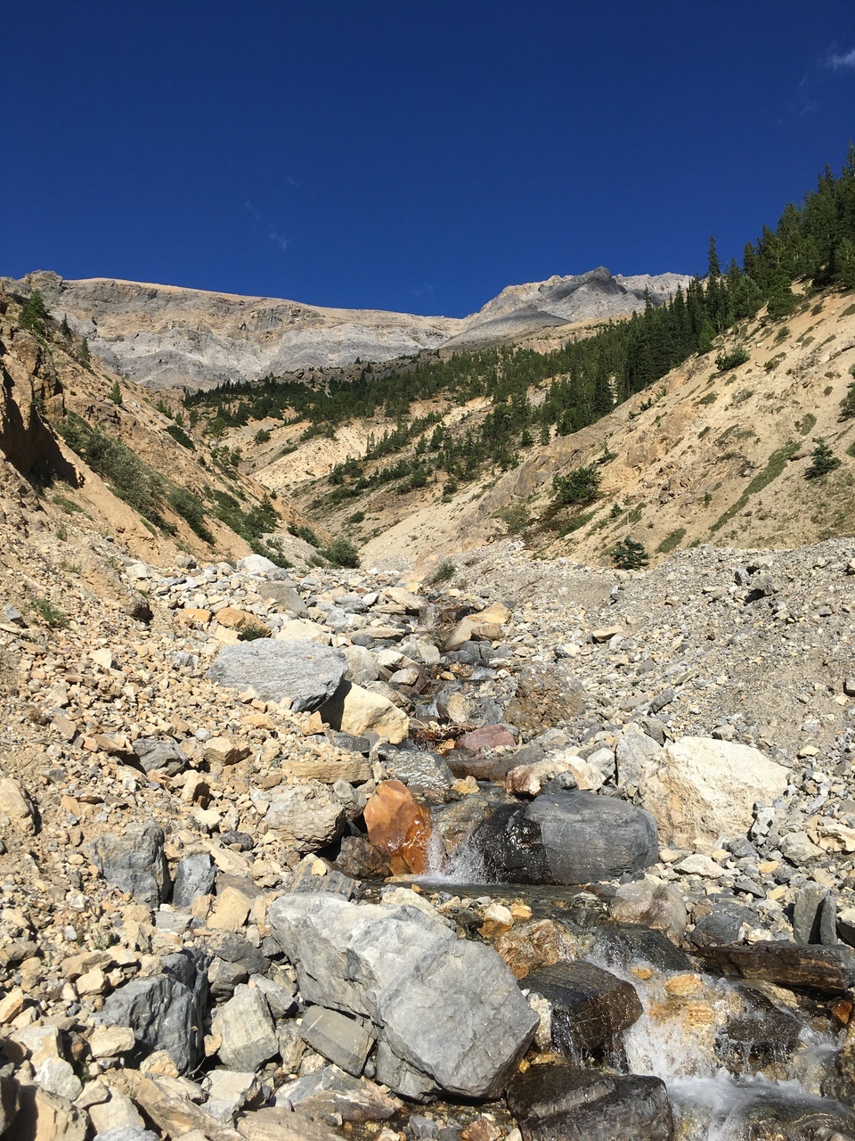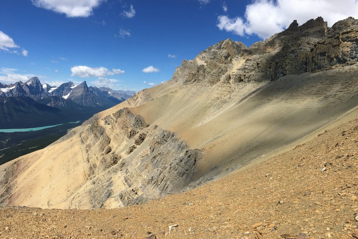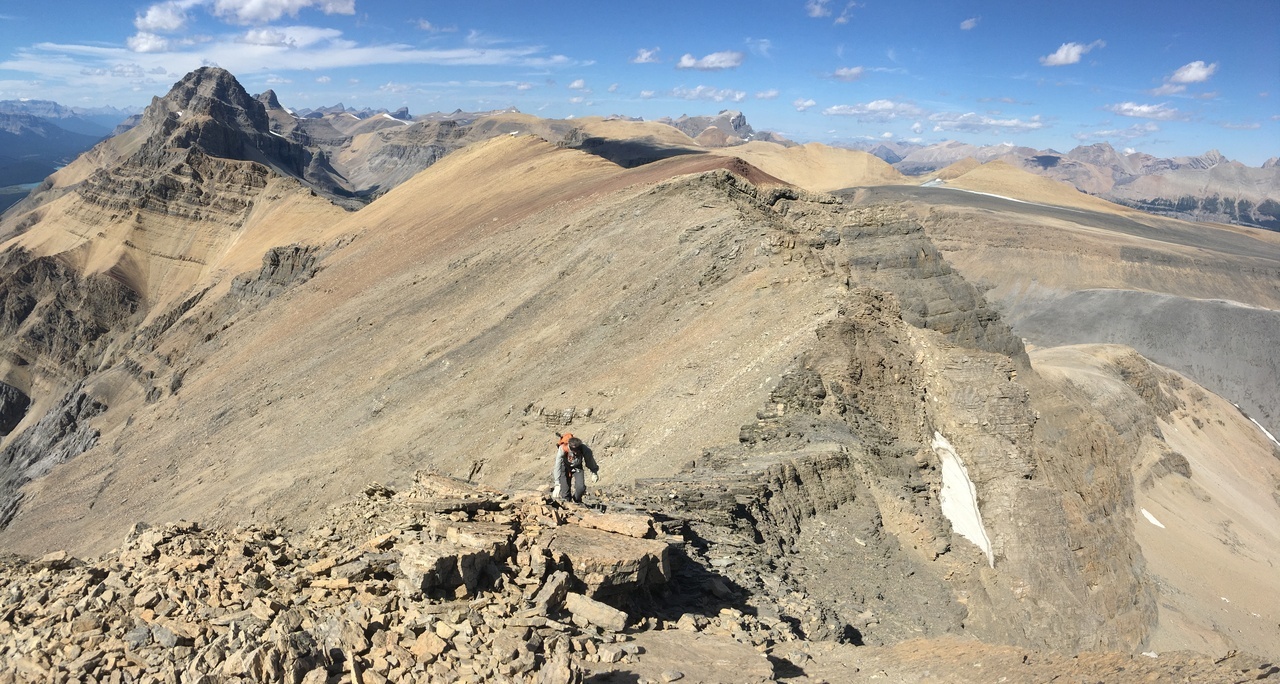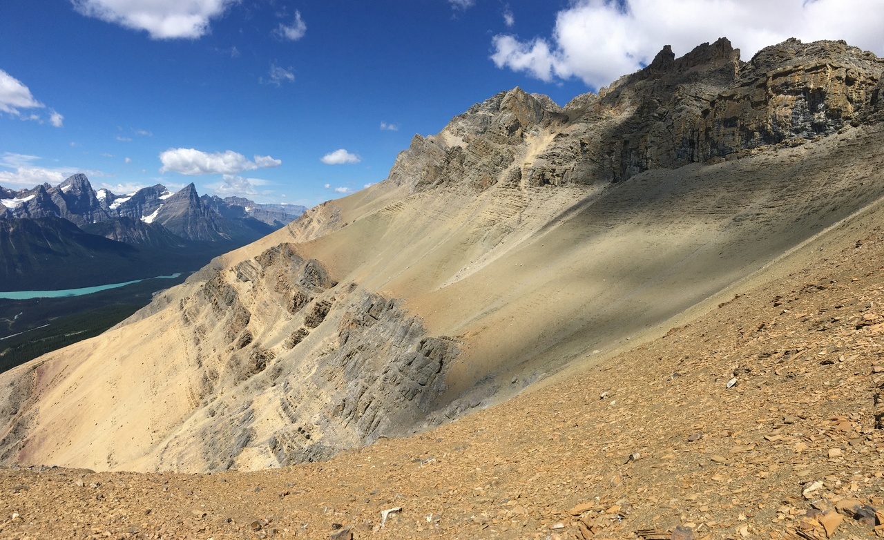 My dad looks like a tiny speck on this big slope! Soon the side-hilling did improve (on soft dirt and scree), which was a good thing, because it's a lot more of it than I initially thought to reach the beginning of the ridge to Silverhorn! The first highpoint on the ridge can be seen (center-right) with a patch of snow. The summit of Silverhorn (darker grey) is in the distance, peeking out just to the right of that!