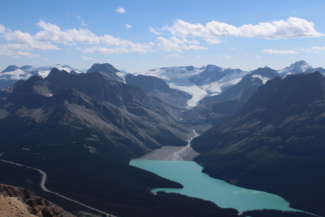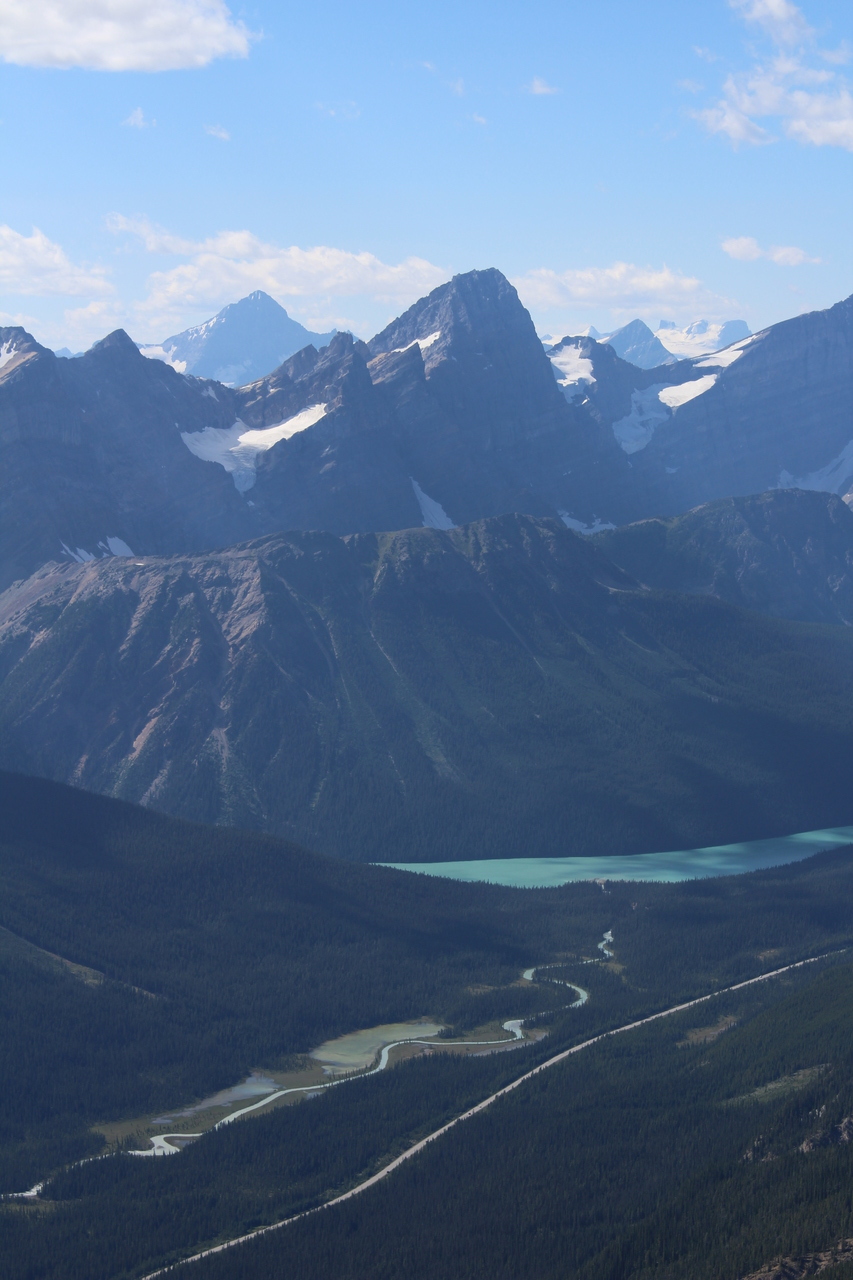 Caldron Mountain rises to the right of Peyto Lake, with Peyto Peak and Baker behind! Glaciated Mounts Rhondda and Habel rise center, with Thompson above Jimmy Simpson to the left!