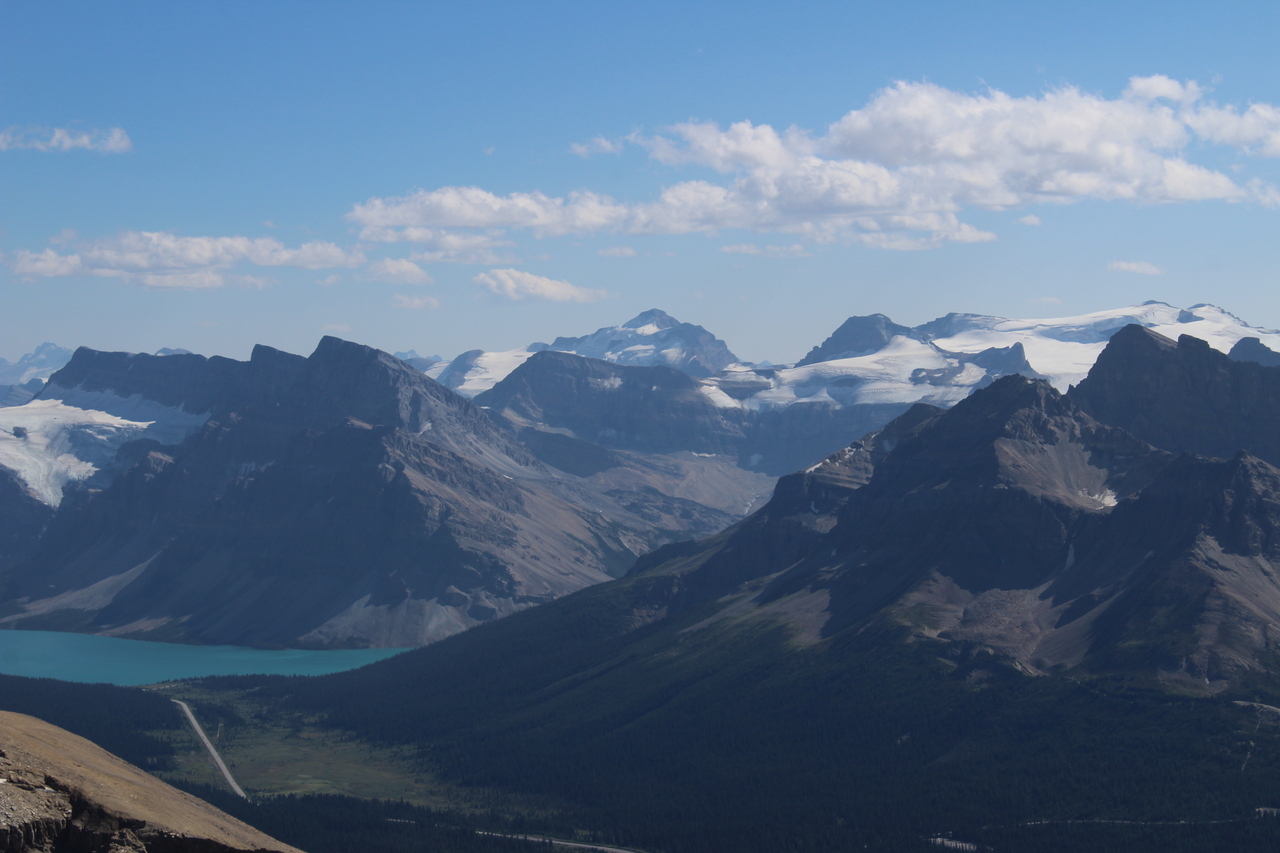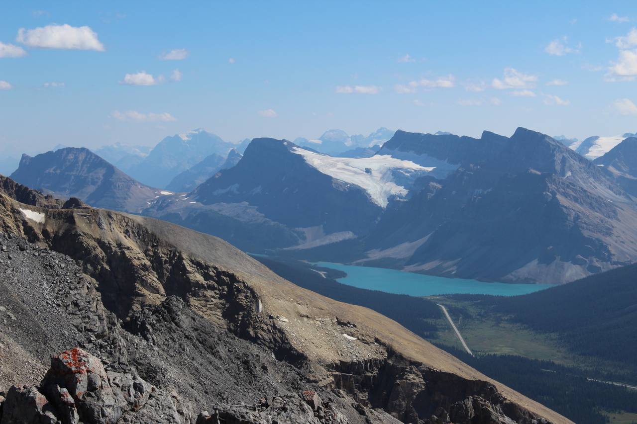 Bow Peak, Mount Temple (distant), Bowcrow Peak, Mount Victoria (distant), and Crowfoot Mountain above Bow Lake (left to right)!