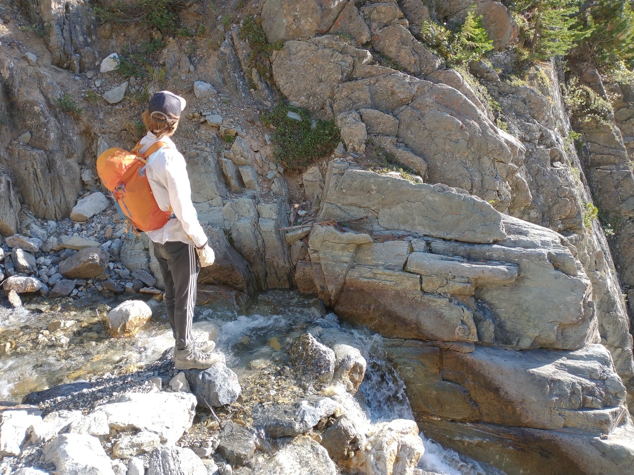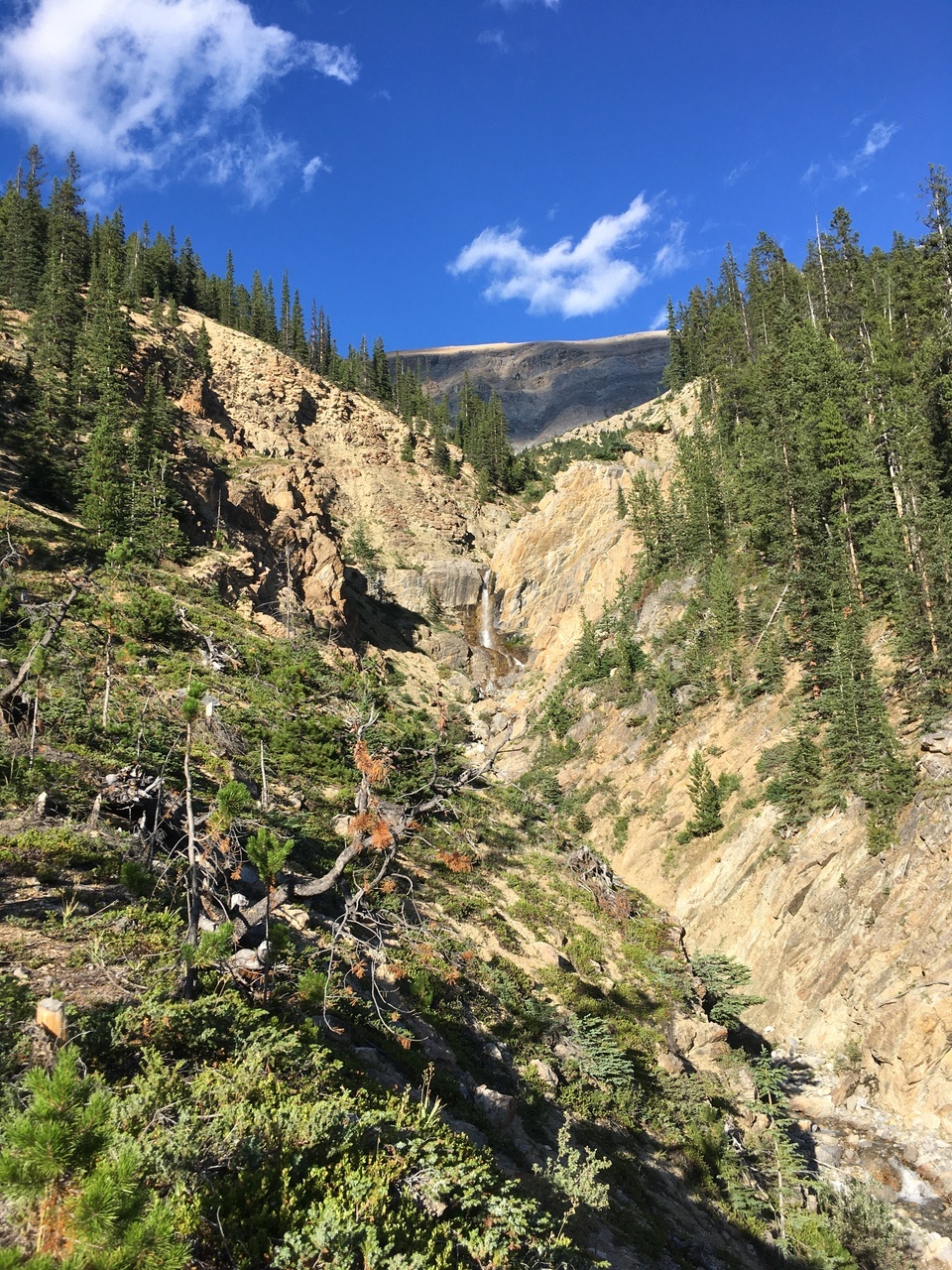 Eventually we got cliffed out by a waterfall, and had to back-track up the treed slopes to the right. Photo credit: Dad