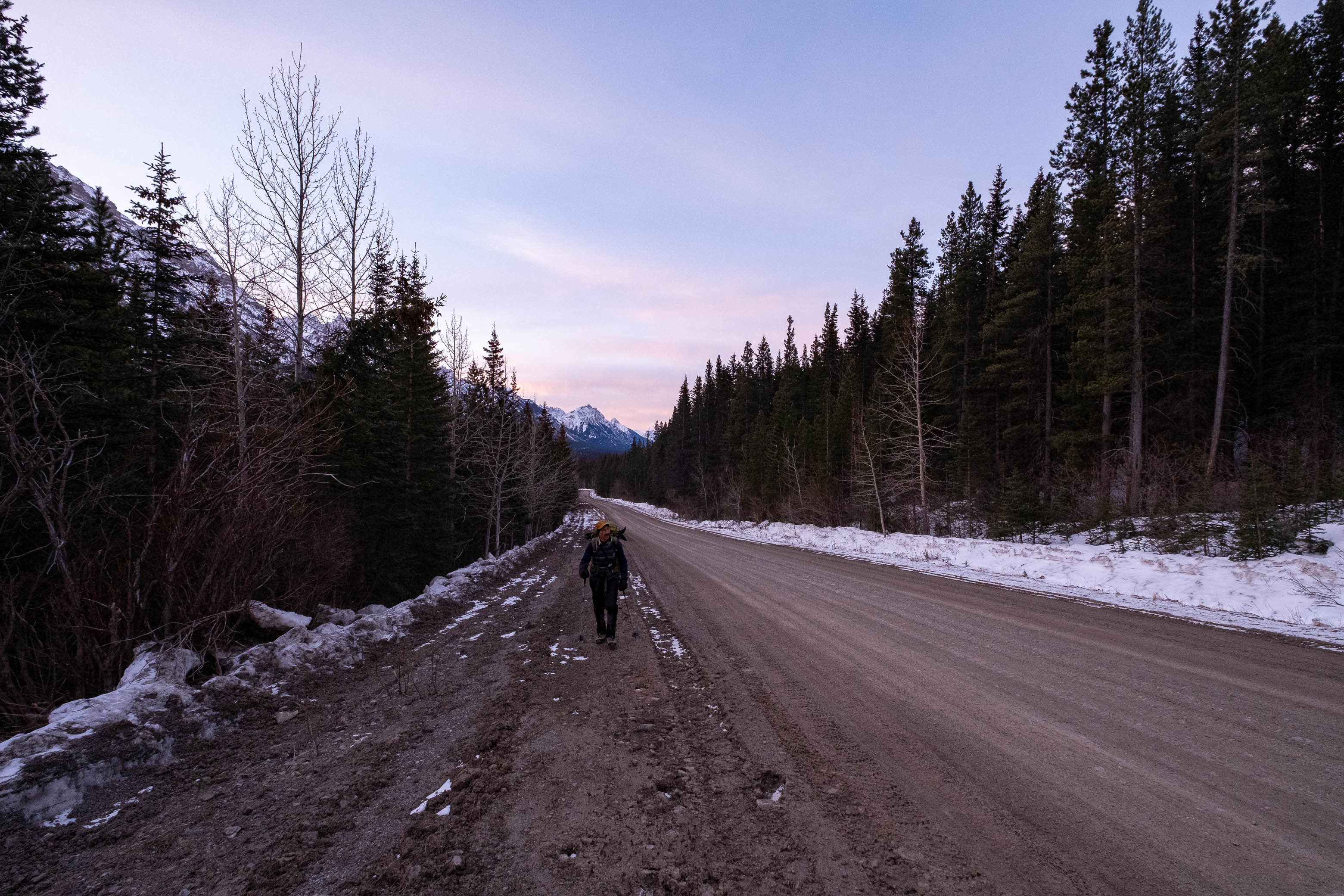With the forecast predicting a nice weather window in the morning (clouding over by noon), I wanted to get an early start, knowing that we had a lot of distance to cover before we climbed out of the trees. We pulled up to the Fortress Road gate in darkness and were extremely surprised to find two cars already stopped there...A man stepped out and came to our window, informing us that they were filming a movie up at the ski hill and that we couldn't park there. We told him we were just going for a hike, and he suggested we try parking at the Centex across the highway. After gearing up for the day, we headed over to the Fortress Road once again (this time on foot) finding the same guy, now parked in front of the gate with "SECURITY" written across the windshield of his Jeep. I was seriously worried that we wouldn't be allowed past, but luckily, after describing our intentions, agreeing not to go to the resort, and being warned about big trucks on the road, we were allowed to continue on our way. What a relief!!