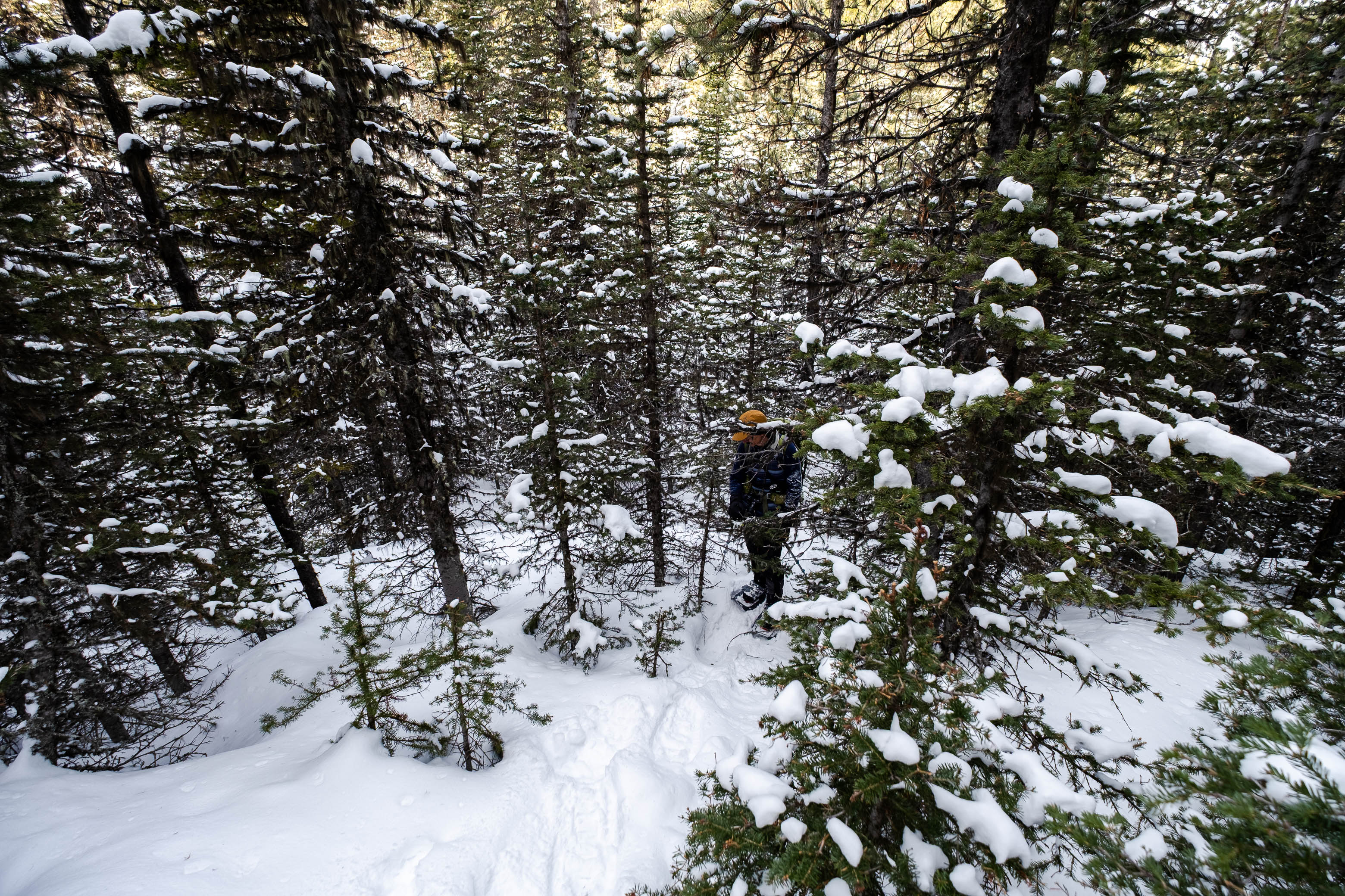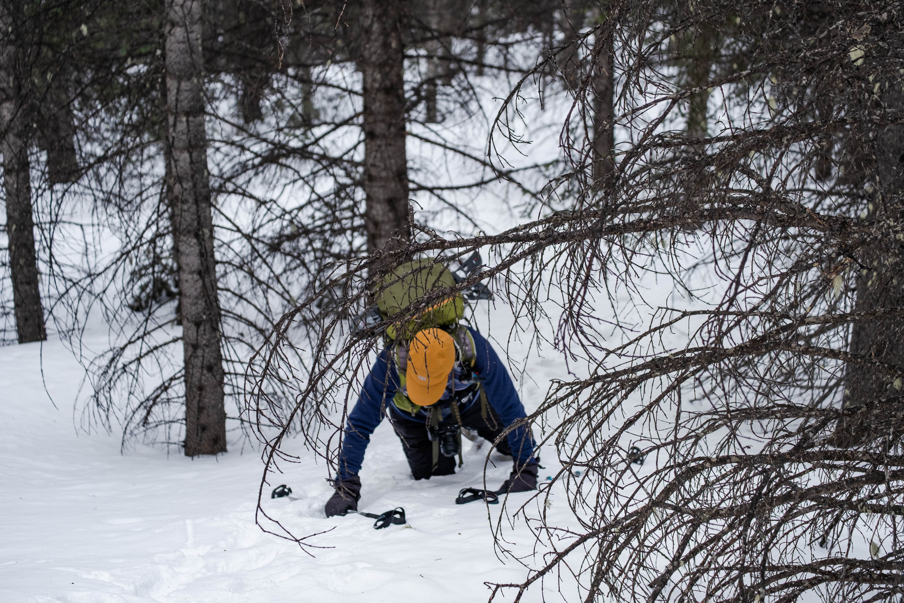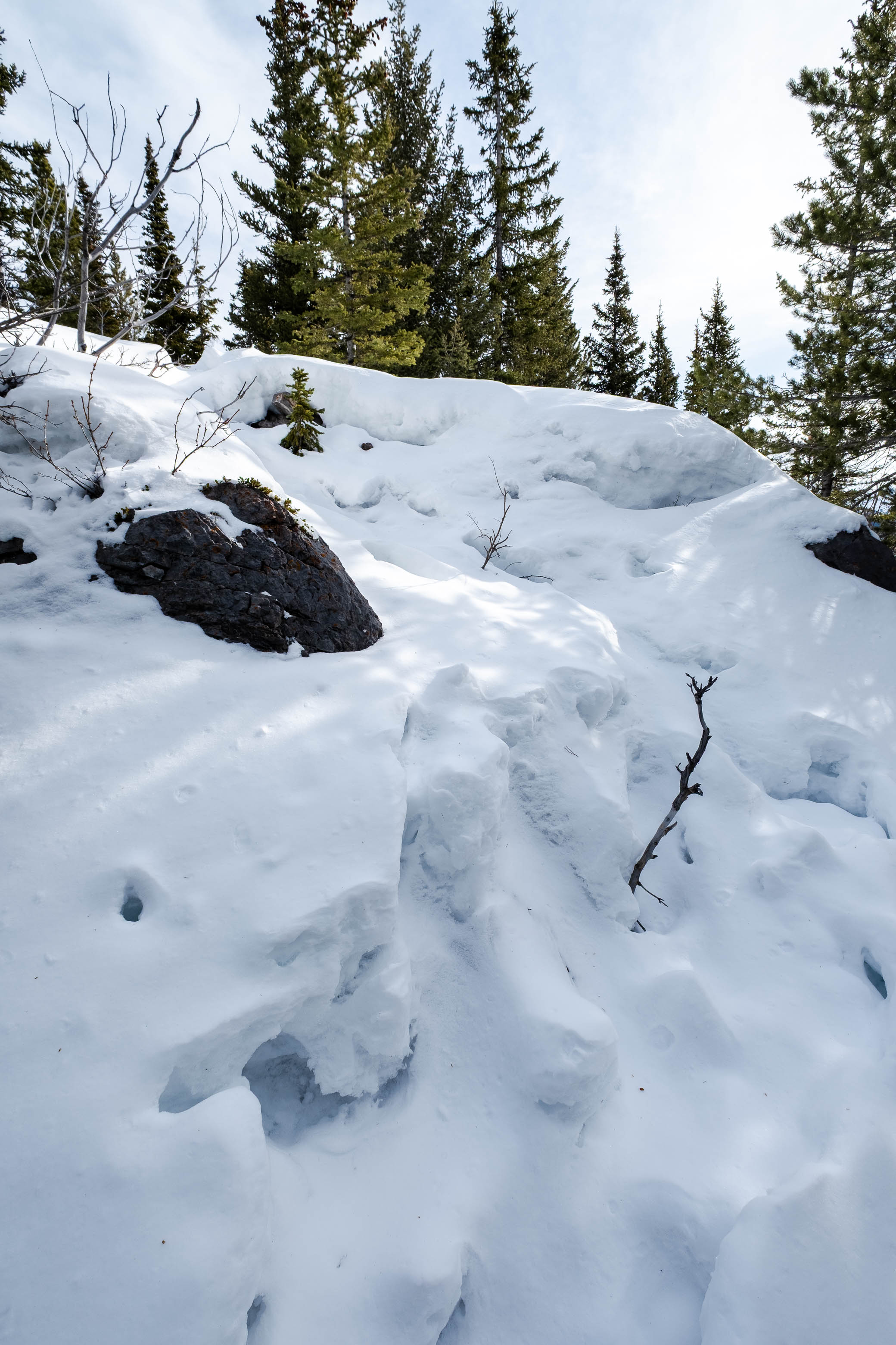Although covered by a light layer of fresh snow, the shelter of the trees was enough to preserve the tracks, and we easily followed in Carlos' footsteps (literally 😉), first down a couple steep slopes, and then north, up rolling terrian towards our objective! The snowpack had solidified significantly since Carlos' group came through, and we passed a few sections were it was obvious that they were tirelessly fighting through waist-deep, unconsolidated snow, while we simply walked around the "crevasses" they created on a supportive crust. 😂 So while I can't say their tracks benefited us much where trail-breaking is concerned, they were invaluable in terms of routefinding, completely taking it out of the equation, and saving us many minutes that would otherwise have been spent trying to orient ourselves in what could be a very disorienting forest!