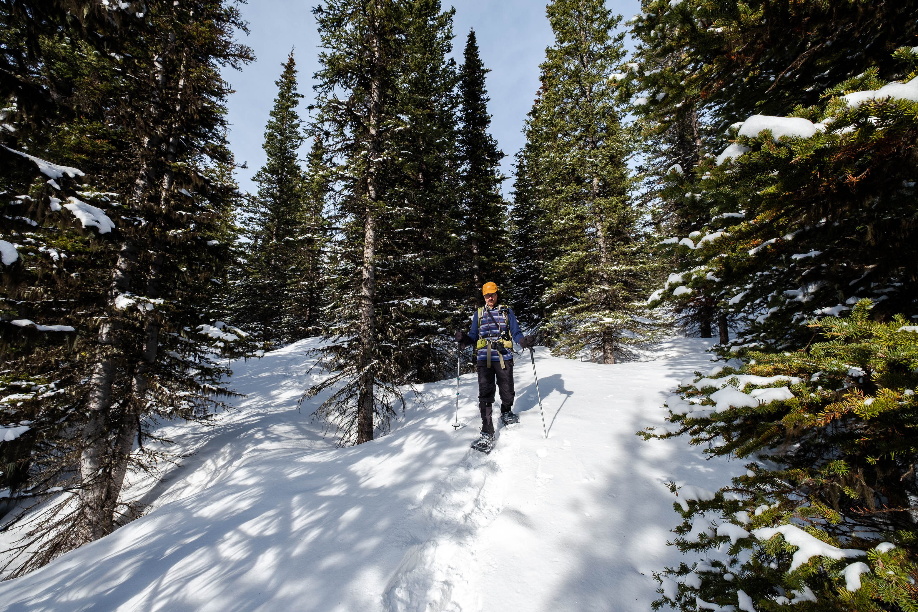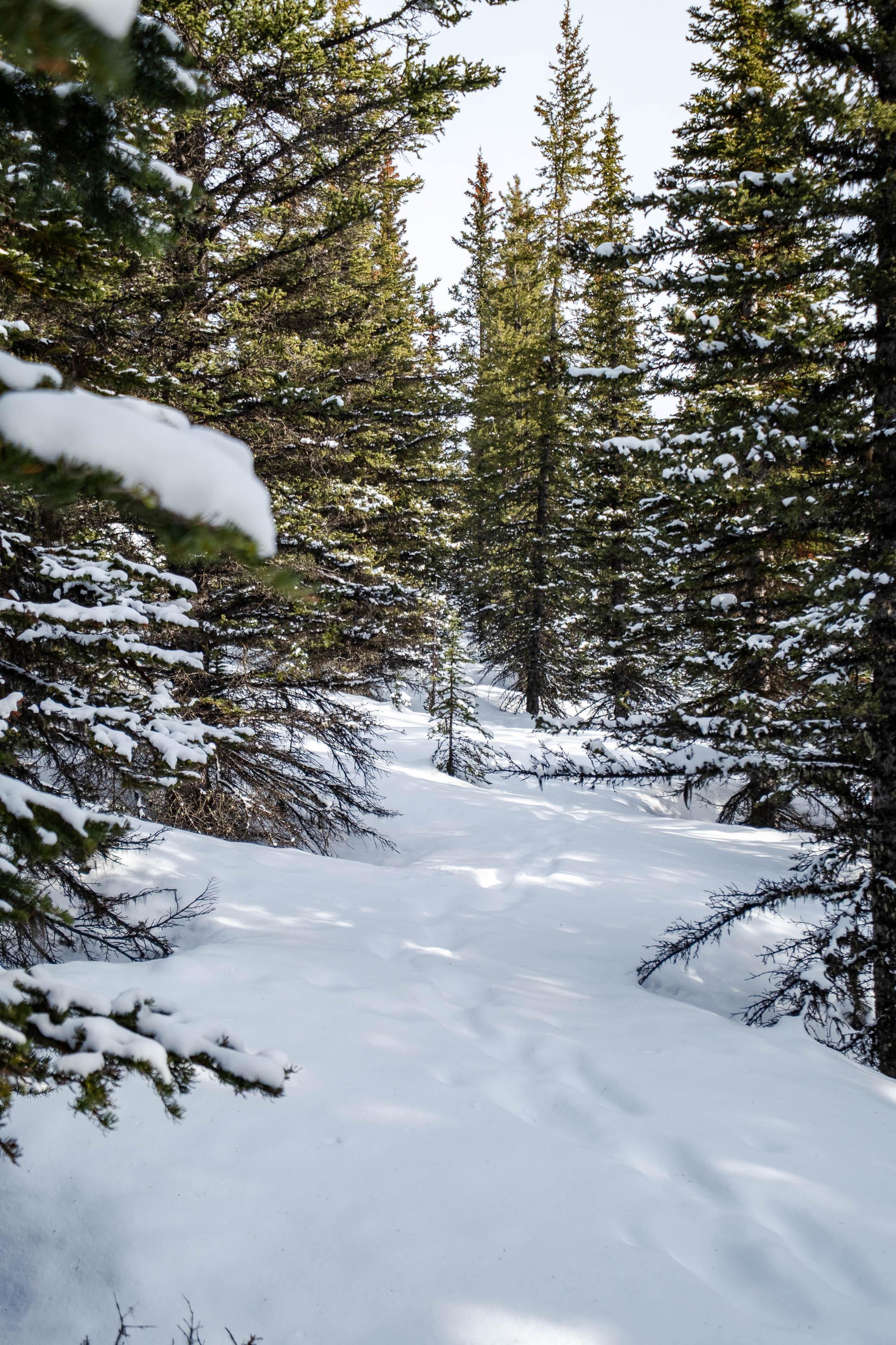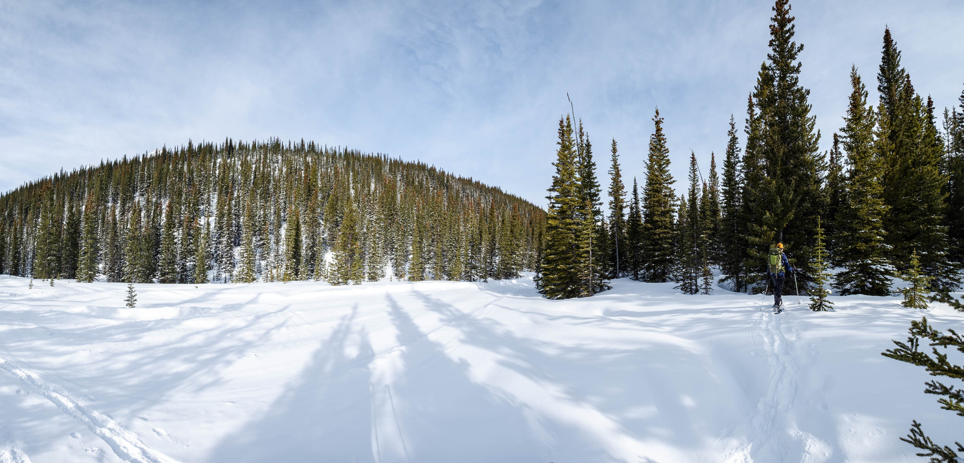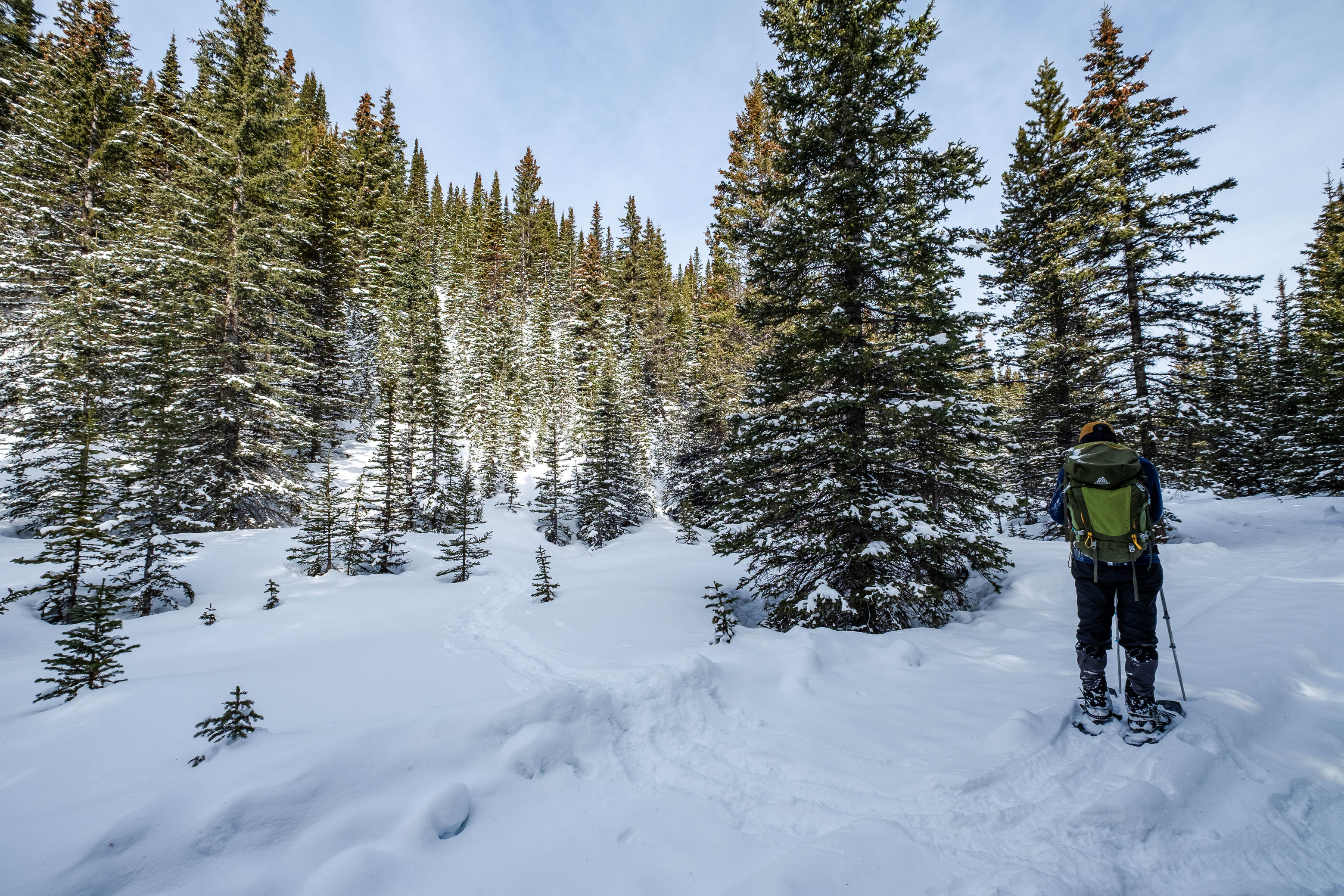 Although covered by a light layer of fresh snow, the shelter of the trees was enough to preserve the tracks, and we easily followed in Carlos' footsteps (literally 😉), first down a couple steep slopes, and then north, up rolling terrian towards our objective! The snowpack had solidified significantly since Carlos' group came through, and we passed a few sections were it was obvious that they were tirelessly fighting through waist-deep, unconsolidated snow, while we simply walked around the "crevasses" they created on a supportive crust. 😂 So while I can't say their tracks benefited us much where trail-breaking is concerned, they were invaluable in terms of routefinding, completely taking it out of the equation, and saving us many minutes that would otherwise have been spent trying to orient ourselves in what could be a very disorienting forest!