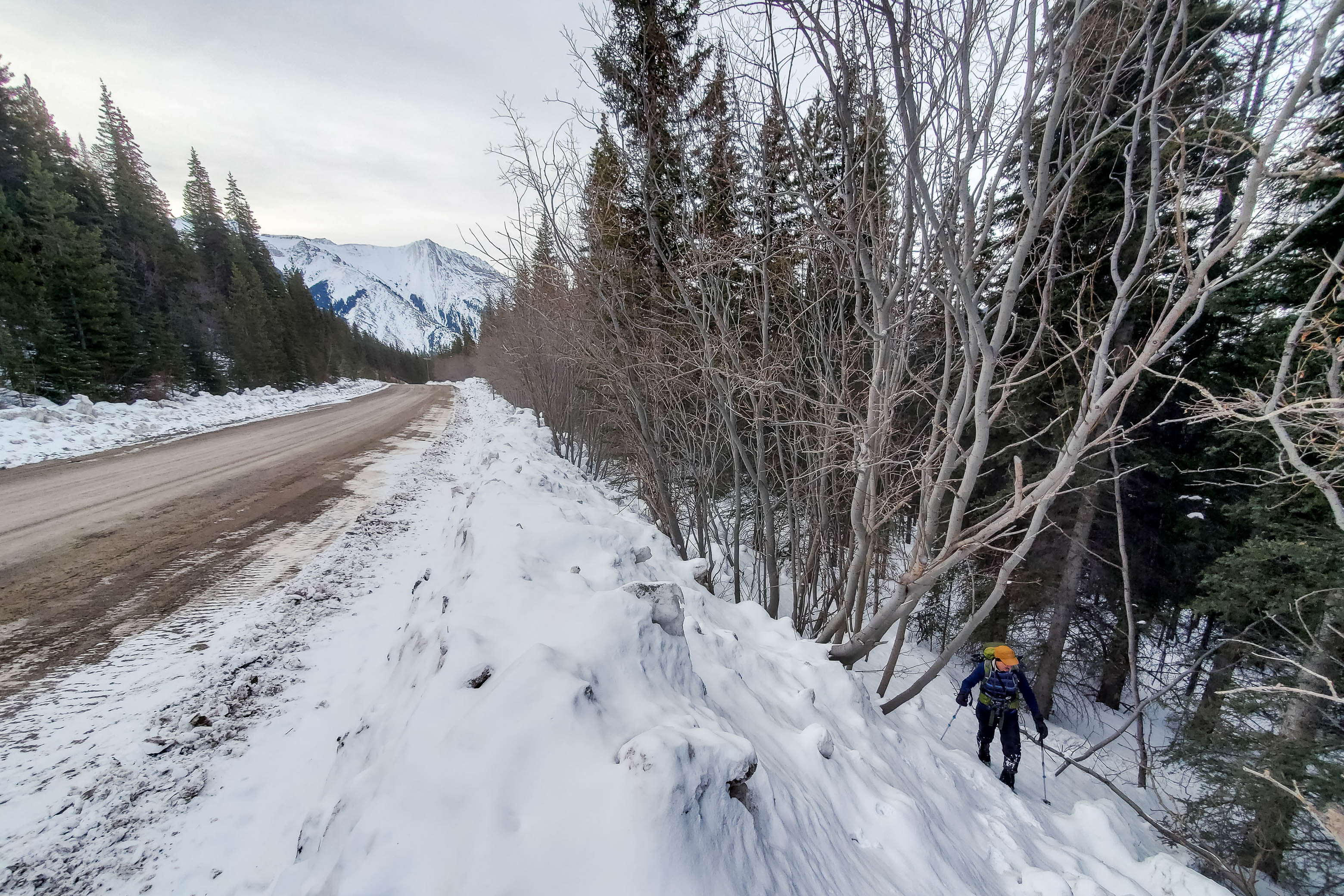 The gravel road had been plowed clean (good thing we weren't planning on skiing it!), and although long and boring, we were able to cover a good chunk of the approach in a relatively short amount of time - so that was nice! The road makes a couple sharp switchbacks higher up, and we tried to add some variety to our morning by shortcutting straight through the trees...Unlike the road, however, the trees were not plowed, and we soon found ourselves breaking through the upper sun-crust and postholing down to our waists in unconsolidated sugar! I quickly gave up on walking, and tried to distribute my weight by getting down on all fours and crawling the final 100 m to the road above. 😂 I honestly don't think we saved any time in the end...