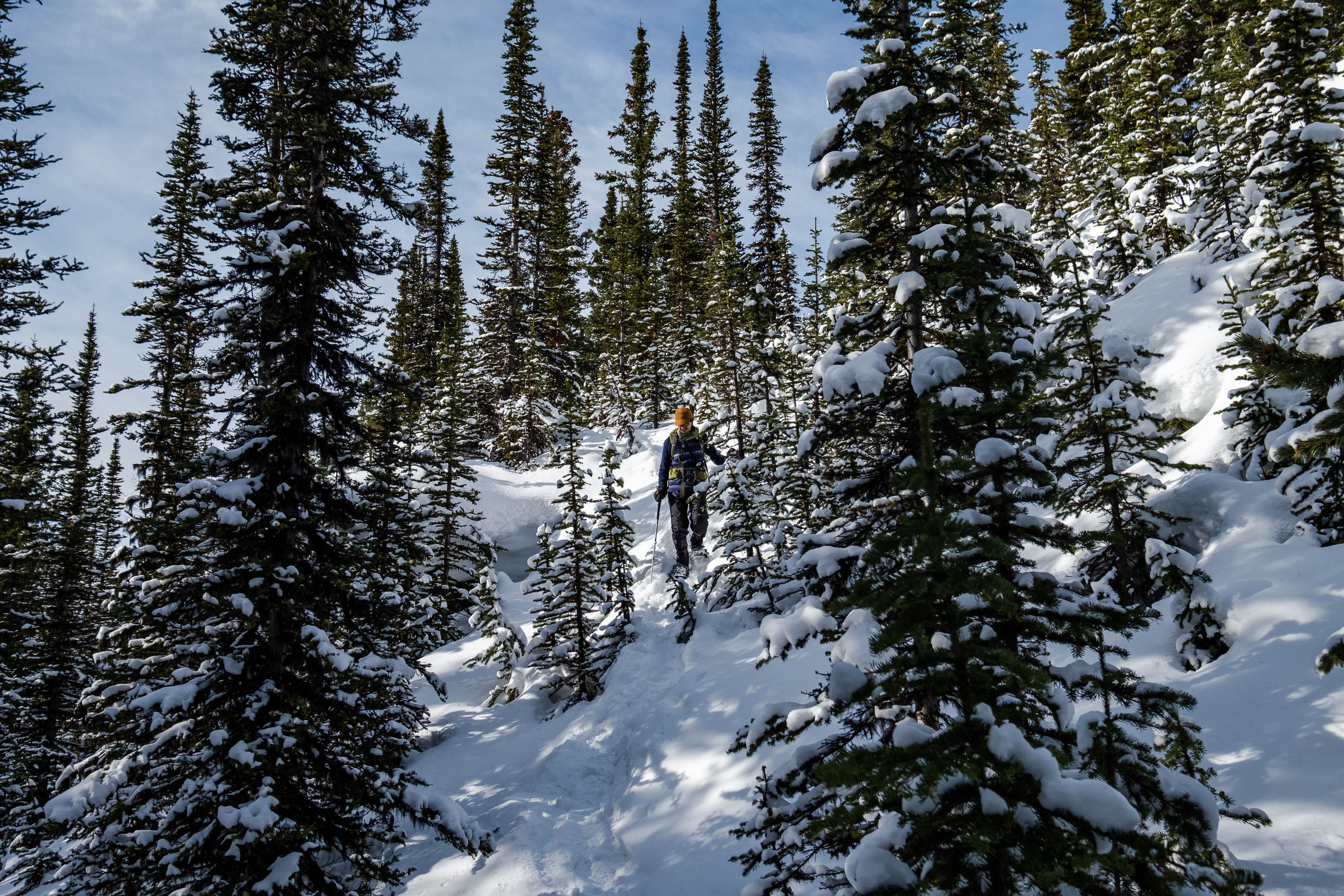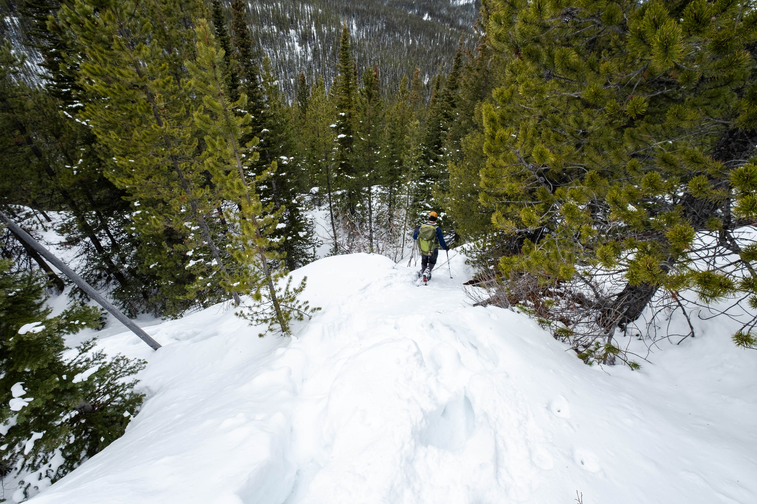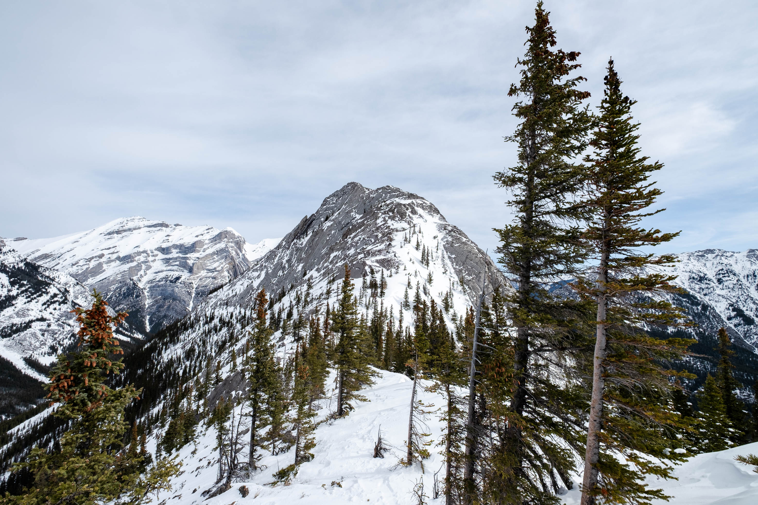 Once on the ridge, the route couldn't be more obvious, and after almost 9.5 km spent in the trees, we finally reached treeline and were granted our first unobstructed view of Spoon Needle's slabby summit ridge! Although somewhat imposing - with its near-vertical west face leading straight to the valley floor - it was a relief to see that the scramble route looked doable even with the fresh snow.