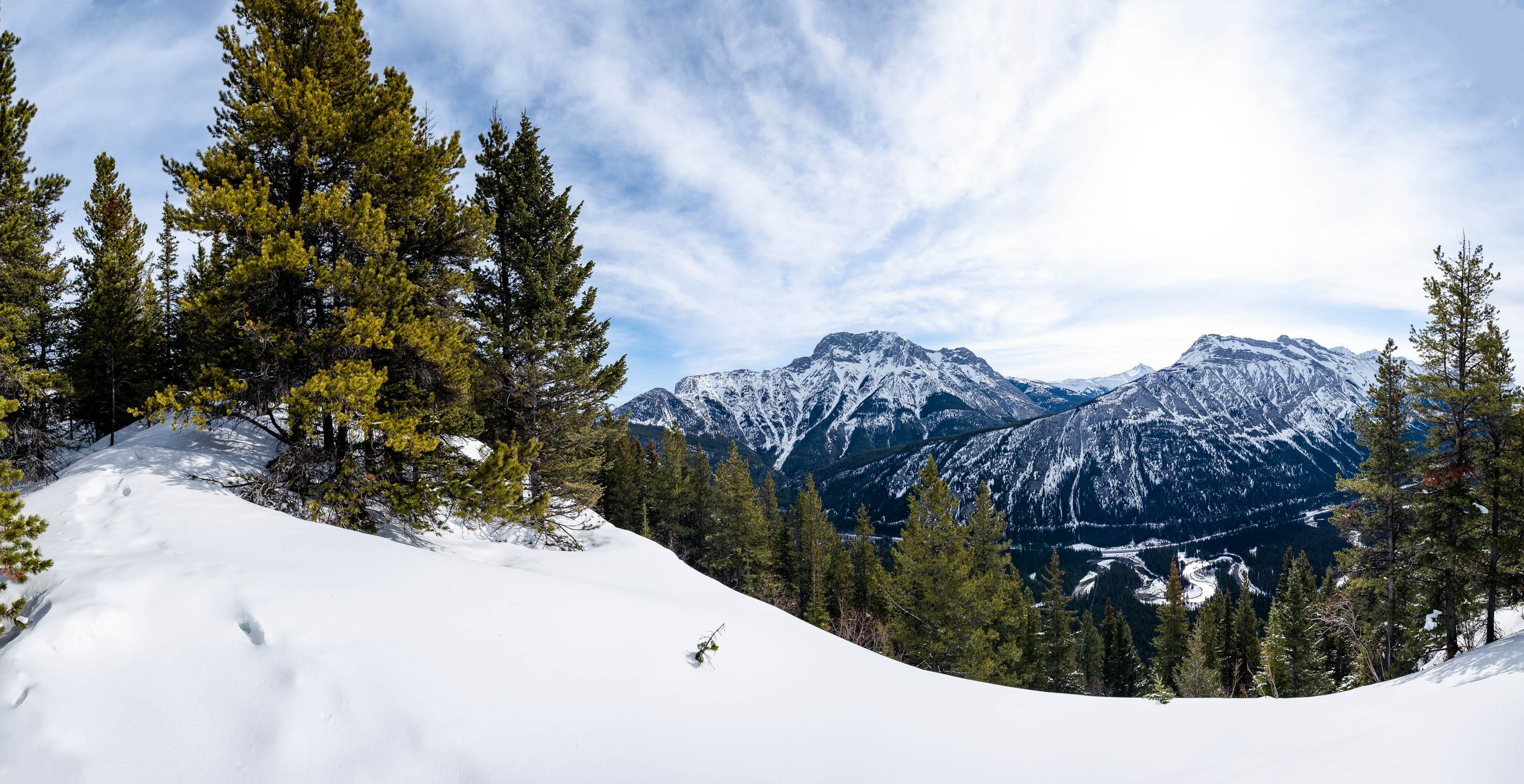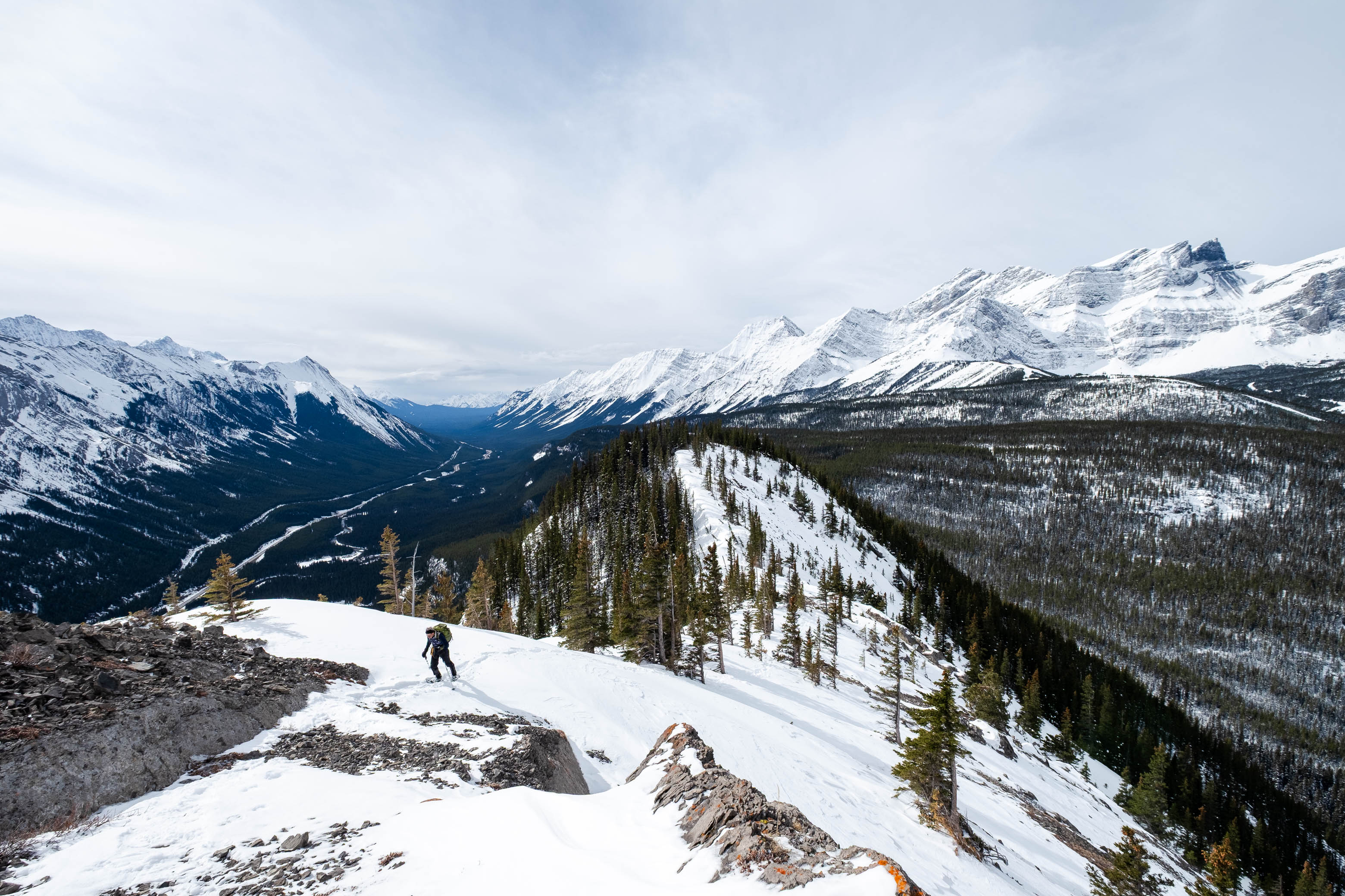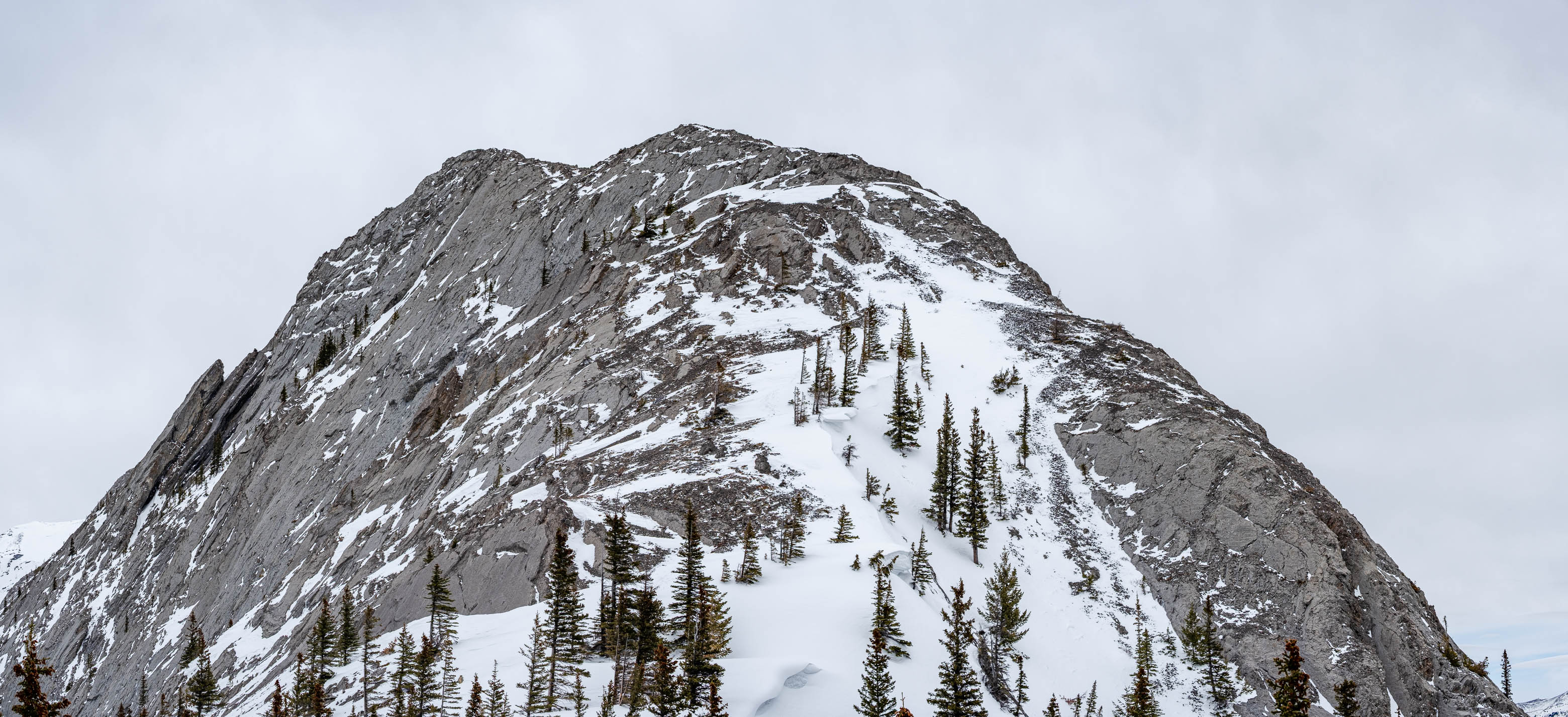 Once on the ridge, the route couldn't be more obvious, and after almost 9.5 km spent in the trees, we finally reached treeline and were granted our first unobstructed view of Spoon Needle's slabby summit ridge! Although somewhat imposing - with its near-vertical west face leading straight to the valley floor - it was a relief to see that the scramble route looked doable even with the fresh snow.