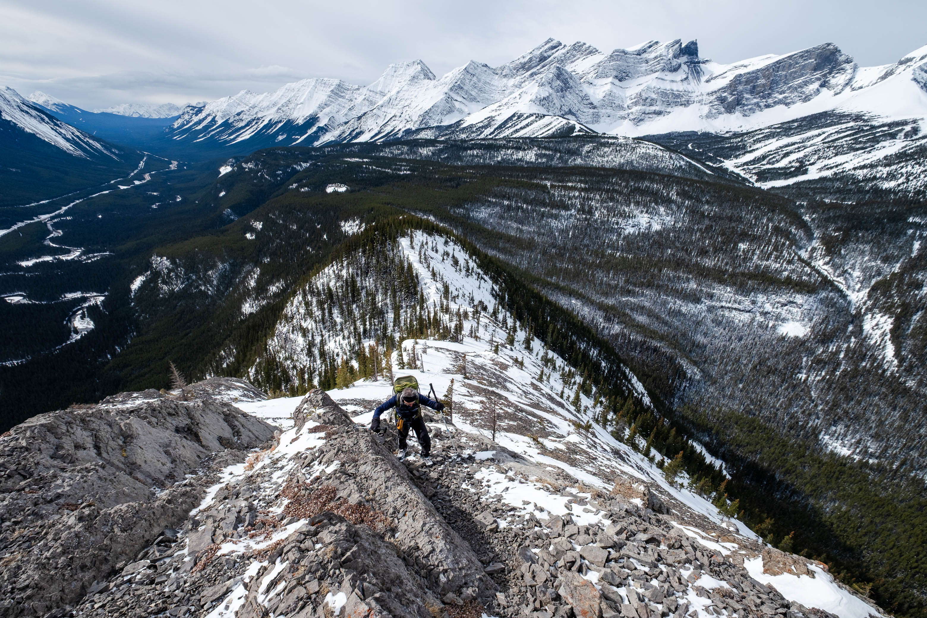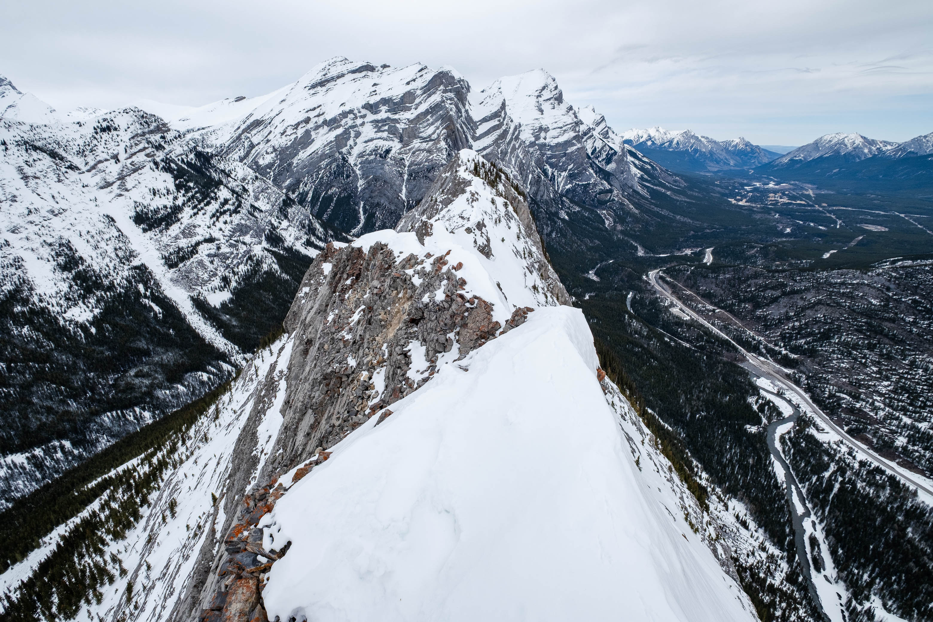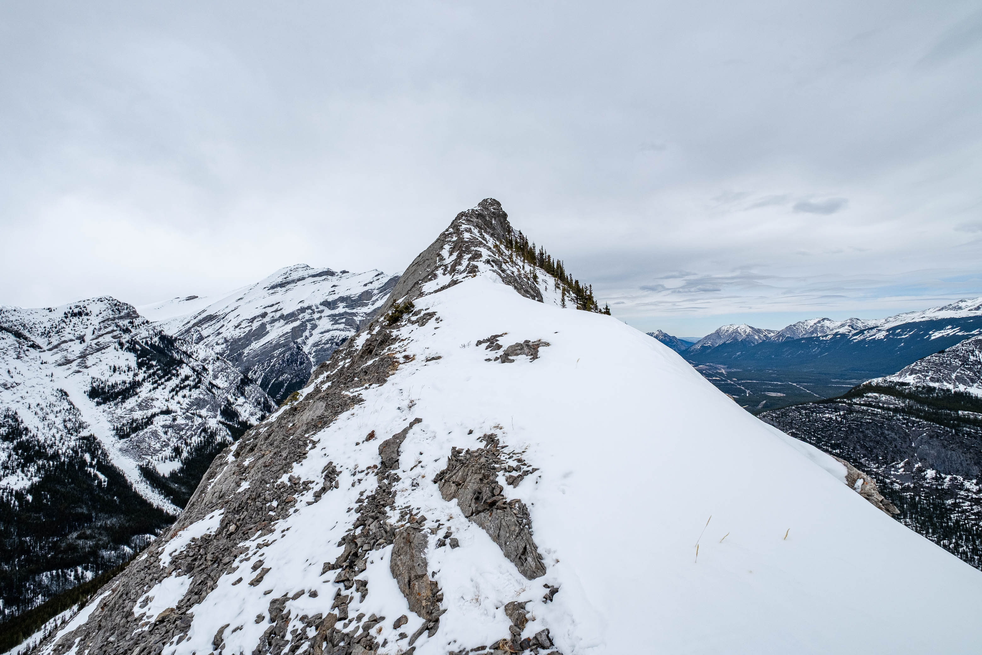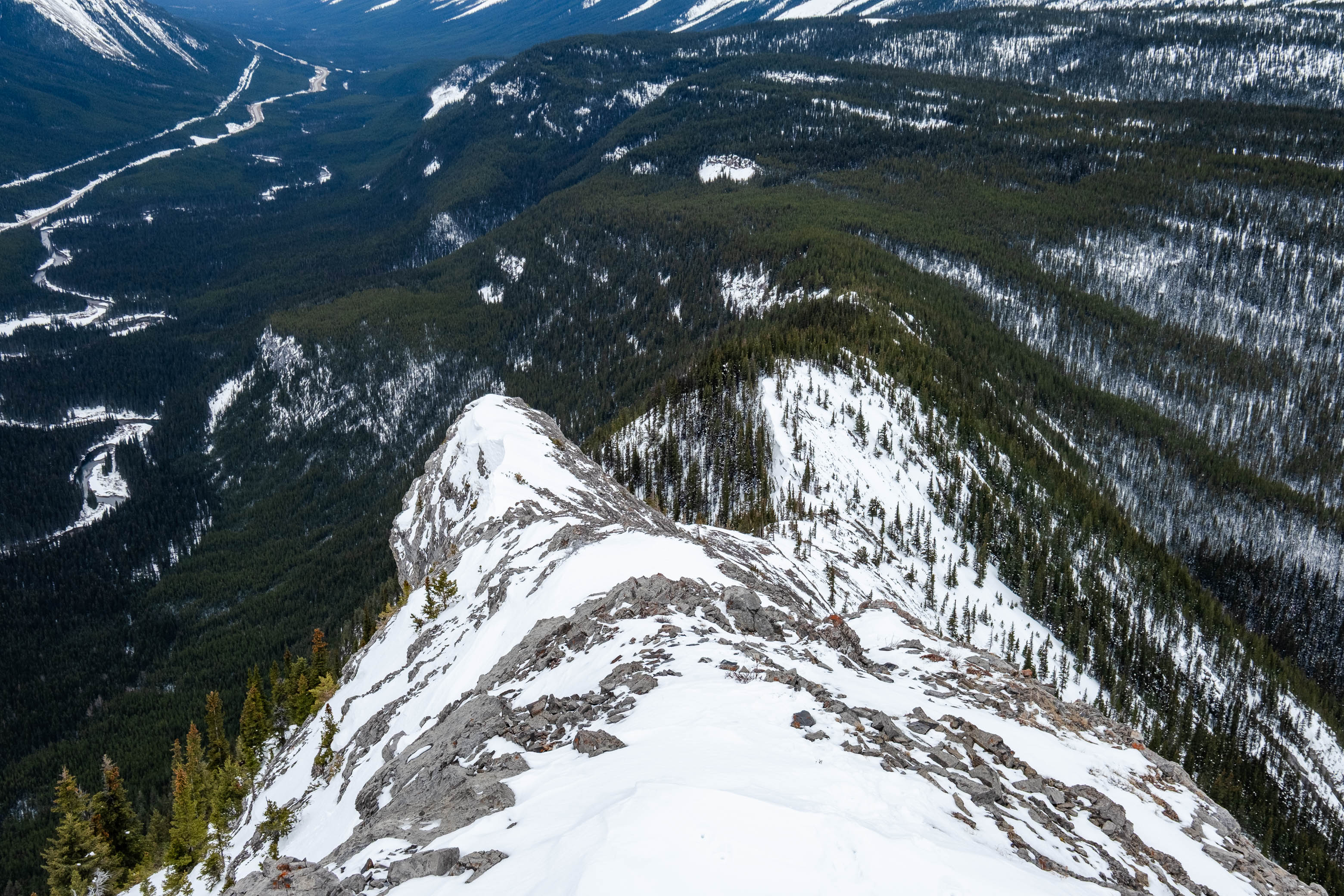 After stashing our snowshoes near the base of the scree slope, we started up the initially broad ridge...While the scrambling is largely quite easy, the ridge does narrow significantly for a couple sections just before the summit, and the exposure is definitely noticeable! A slip on either side would result in a quick trip to the valley floor, and with the fresh dusting of snow, we were sure to choose each step carefully!