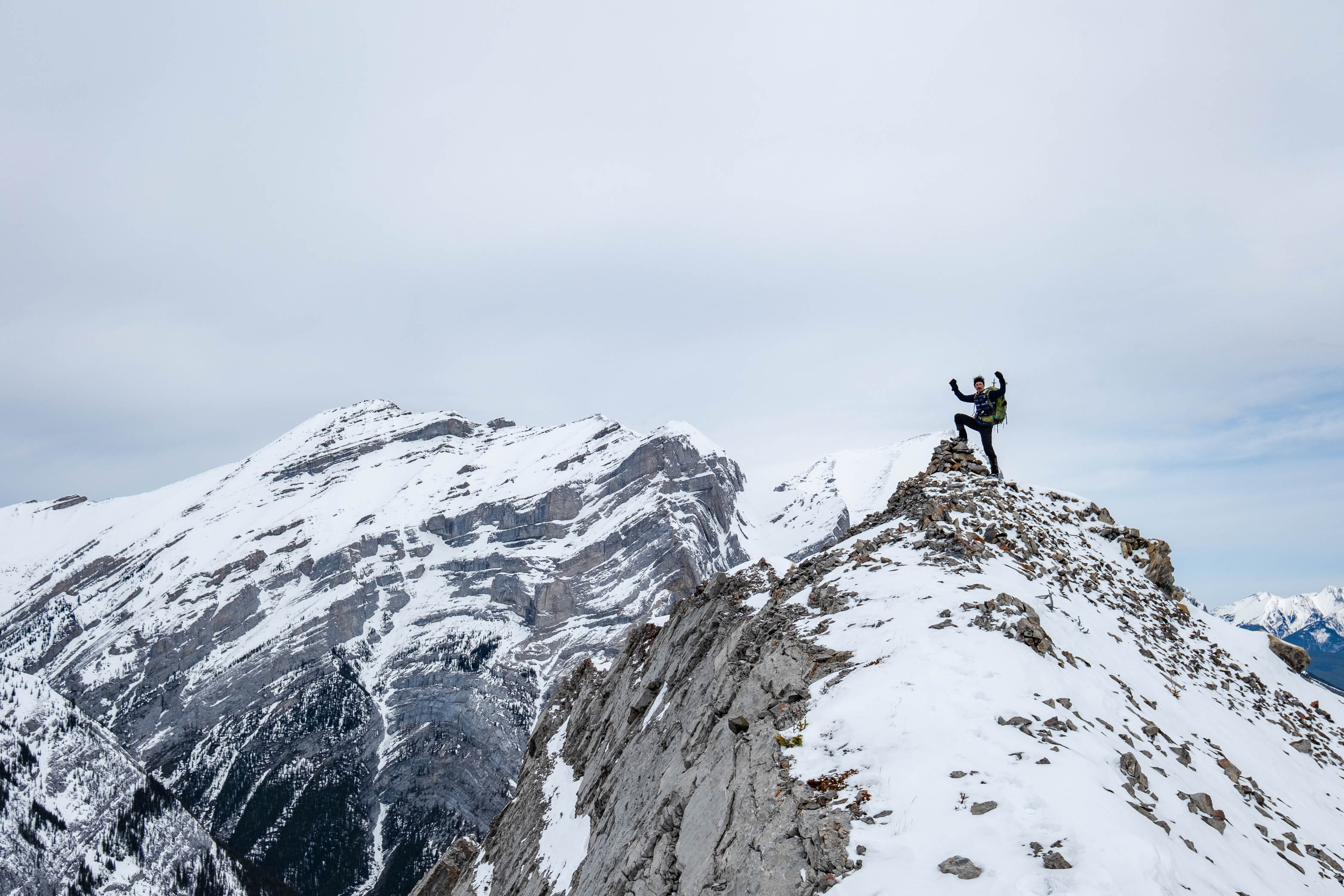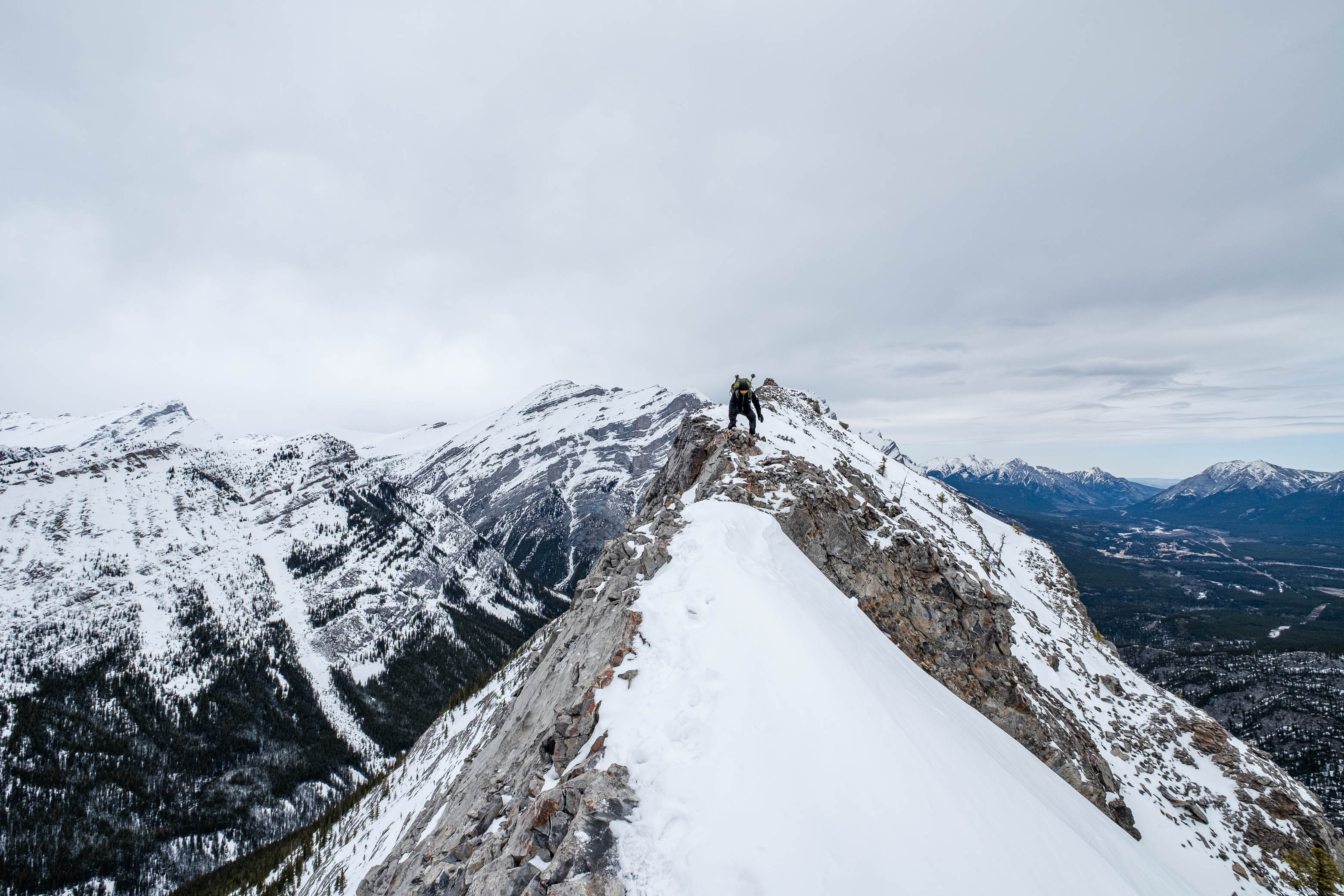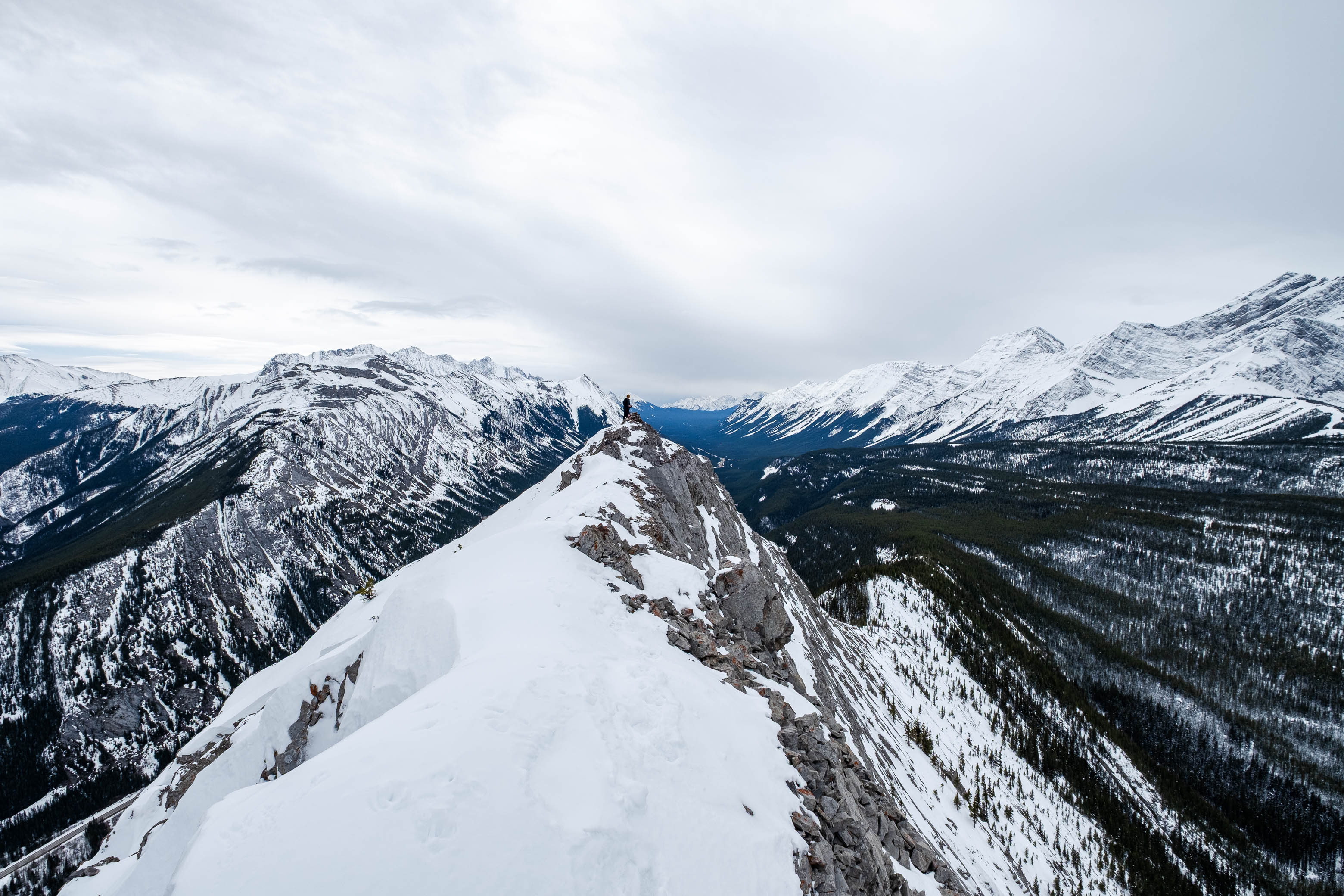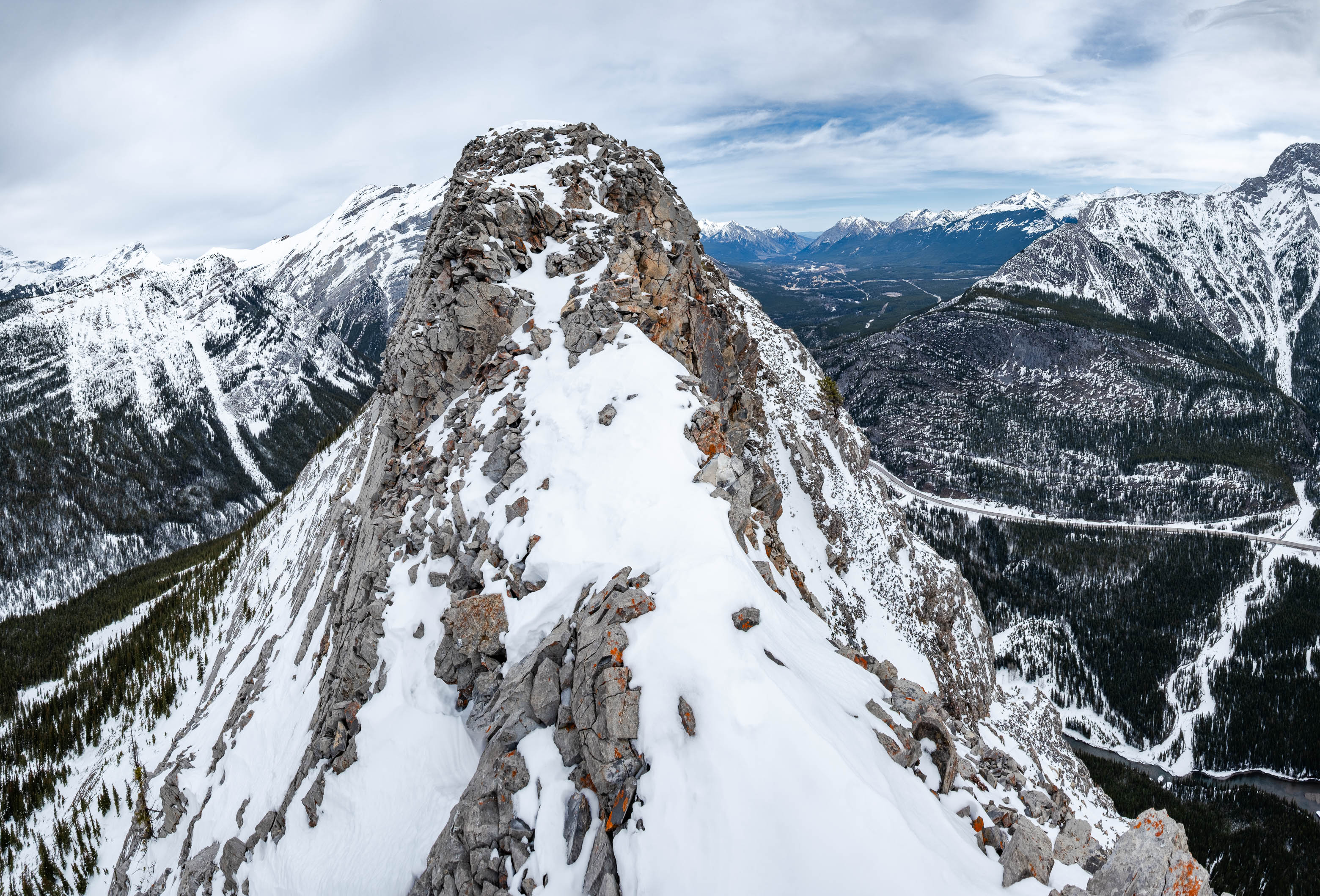 After stashing our snowshoes near the base of the scree slope, we started up the initially broad ridge...While the scrambling is largely quite easy, the ridge does narrow significantly for a couple sections just before the summit, and the exposure is definitely noticeable! A slip on either side would result in a quick trip to the valley floor, and with the fresh dusting of snow, we were sure to choose each step carefully!