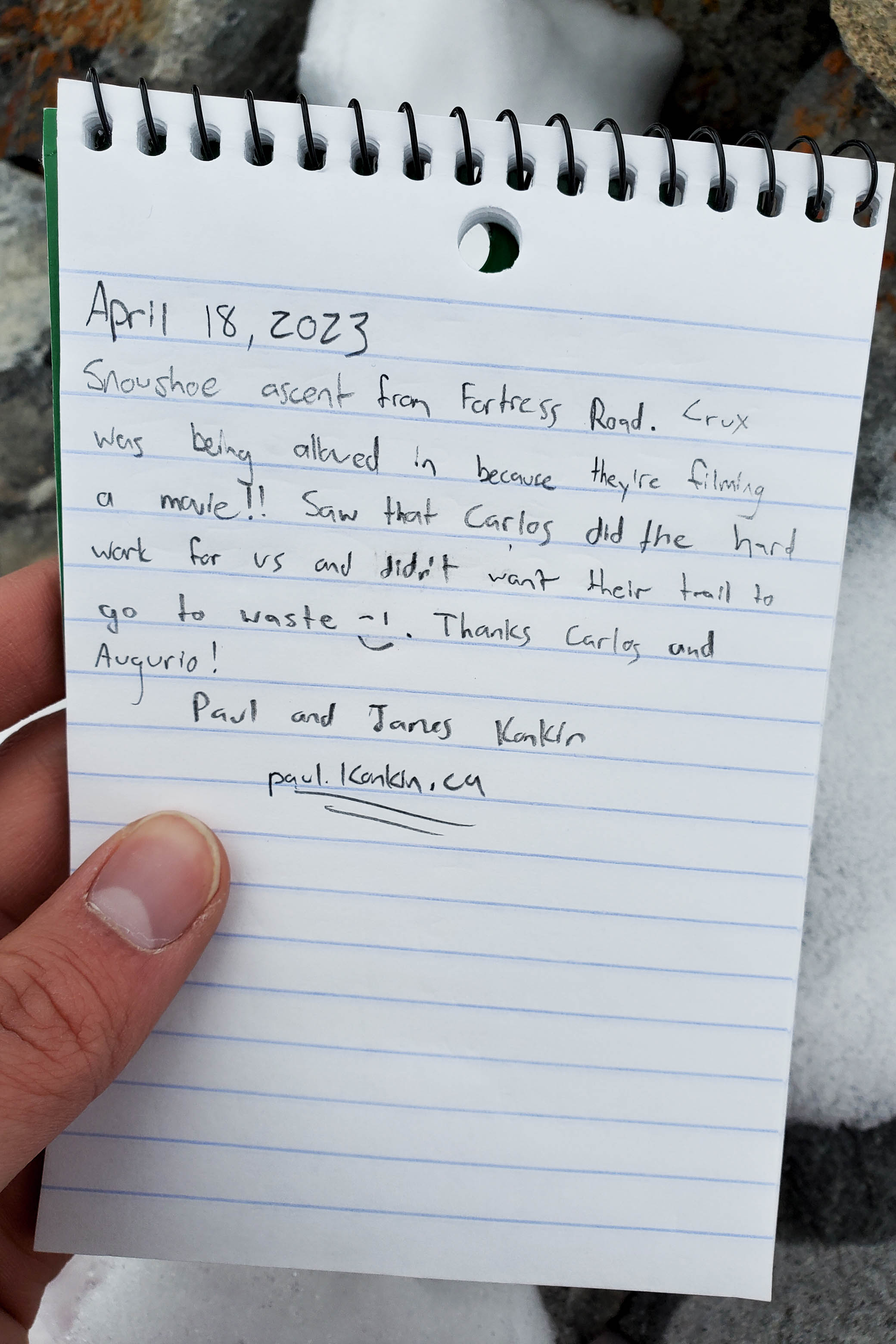 Did we ever get lucky on this one! Being able to sneak through a "restricted" area, having absolutely bomber snowshoeing conditions, and finding a nice little "bread crumb" trail leading exactly where we needed to go - you'd be hard-pressed to find better conditions to approach this mountain in! While I'd have a hard time recommending this mountain for anyone other than a serious peakbagger, if you persevere for almost 10 uneventful kilometers, you'll be rewarded with a fun 100 m scramble, some unique views down Kananaskis Valley, and have bagged an interesting peak with a relatively sparse summit register.