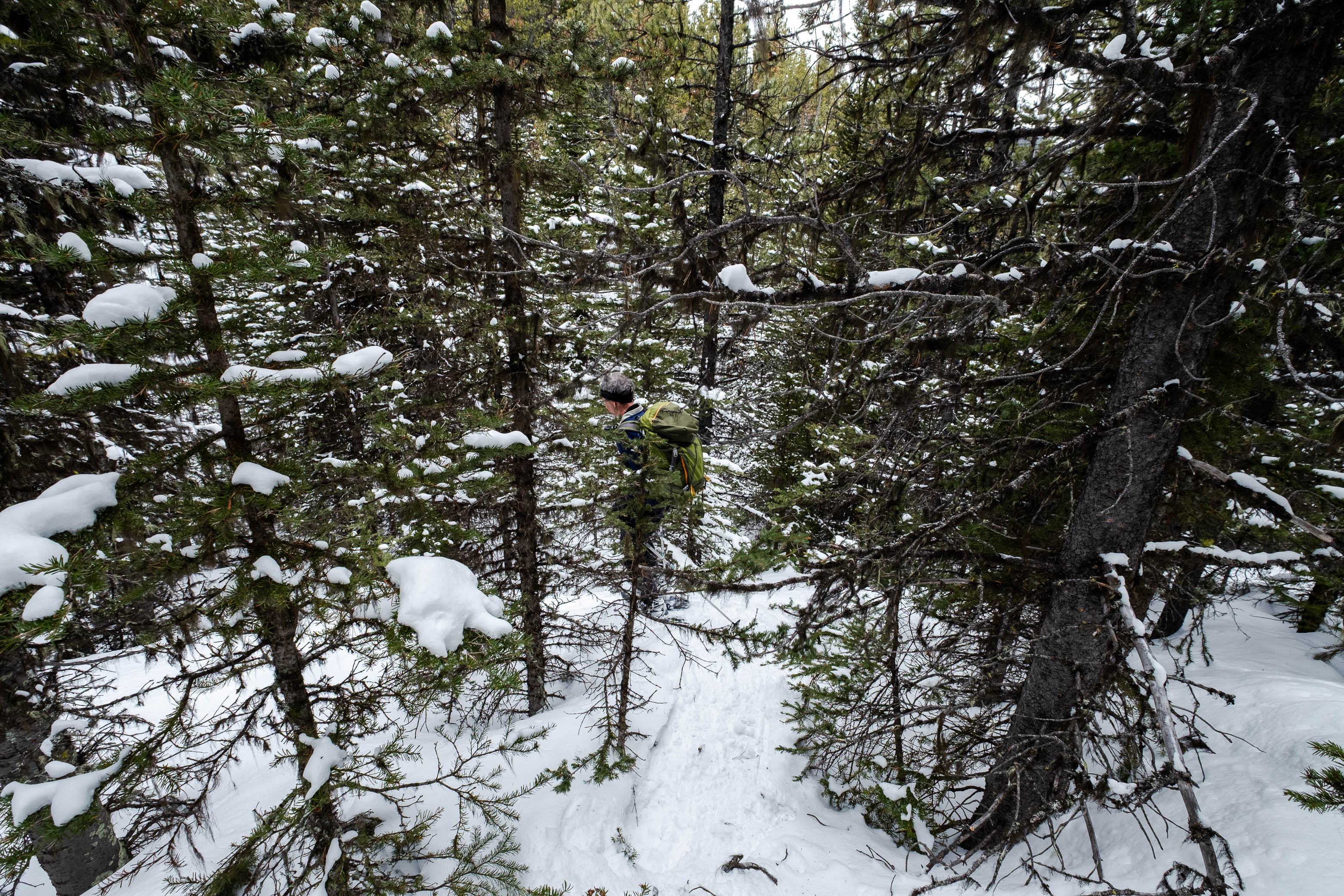 Still seeing no signs of Carlos' trail, we started through the initially generously spaced trees in a NE direction, knowing we'd have to lose some elevation and bushwhack for a few kilometers before reaching the base of Spoon Needle's south ridge. As we broke new trail through a fresh layer of snow, I continued to scan the forest floor for old tracks, and just as I was beginning to lose hope - accepting that the trail Carlos conveniently made just a few days prior had inconveniently been erased by a recent storm - I spotted an unmistakable set of indents in the snow ahead of us!