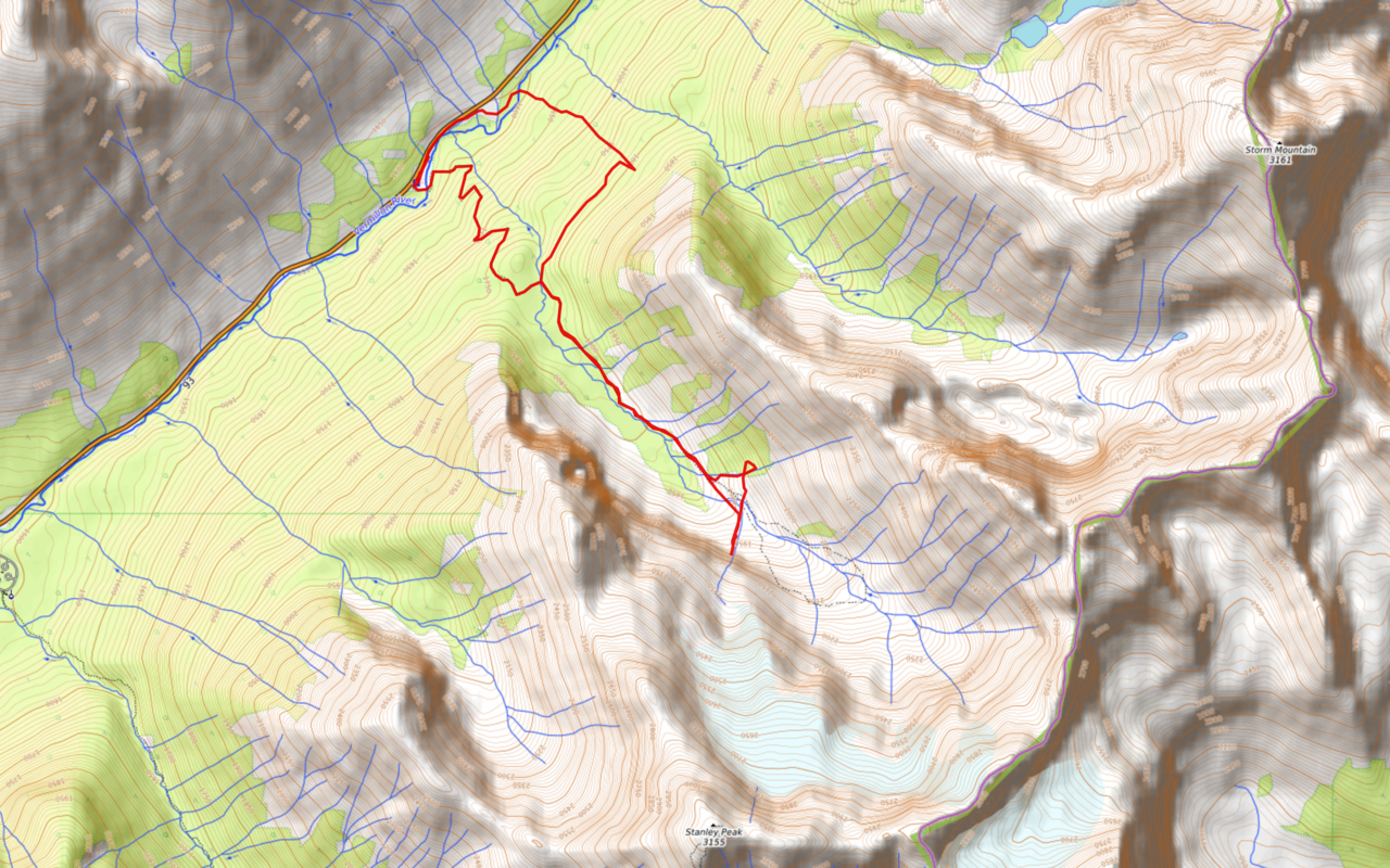 The slope eases off, and it's mainly flat all the way to the clearing below Stanley Glacier.