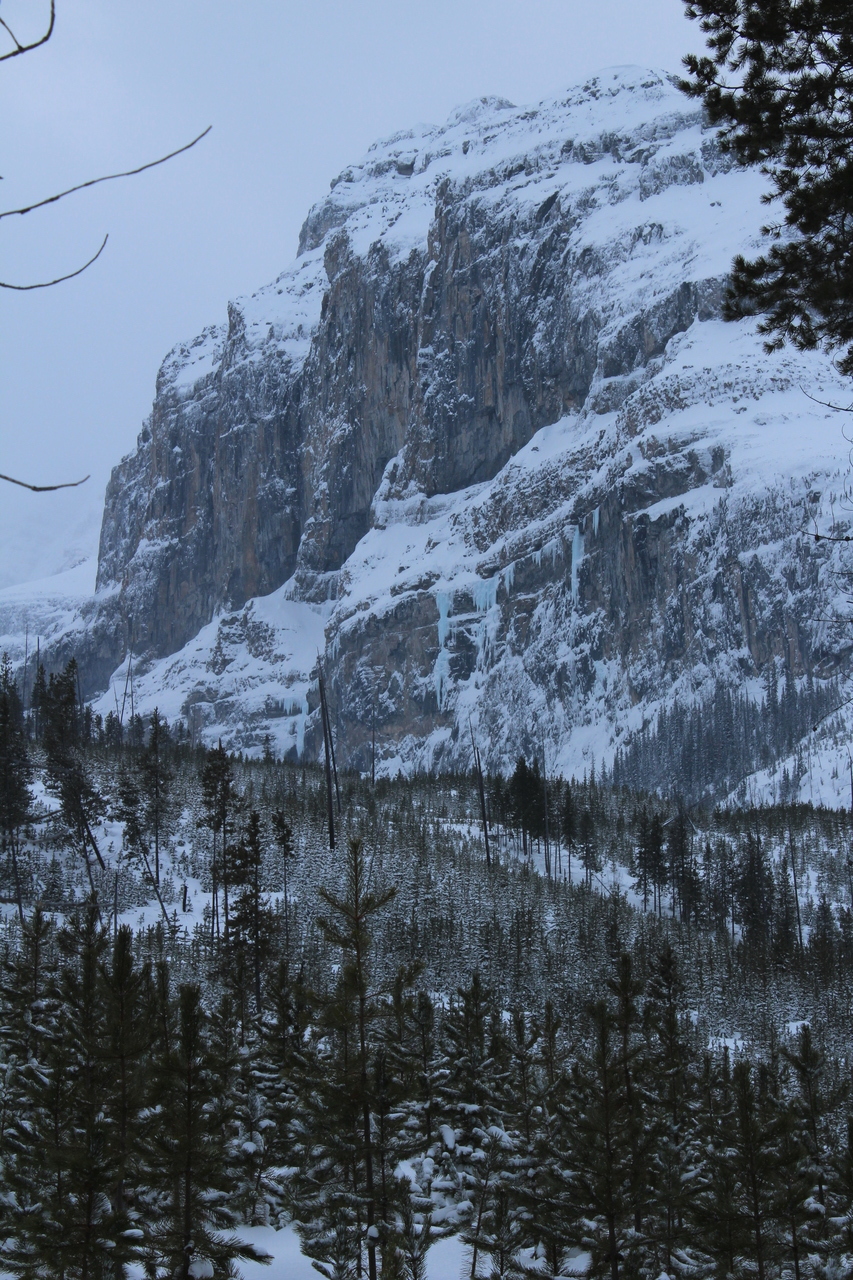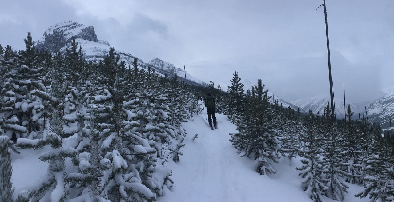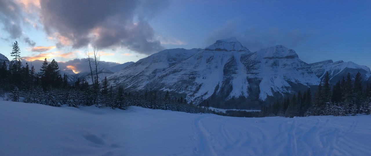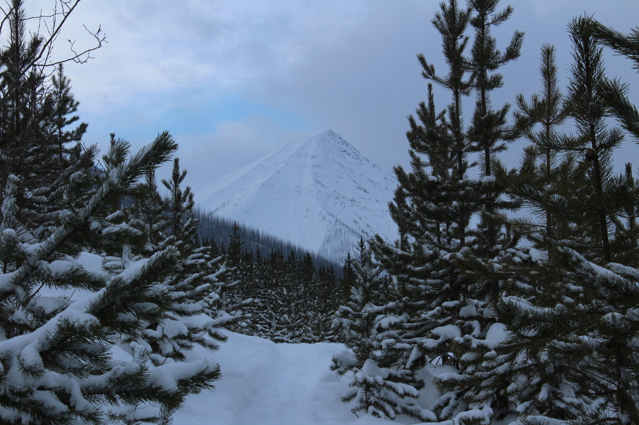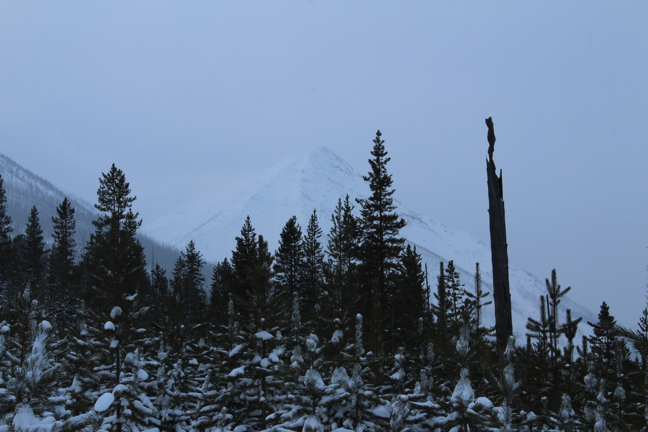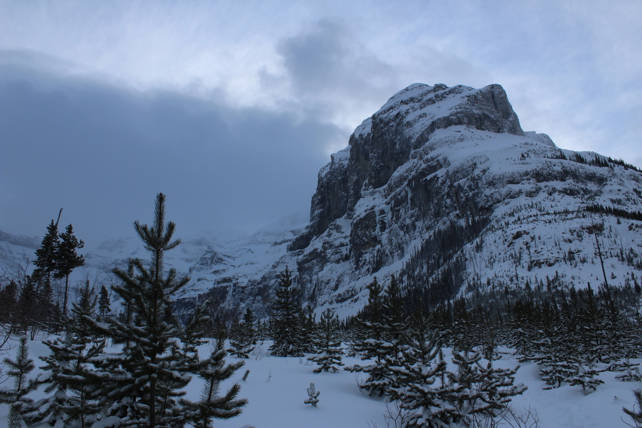 Mount Whymper rises into the clouds, across the highway! After parking at the Stanley Glacier parking lot, we originally began skinning along the highway to the east, hoping to join up with the bottom of our "ski run"...After about a couple hundred meters however, we realized that we'd have to cross the Vermilion River, and I doubt there's a bridge leading to some random "ski run"...As such, we turned around, back to the parking lot, and followed (the more popular) Stanley Glacier trail, which does in fact have a bridge!