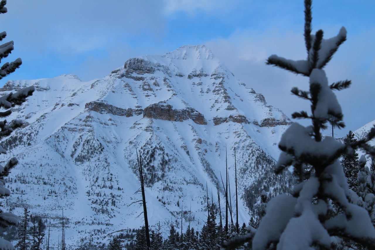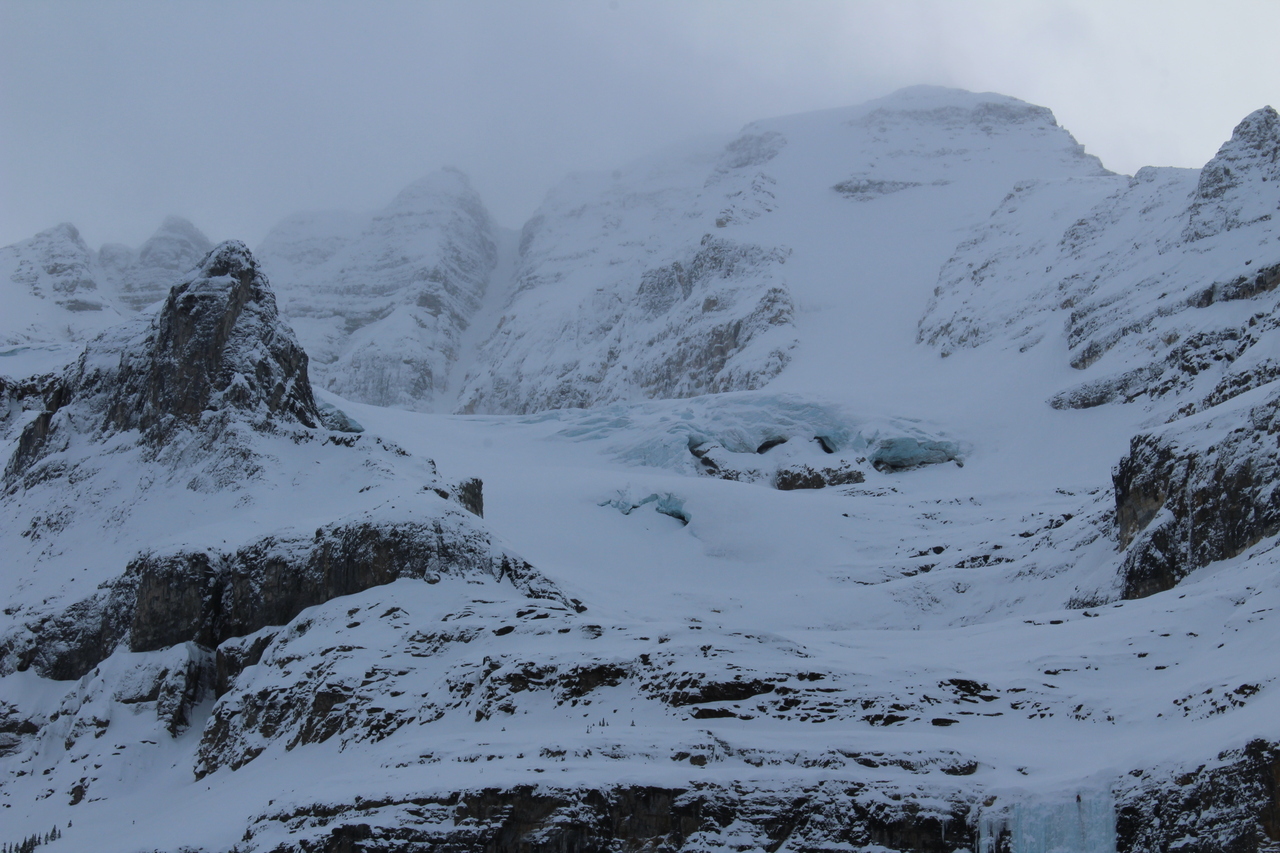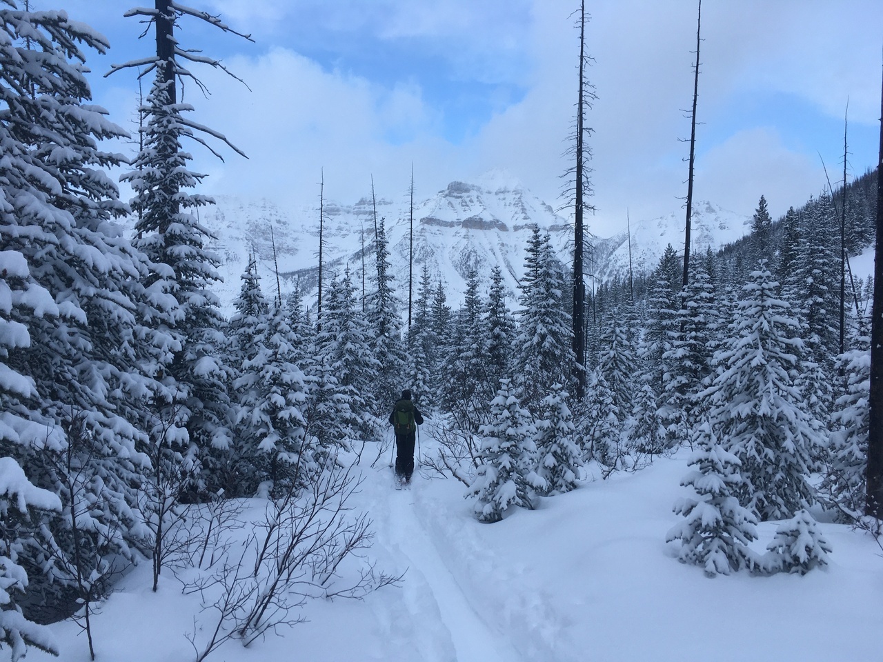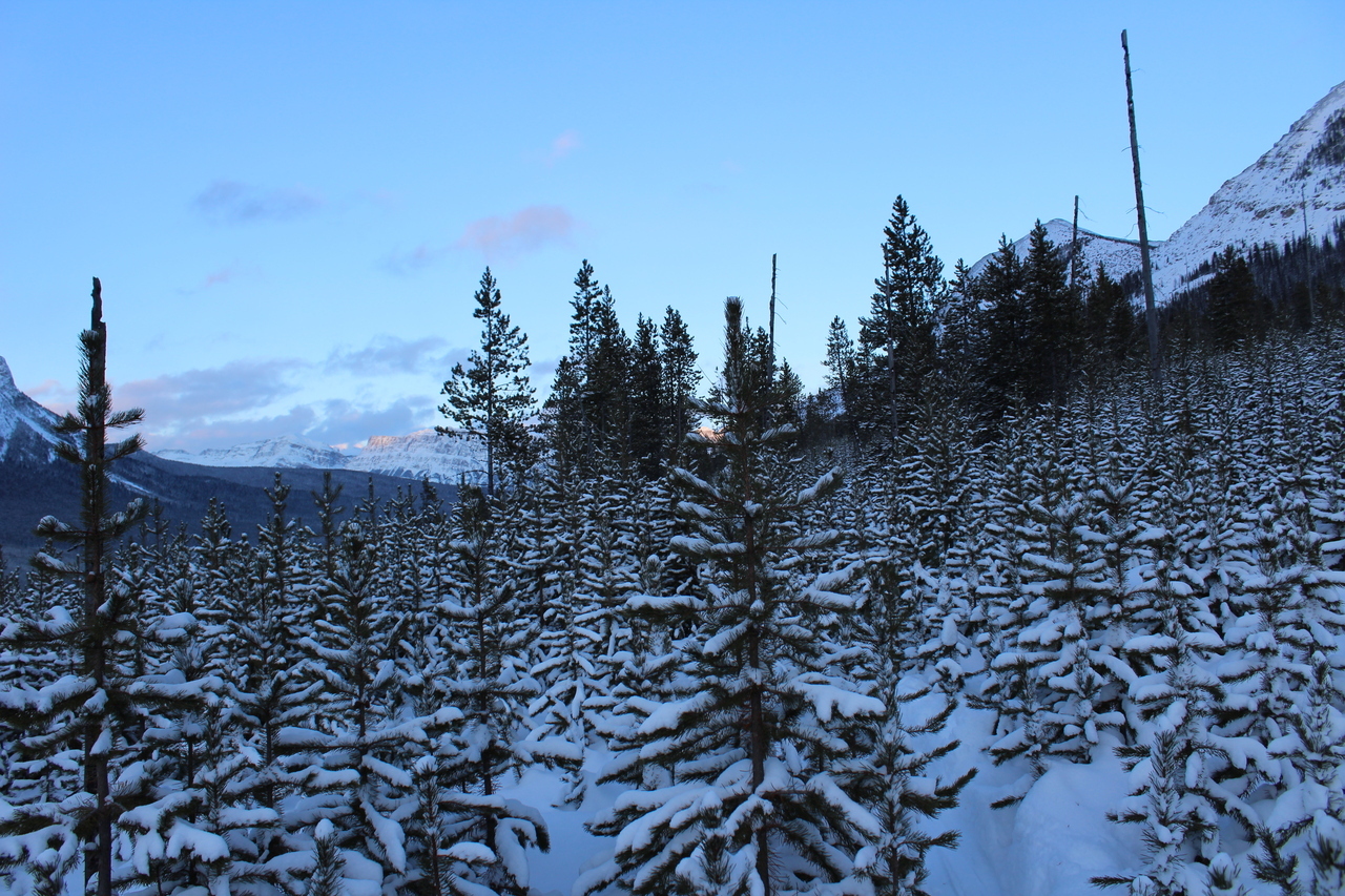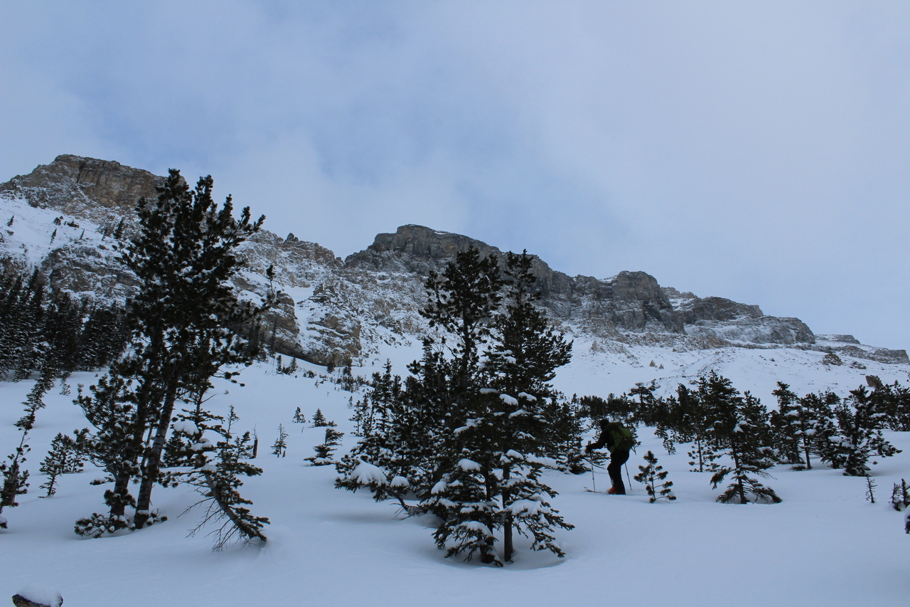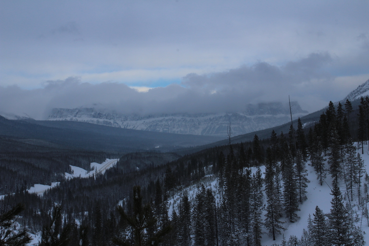 Mount Whymper rises into the clouds, across the highway! After parking at the Stanley Glacier parking lot, we originally began skinning along the highway to the east, hoping to join up with the bottom of our "ski run"...After about a couple hundred meters however, we realized that we'd have to cross the Vermilion River, and I doubt there's a bridge leading to some random "ski run"...As such, we turned around, back to the parking lot, and followed (the more popular) Stanley Glacier trail, which does in fact have a bridge!