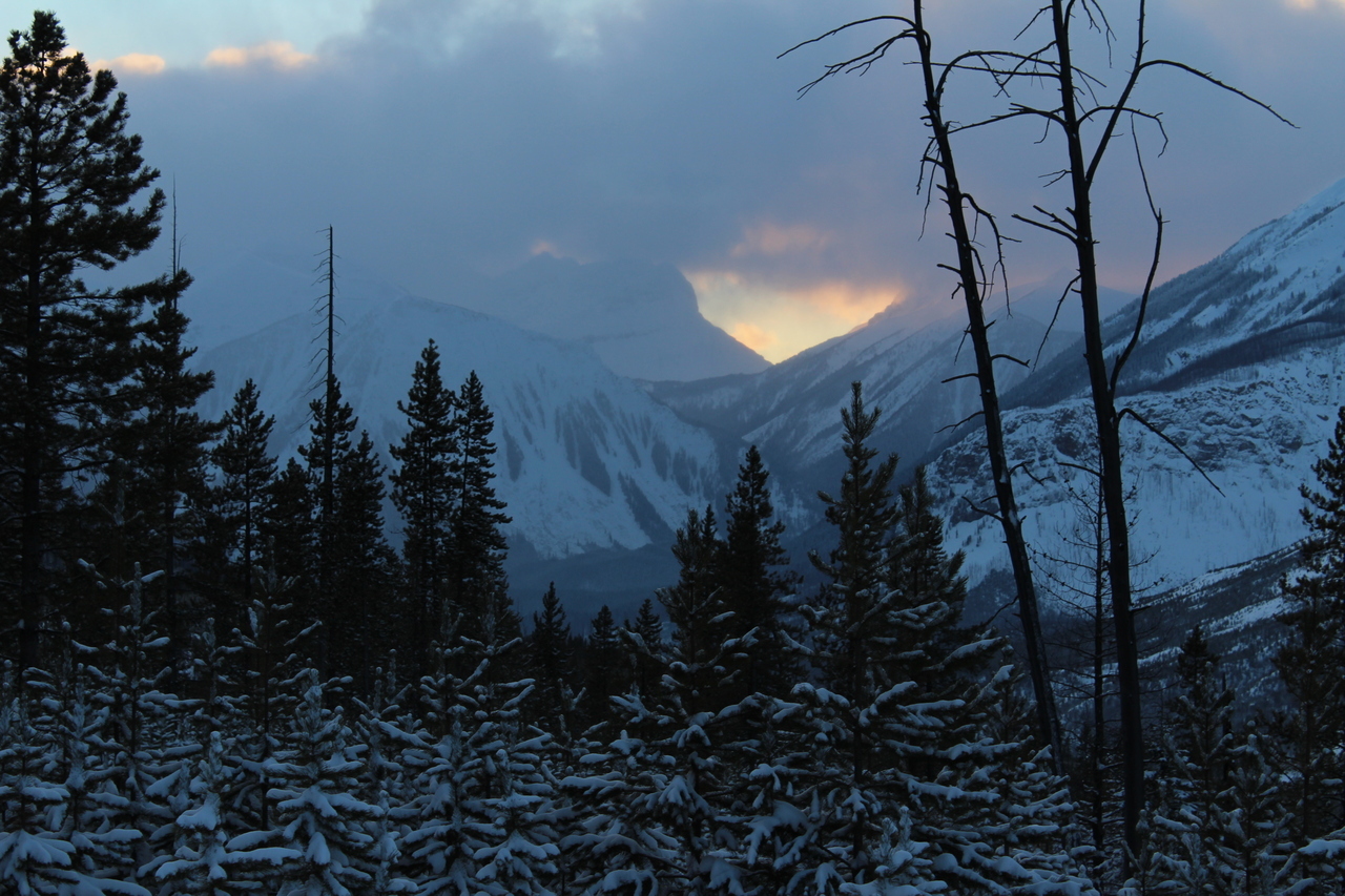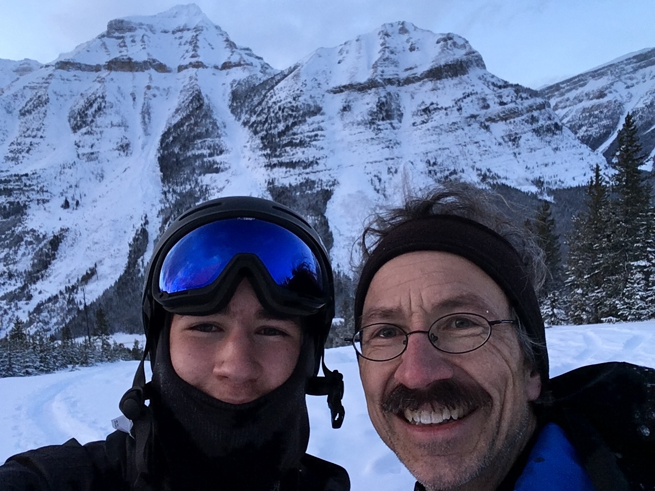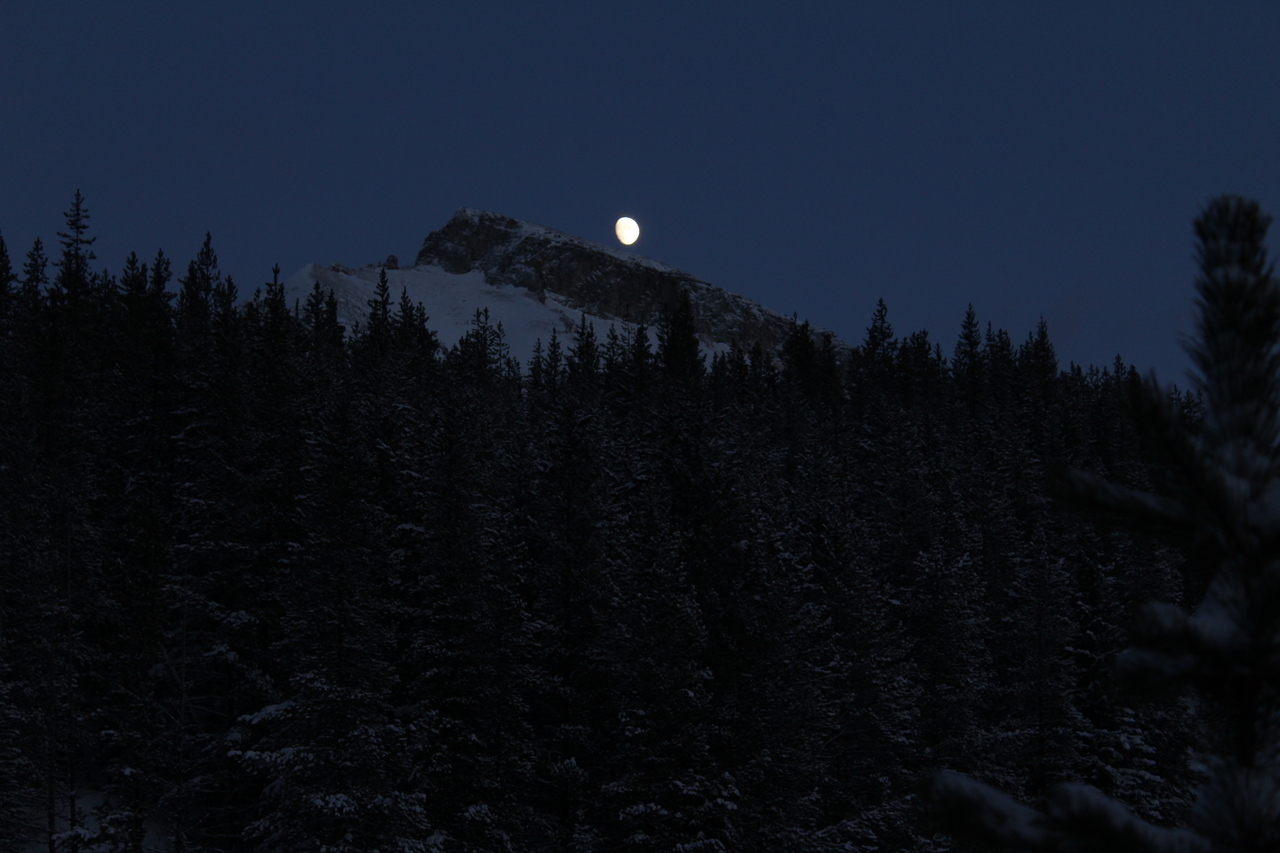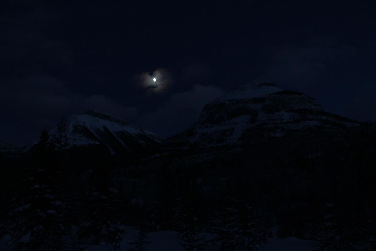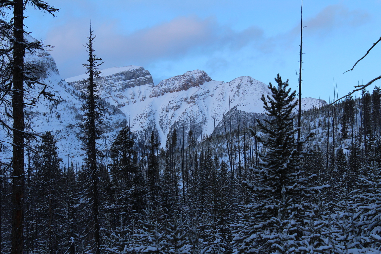 Mount Whymper rises into the clouds, across the highway! After parking at the Stanley Glacier parking lot, we originally began skinning along the highway to the east, hoping to join up with the bottom of our "ski run"...After about a couple hundred meters however, we realized that we'd have to cross the Vermilion River, and I doubt there's a bridge leading to some random "ski run"...As such, we turned around, back to the parking lot, and followed (the more popular) Stanley Glacier trail, which does in fact have a bridge!