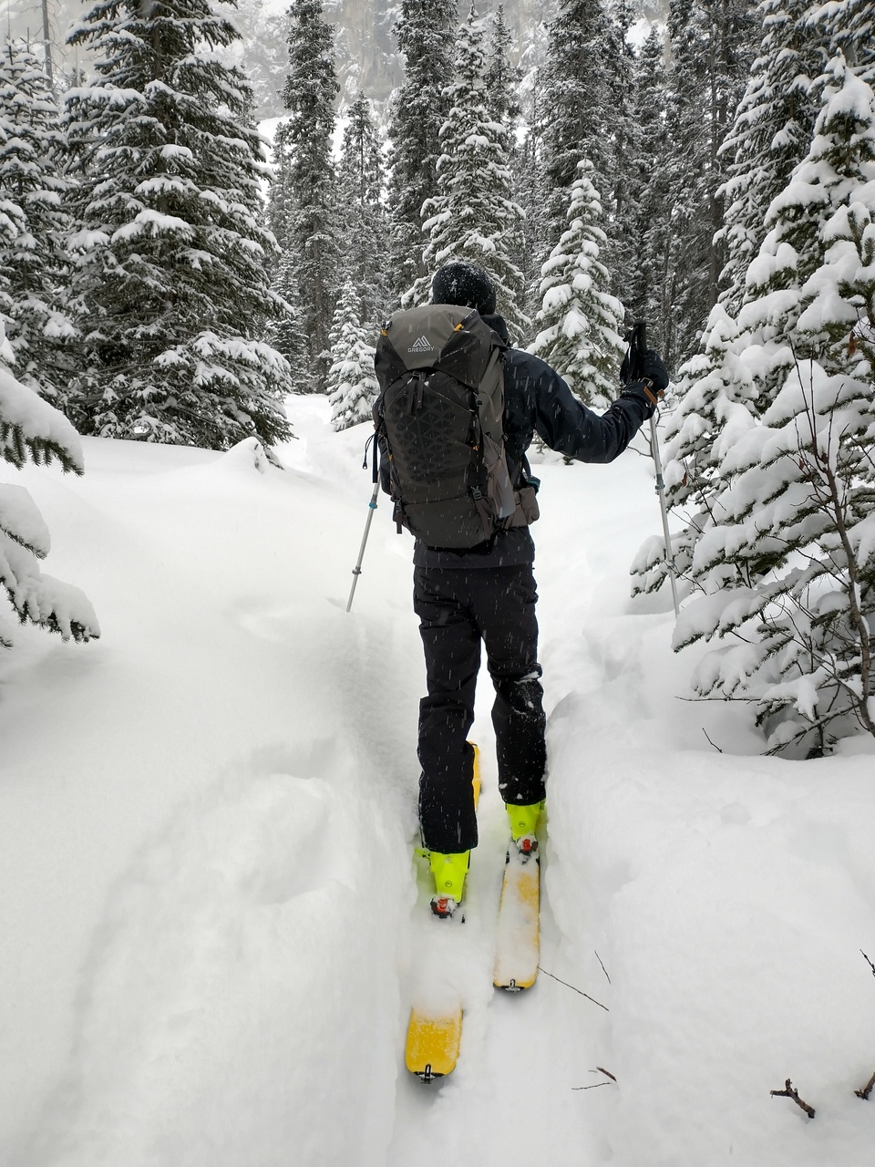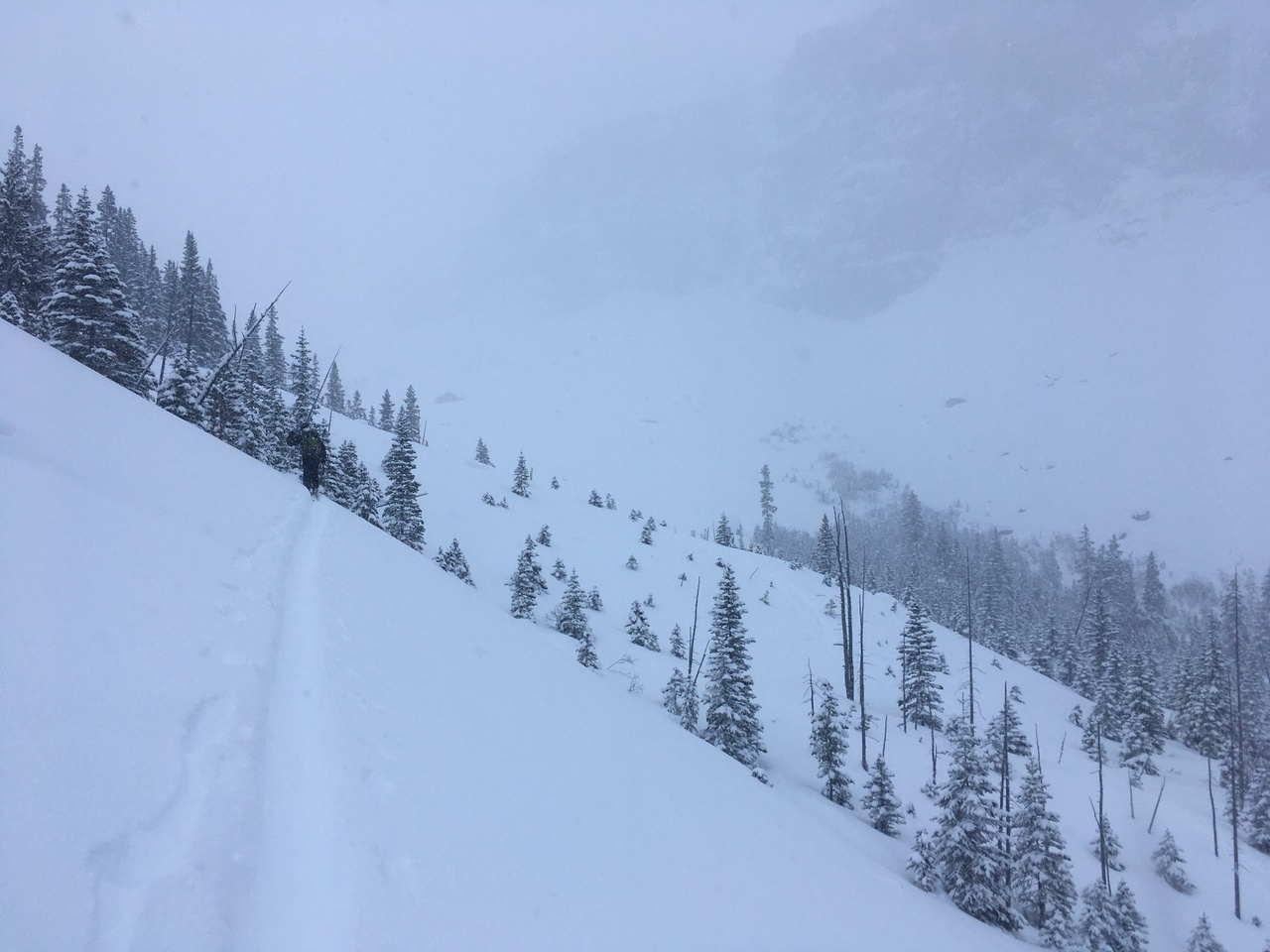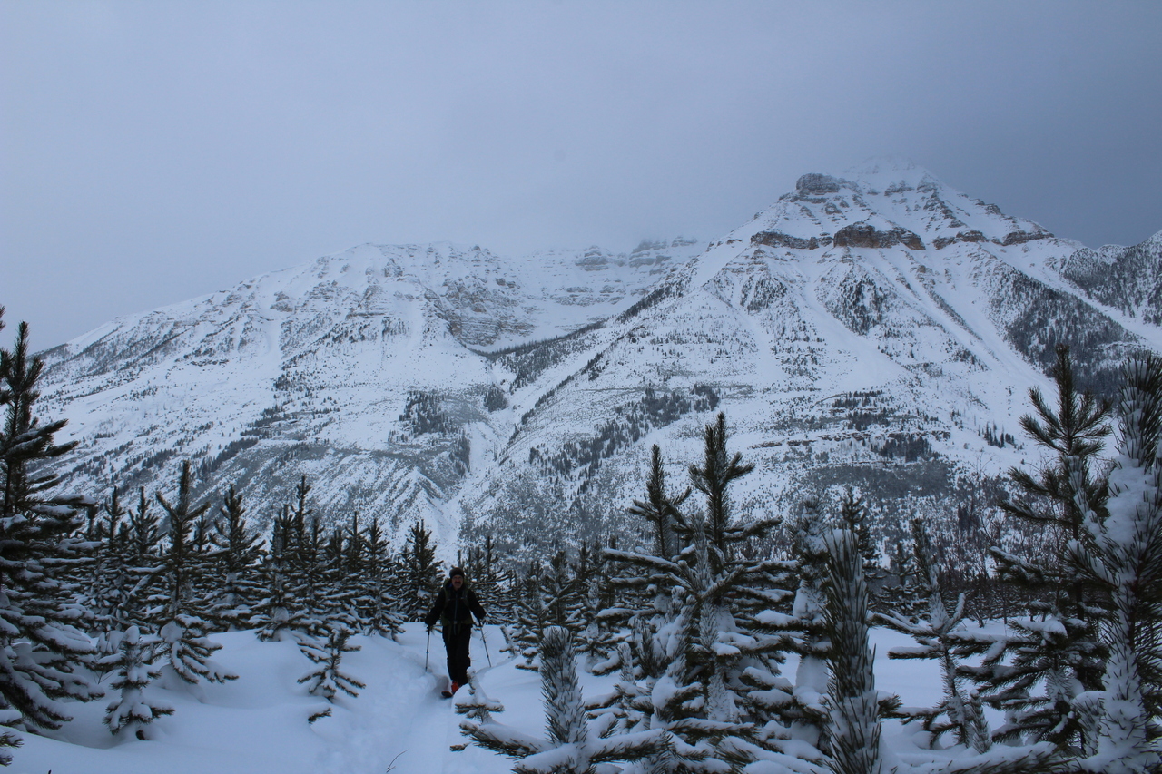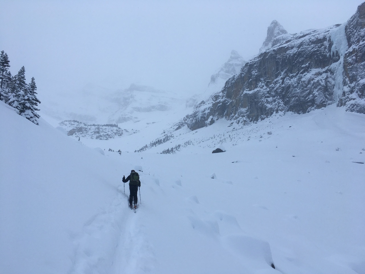 We followed some skin tracks gaining elevation on the left side of the valley, to avoid some dense bush. Snow started pelleting down at this point (kind of like little styrofoam balls), and we were caught in a whiteout.