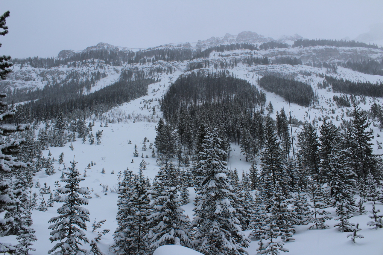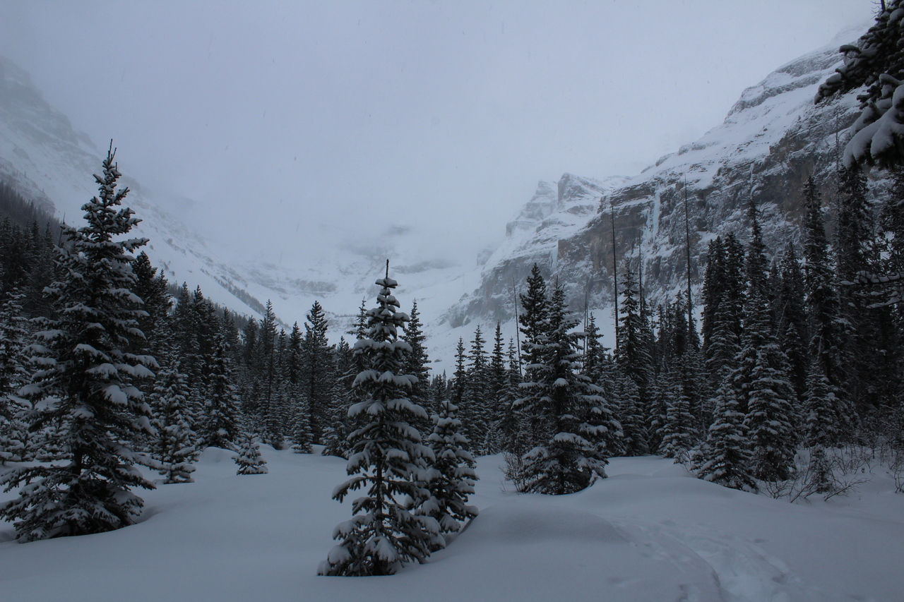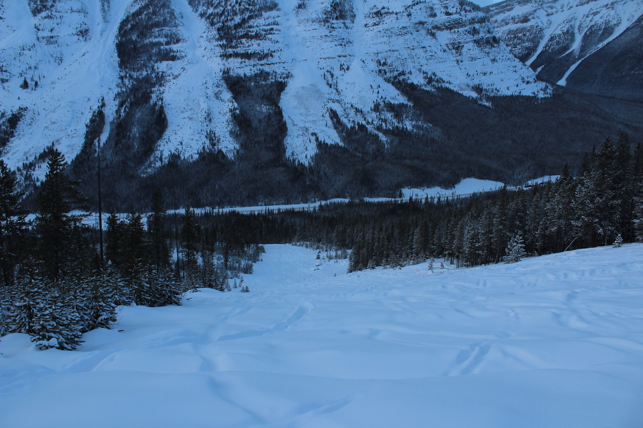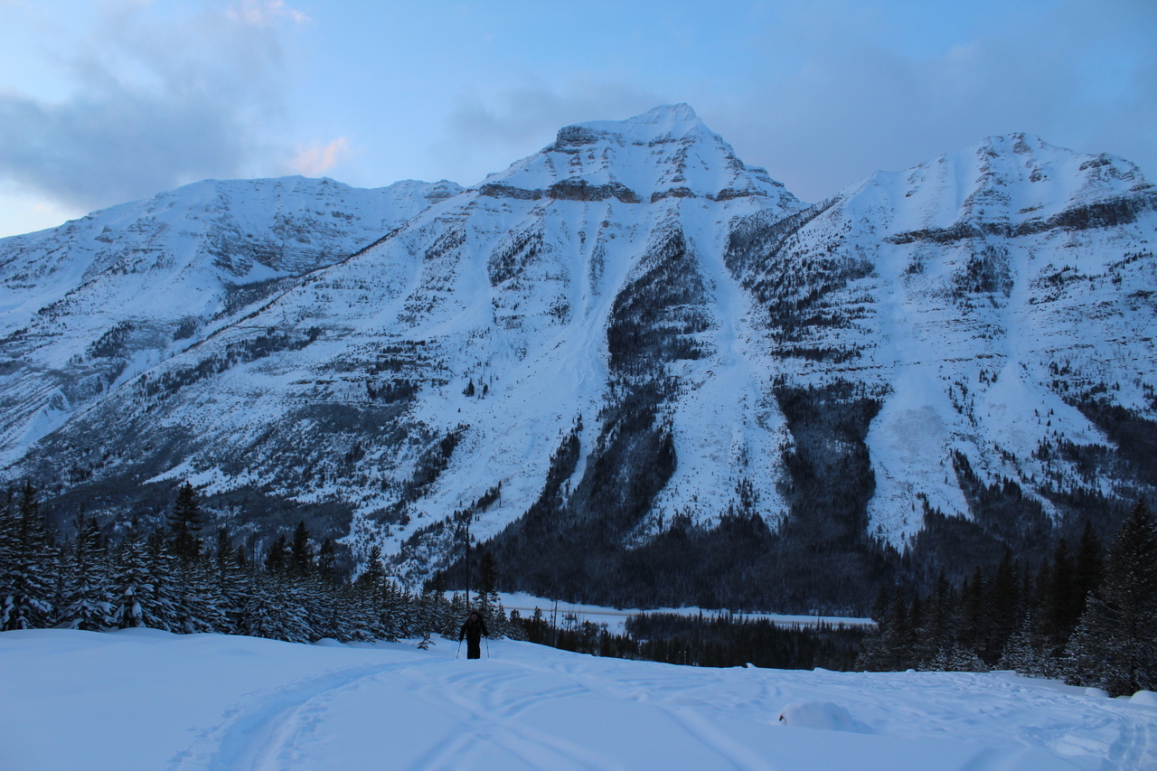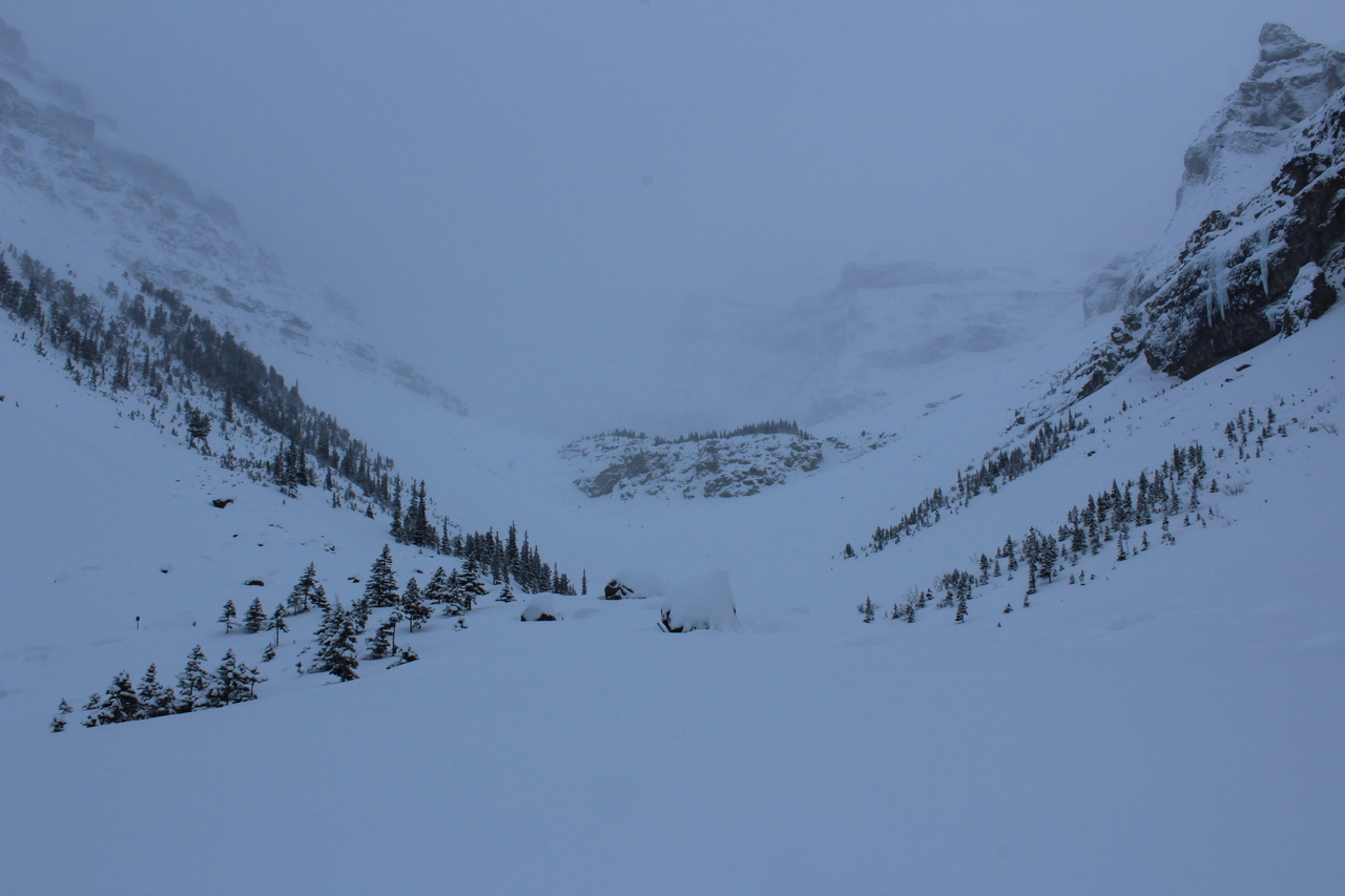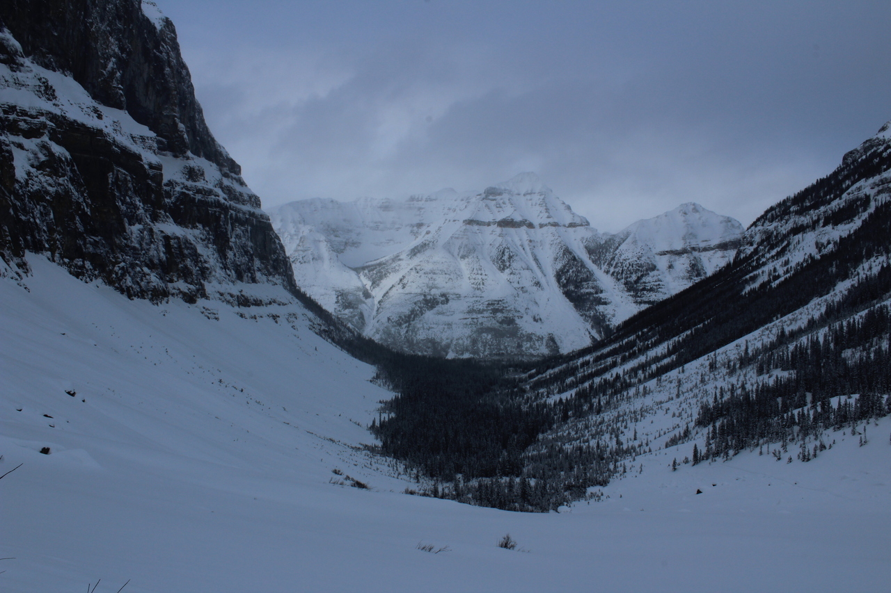 The trail would continue to the treed outcropping (center) in summer, but with avalanche risk from the slopes on either side, we decided it would be best not to venture deeper into the valley.