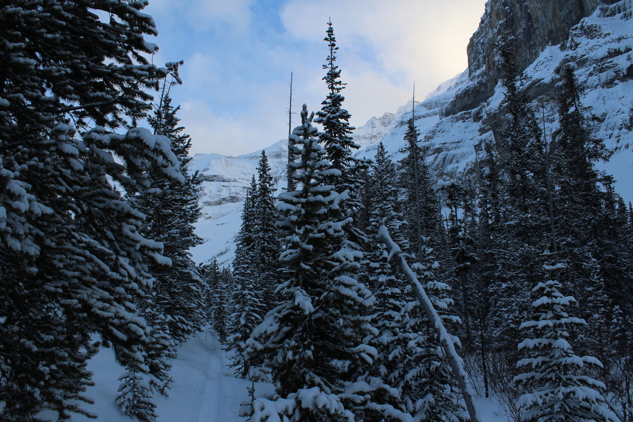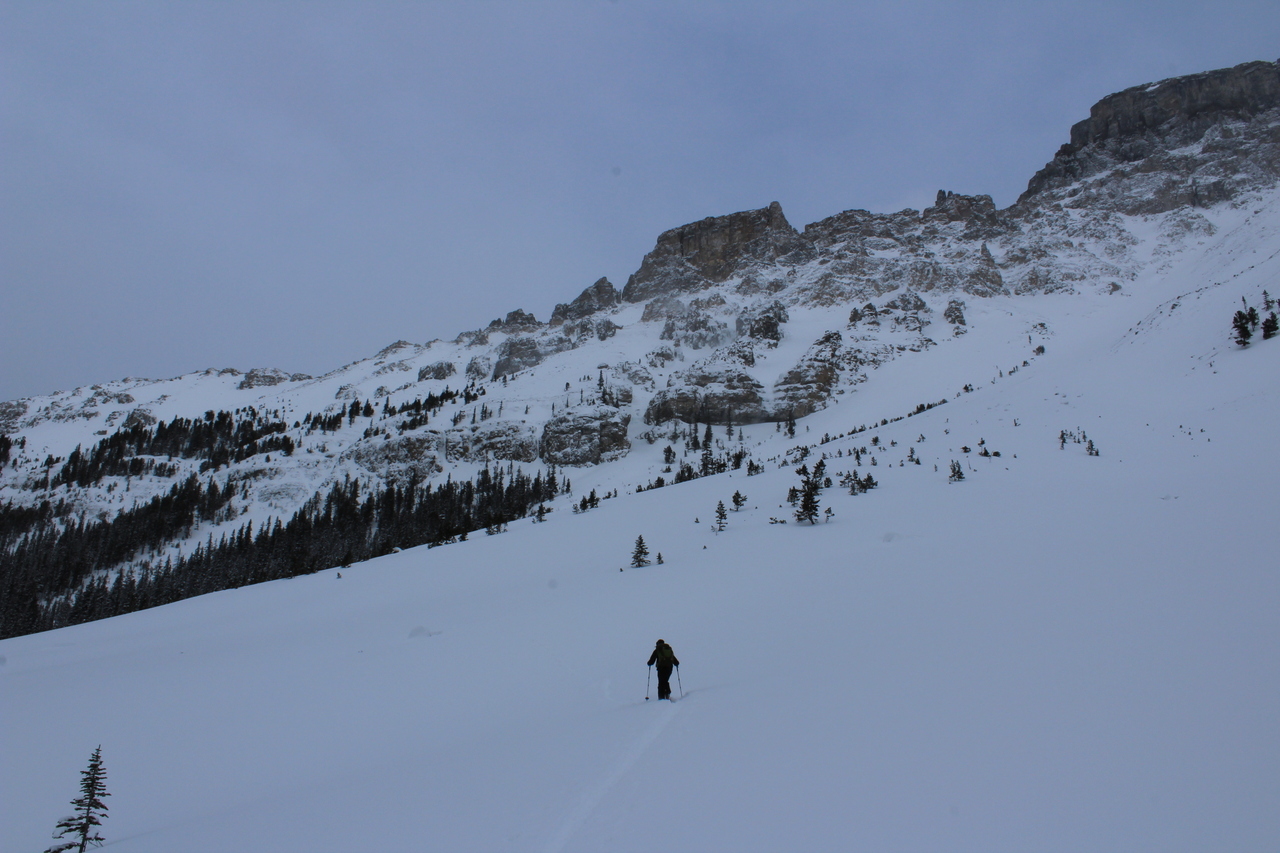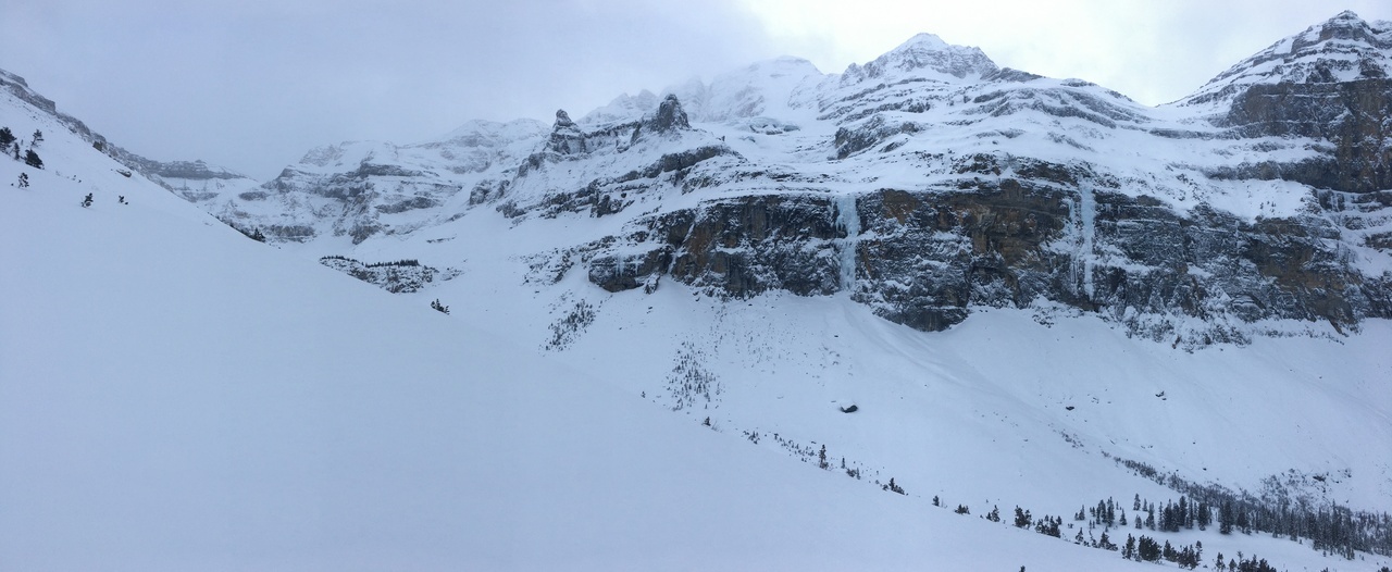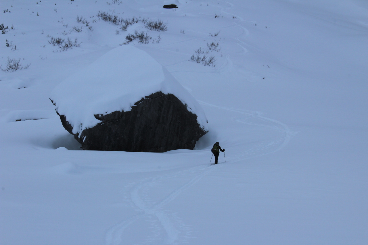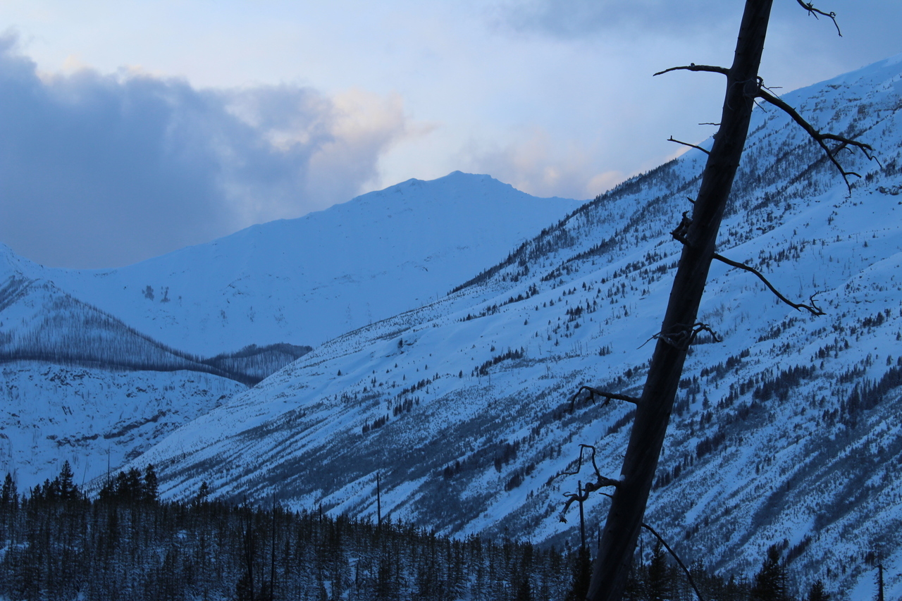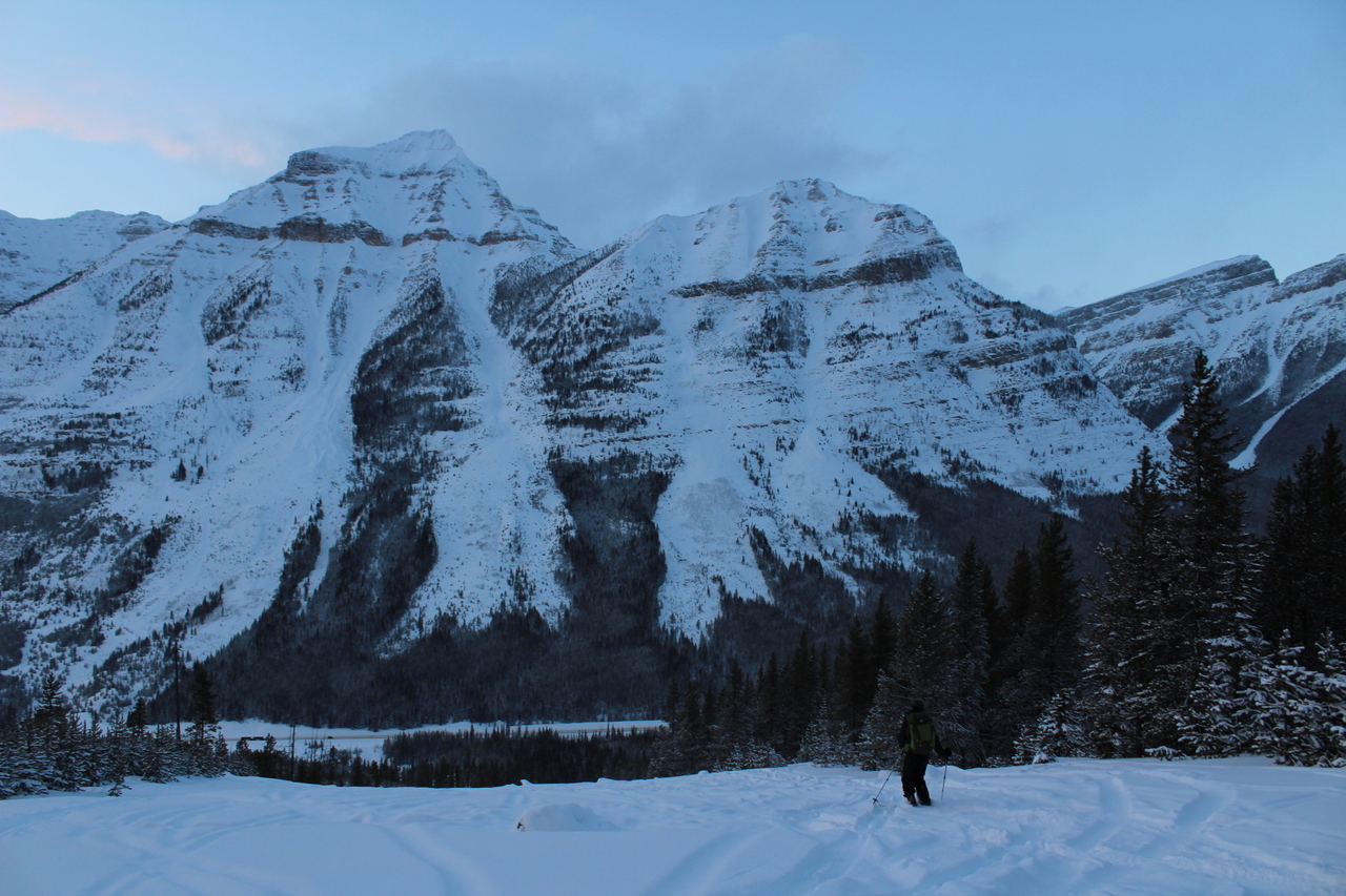 The trail would continue to the treed outcropping (center) in summer, but with avalanche risk from the slopes on either side, we decided it would be best not to venture deeper into the valley.