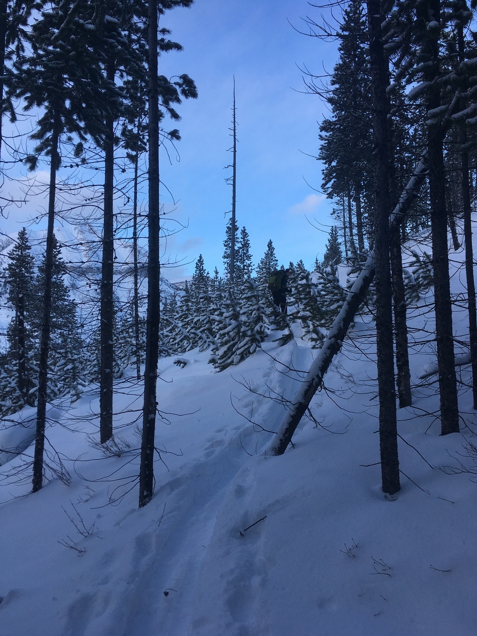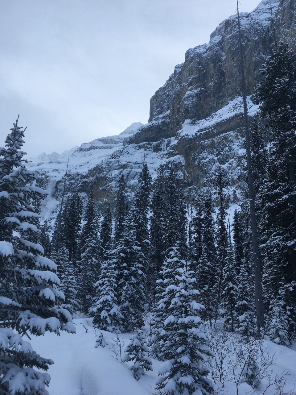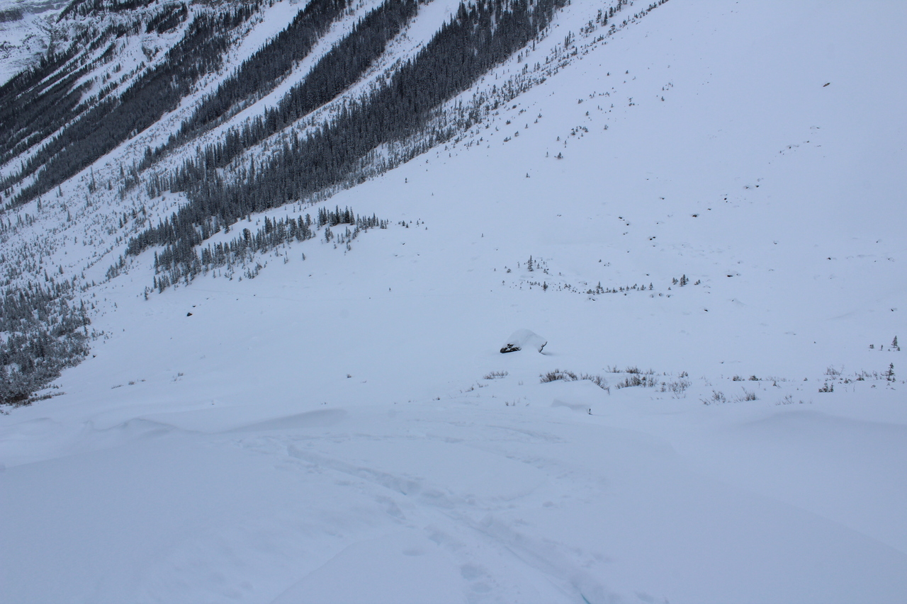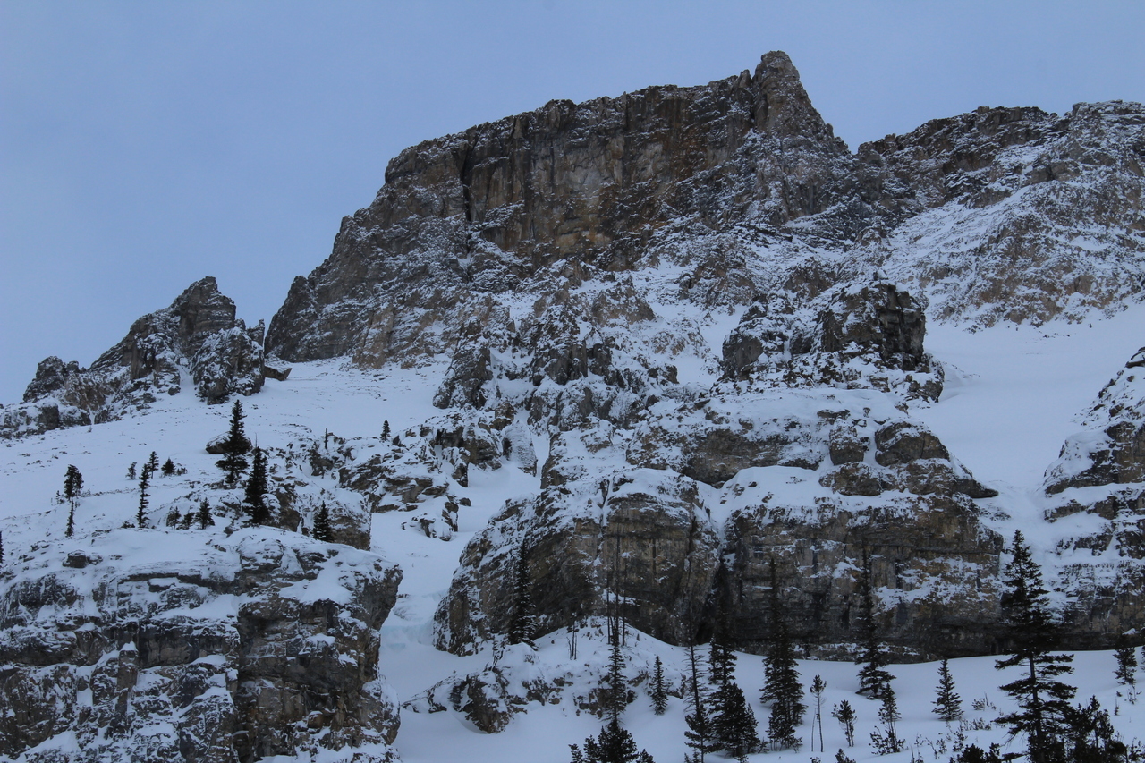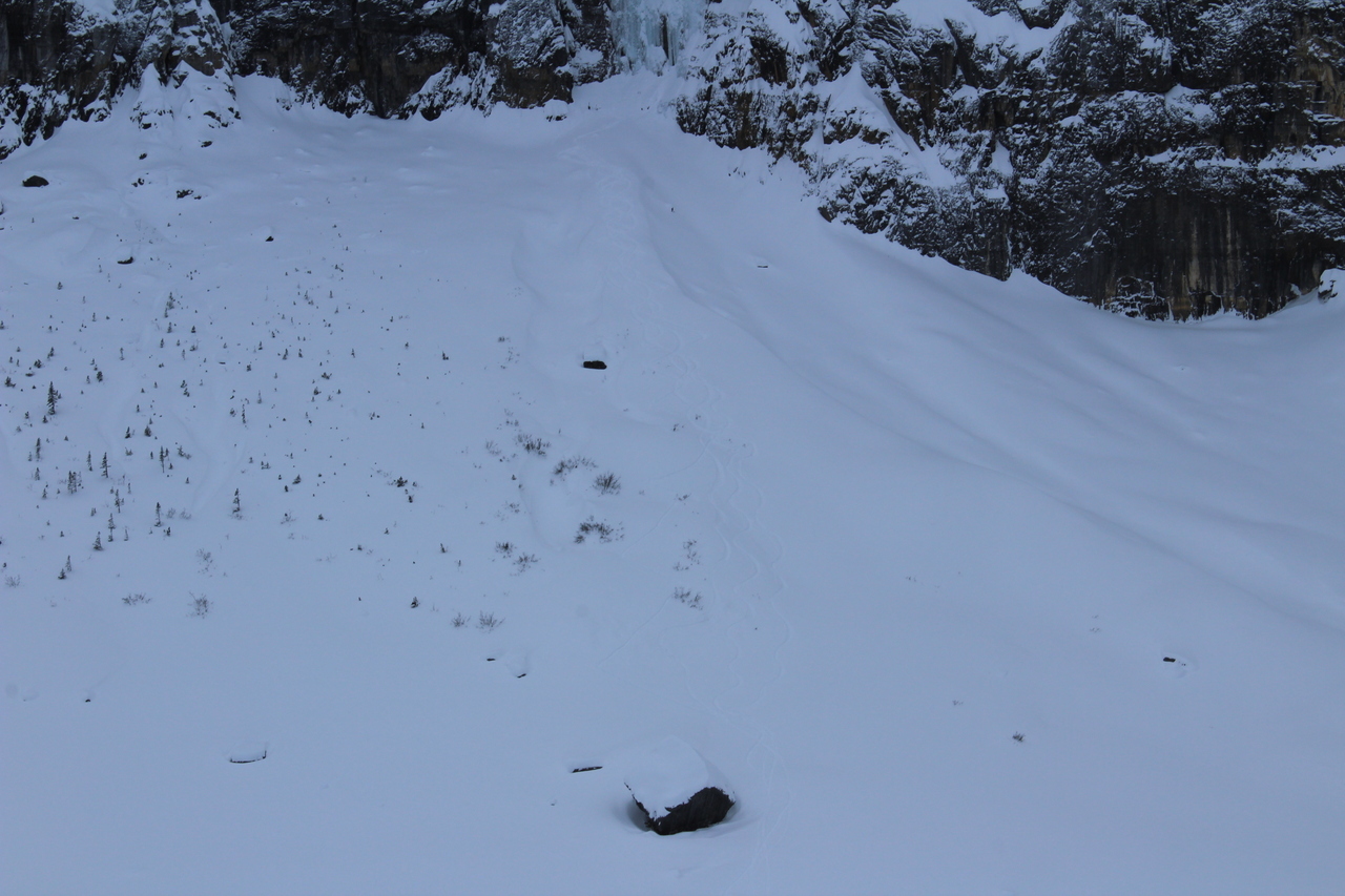 The trail would continue to the treed outcropping (center) in summer, but with avalanche risk from the slopes on either side, we decided it would be best not to venture deeper into the valley.