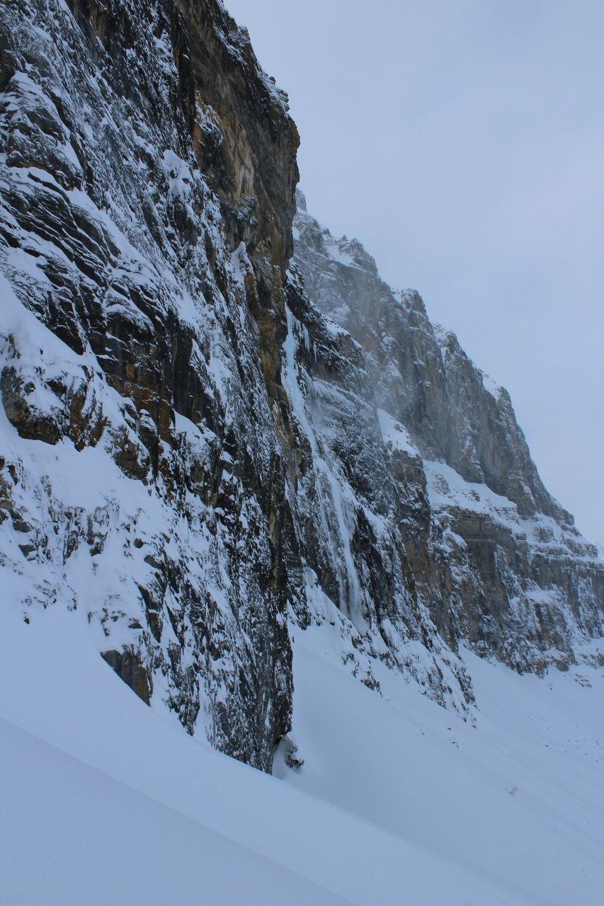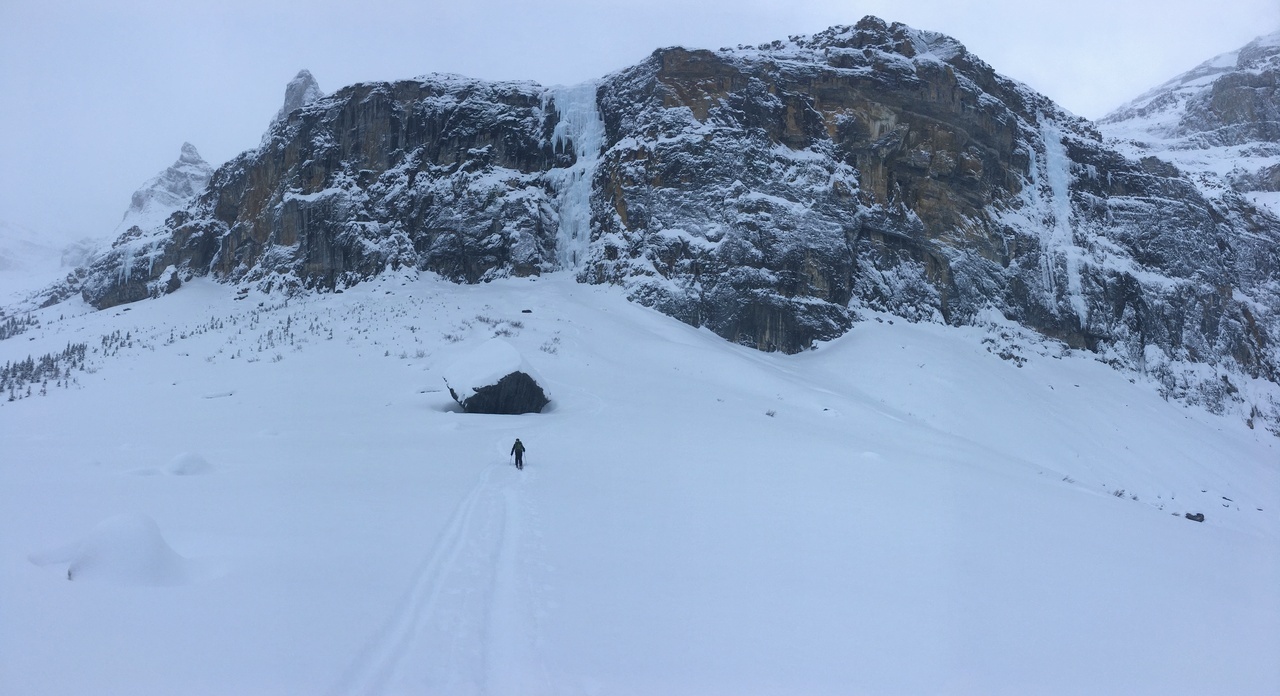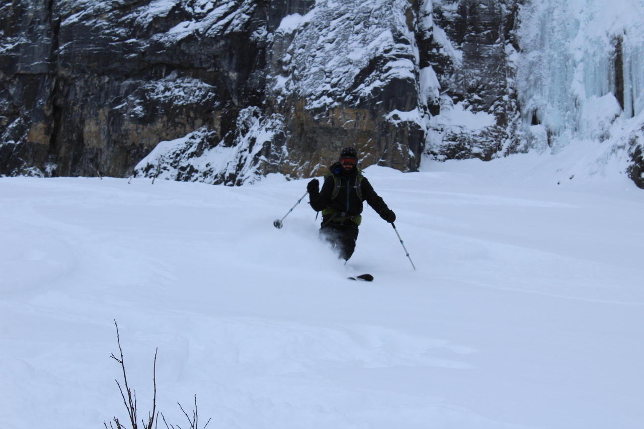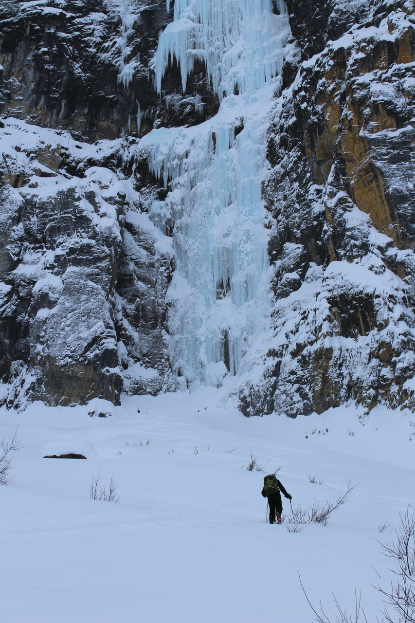 After considering what we wanted to do, we saw some tracks coming down from the frozen waterfall to our right (known for the Nemesis ice climb), and as it looked low avalanche risk, we decided to give it a go!
