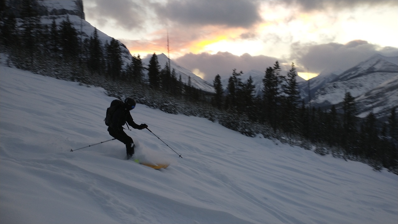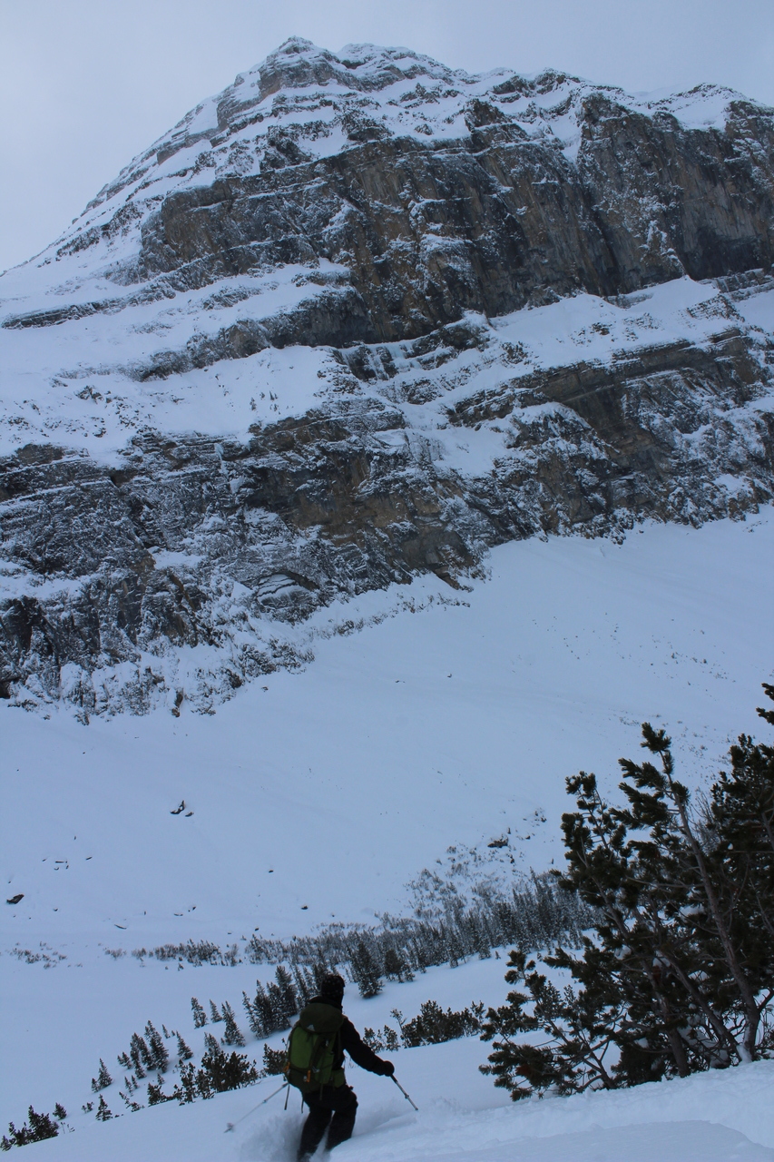 Although we had far out-done our original goal of skiing the "ski run", we still hadn't forgotten about it! When we arrived back at the short bridge, crossing Stanley Creek (near the end of the upper valley), and we saw some skin tracks traversing to skier's right, we just couldn't resist following them! Hopefully they knew what they were doing and there's a way to cross Vermilion River at the bottom...If not...nah, they gotta know what they were doing...right?