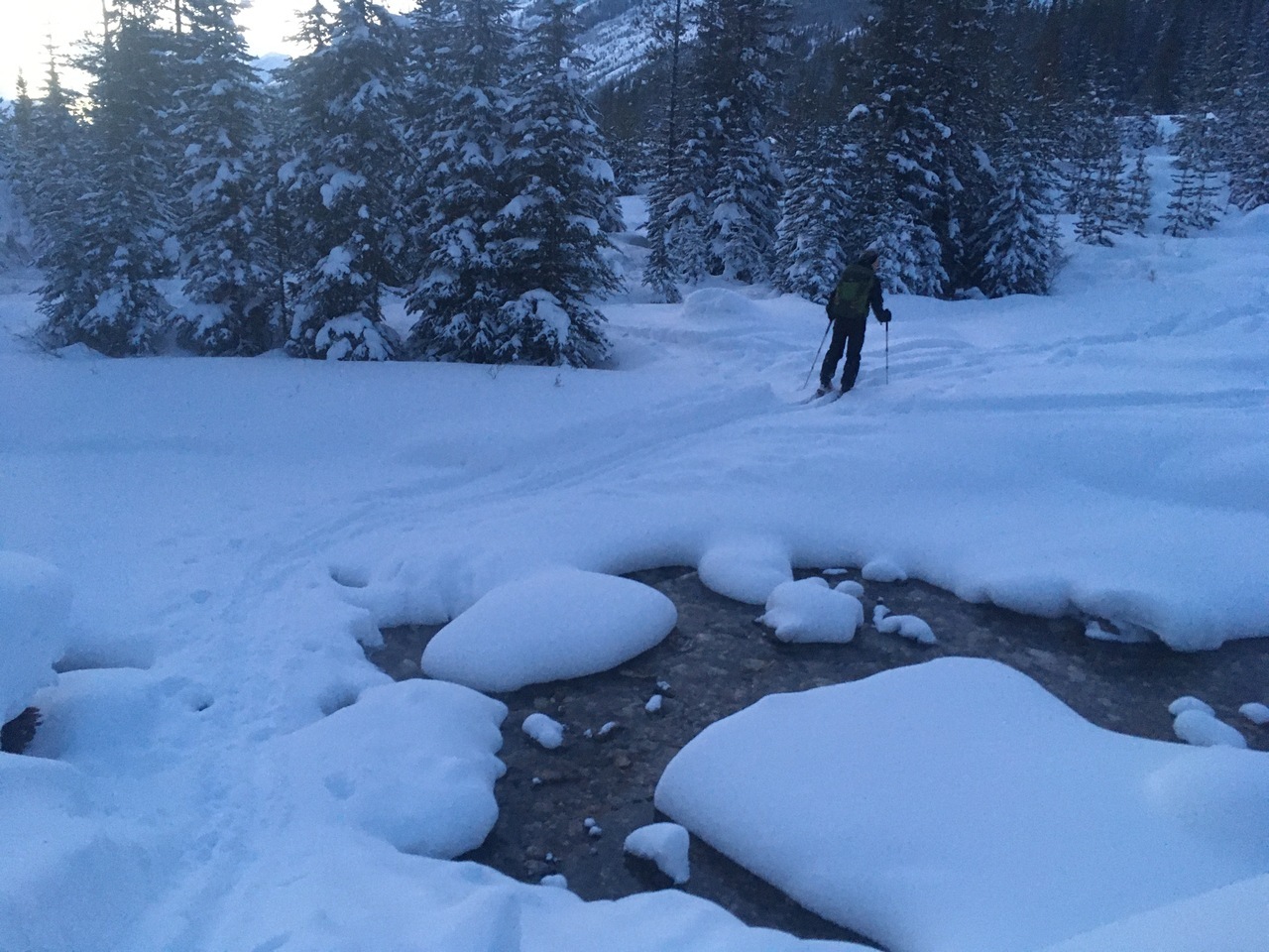 As we gained elevation along the trail, we considered traversing through the forest to the "ski run" (now on the correct side of the river). But...with all the incredible winter scenery, our plan quickly grew to skinning all the way up to Stanley Glacier Valley...Maybe we'll hit the "ski run" on the way down??