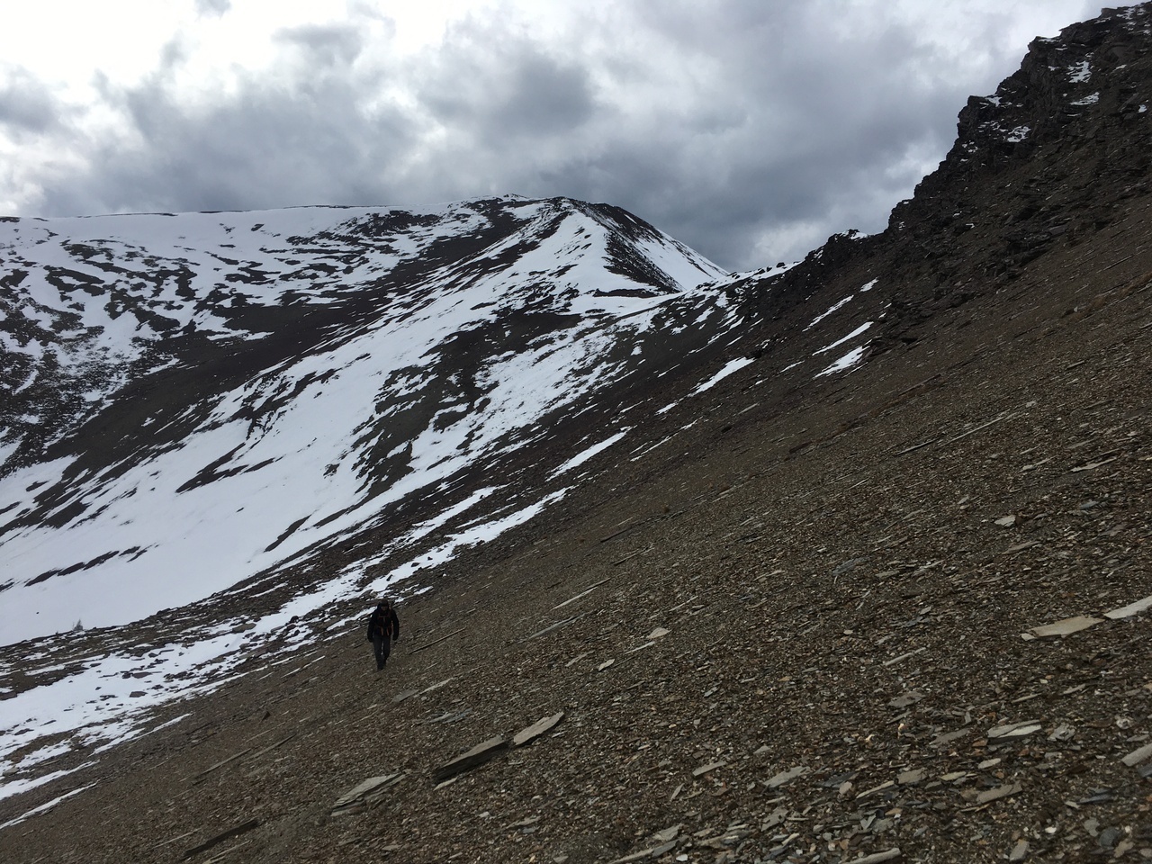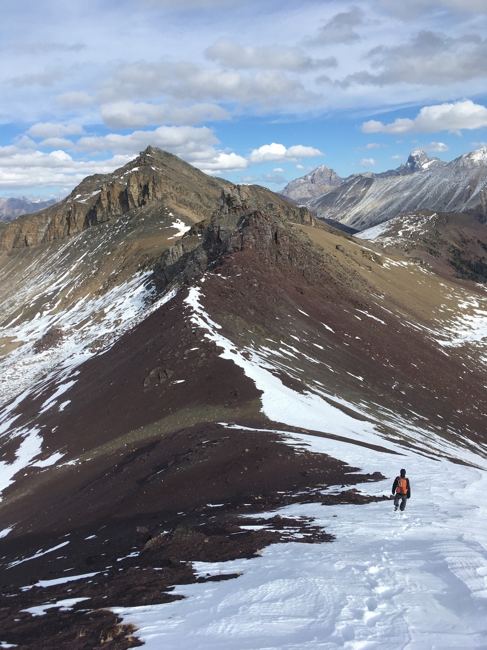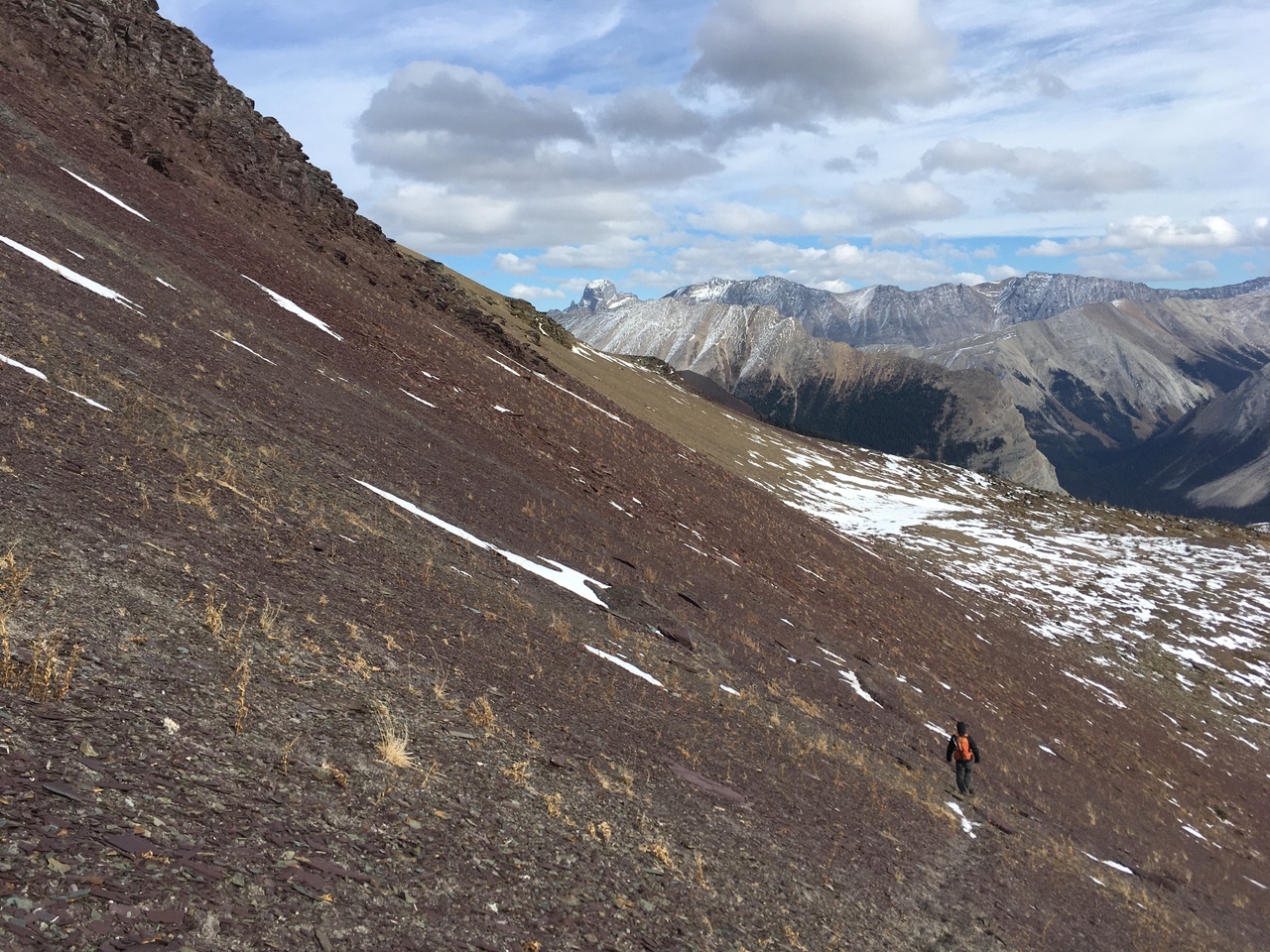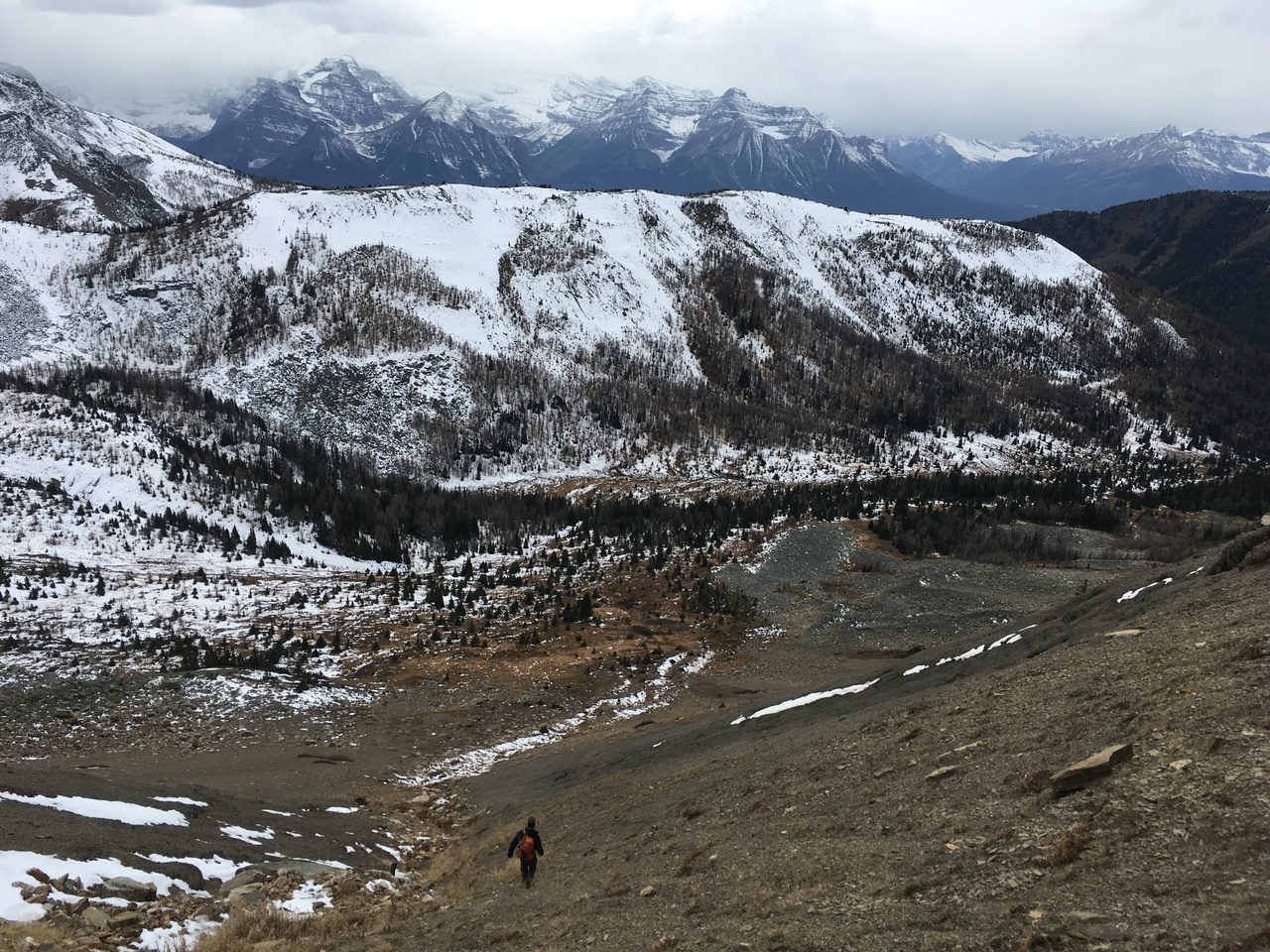 Once past all that excitement, we enjoyed a speedy descent to Wolverine Valley on soft scree! Wolverine Ridge rises from the opposite side of the valley.