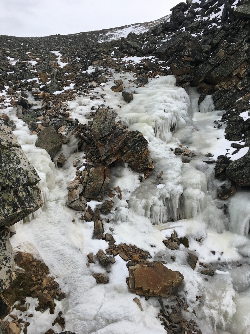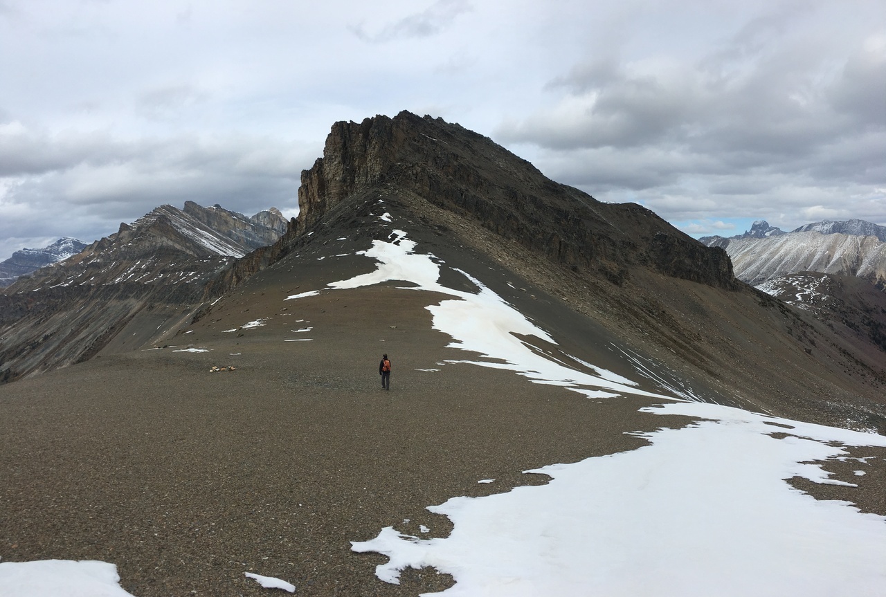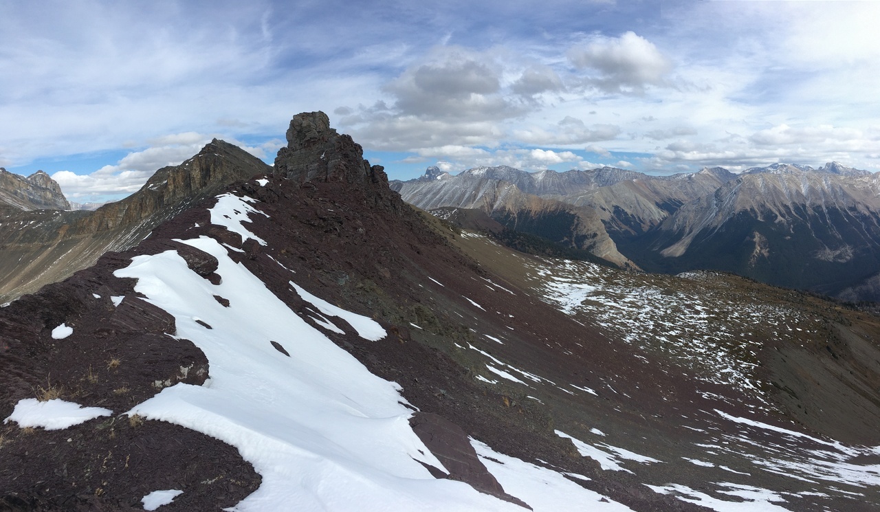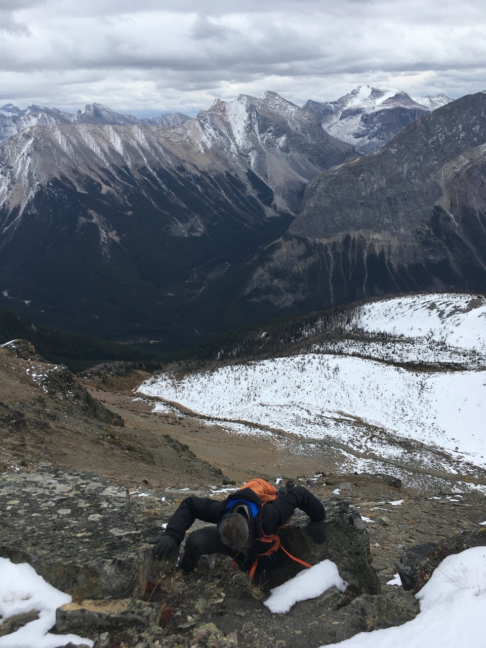 Once past all that excitement, we enjoyed a speedy descent to Wolverine Valley on soft scree! Wolverine Ridge rises from the opposite side of the valley.
