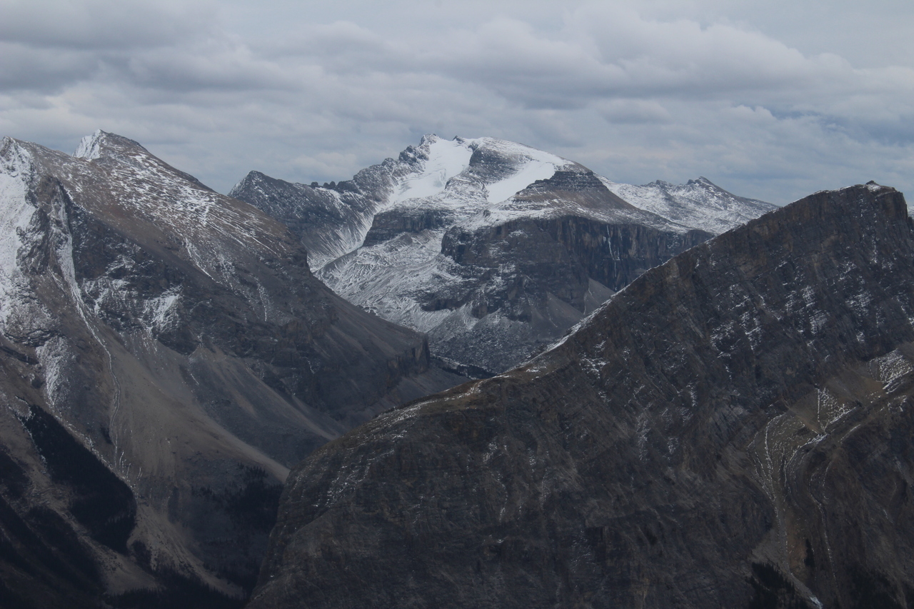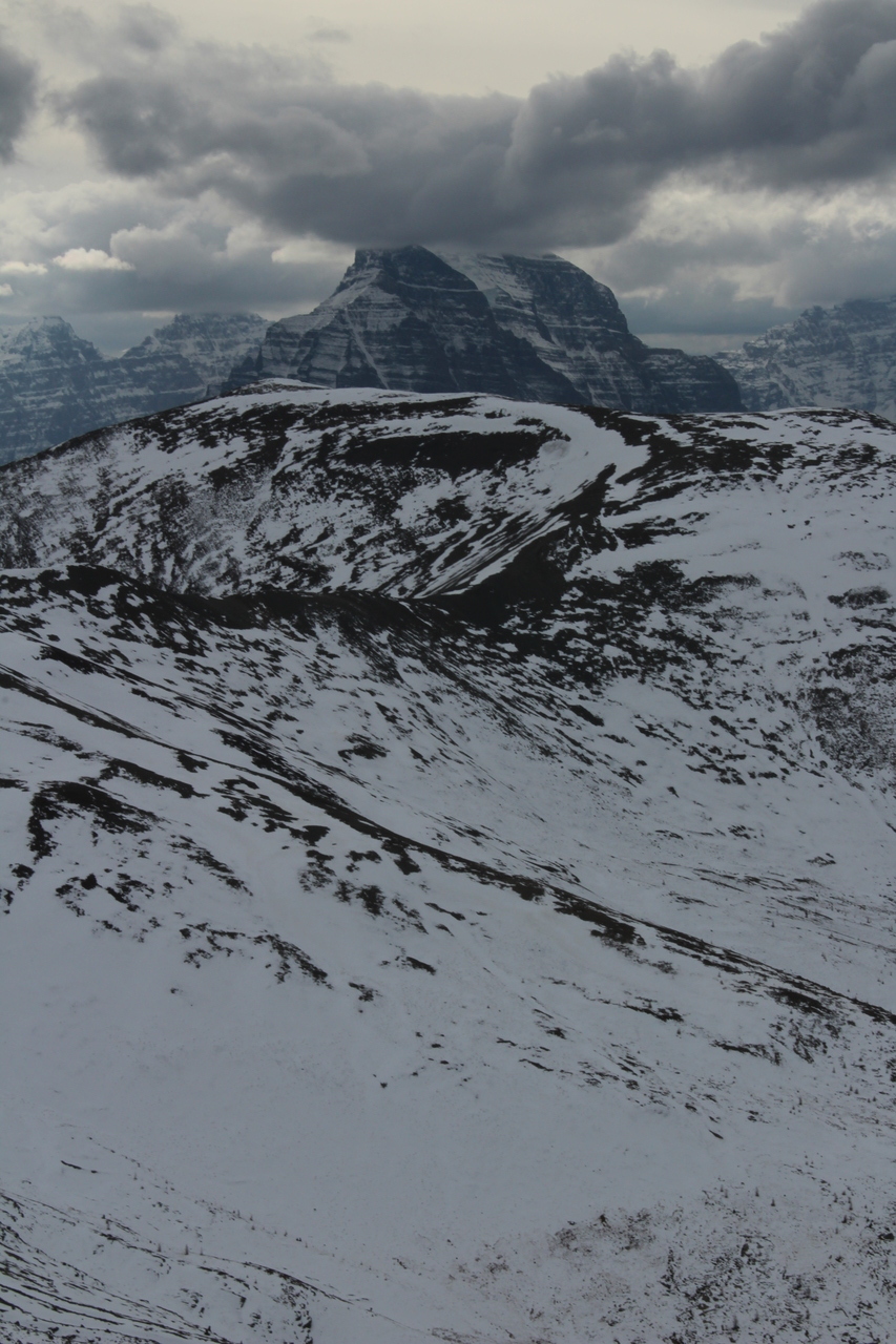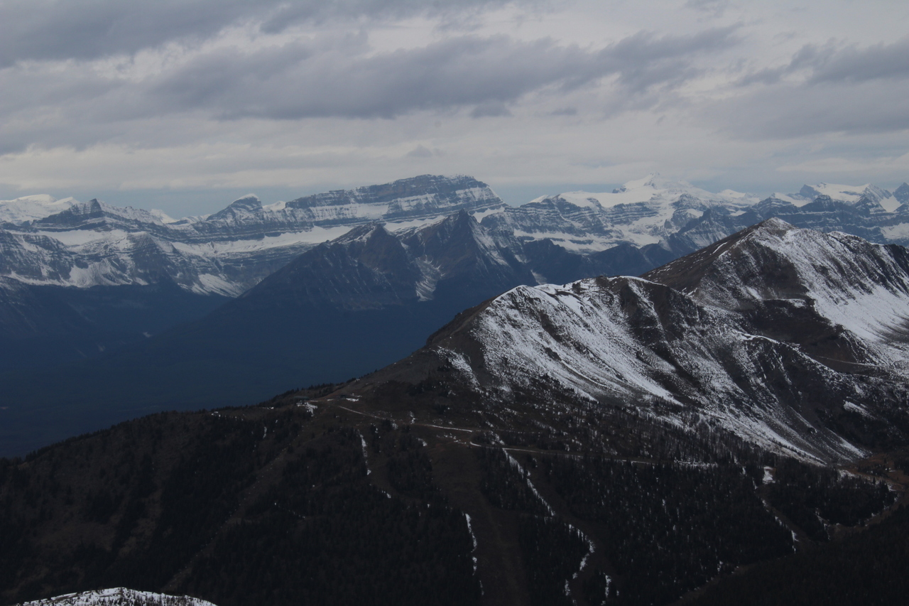 Looking over the back side of Lake Louise ski resort on Whitehorn Mountain! Mount Daly rises center, with Niles' rounded peak peeking out down Daly's ridge to the left. Glaciated Mount Balfour is to the right.
