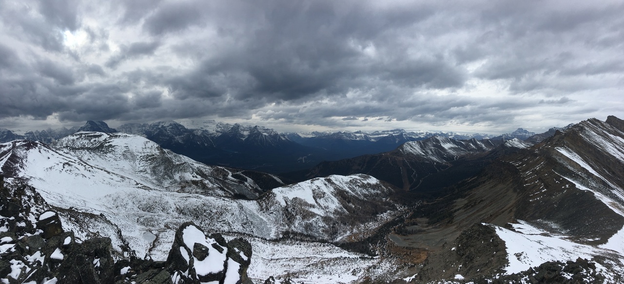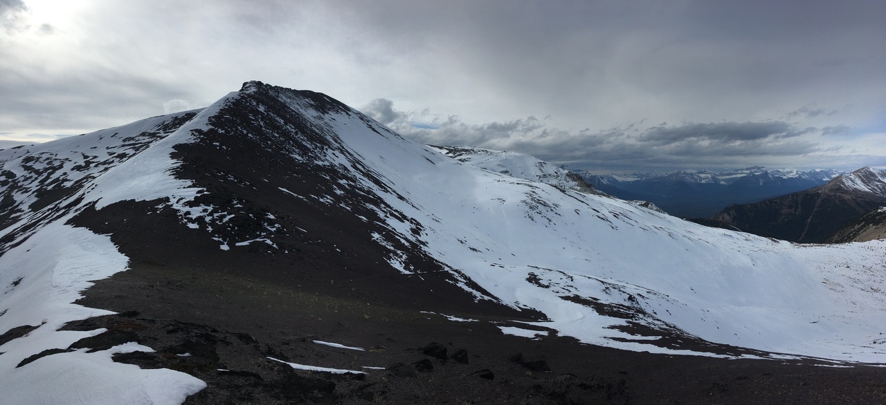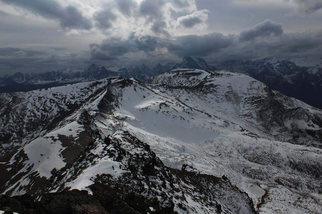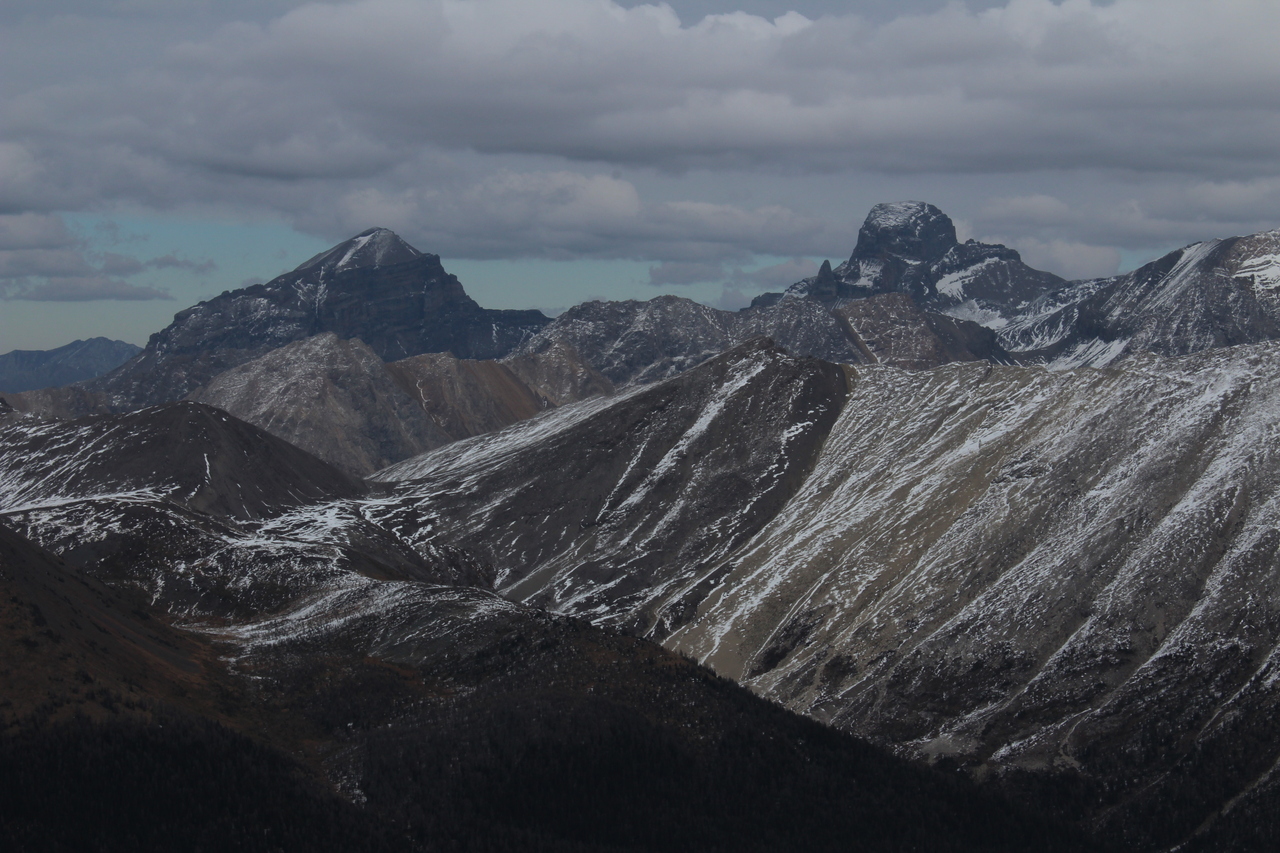 Looking over the back side of Lake Louise ski resort on Whitehorn Mountain! Mount Daly rises center, with Niles' rounded peak peeking out down Daly's ridge to the left. Glaciated Mount Balfour is to the right.