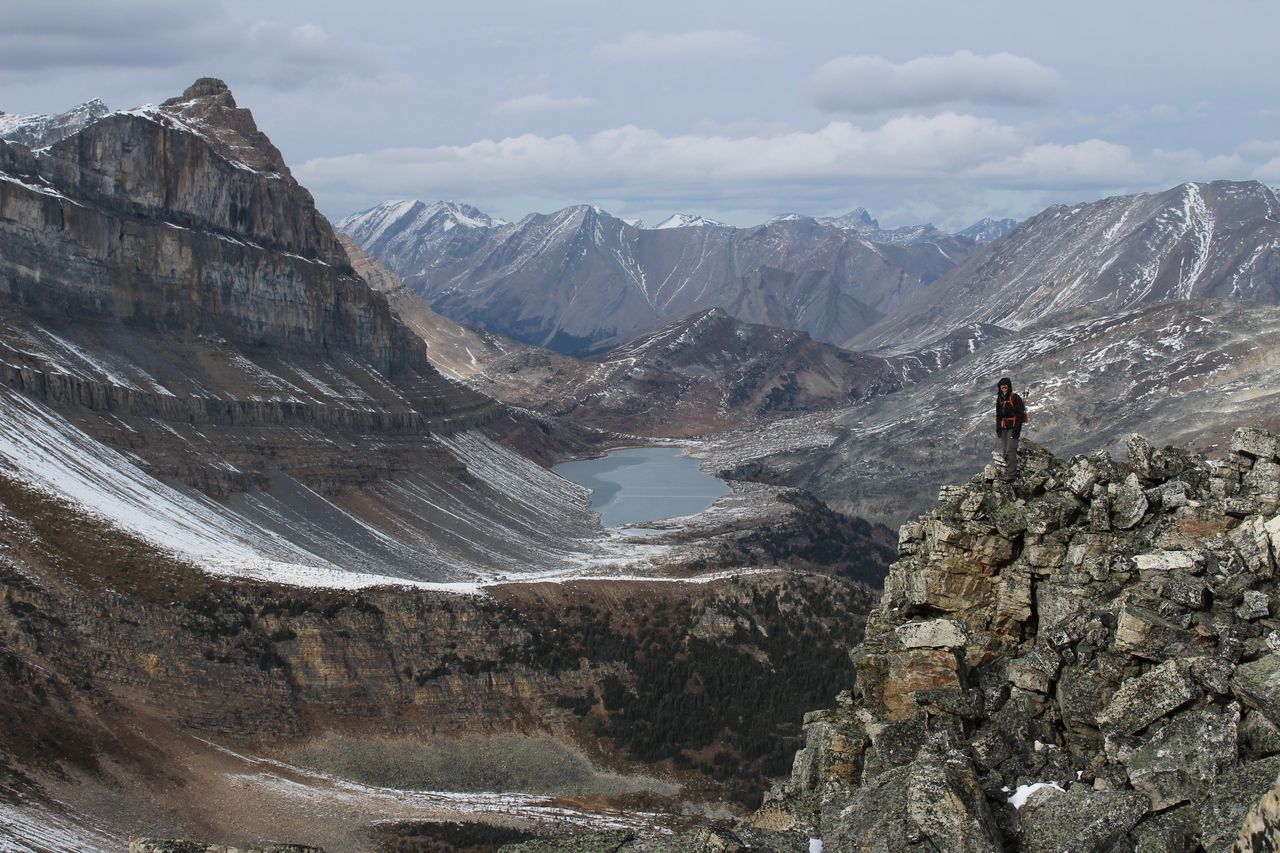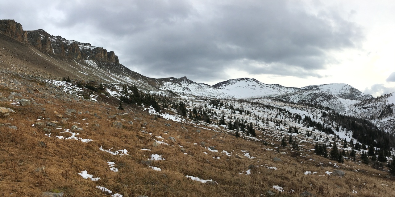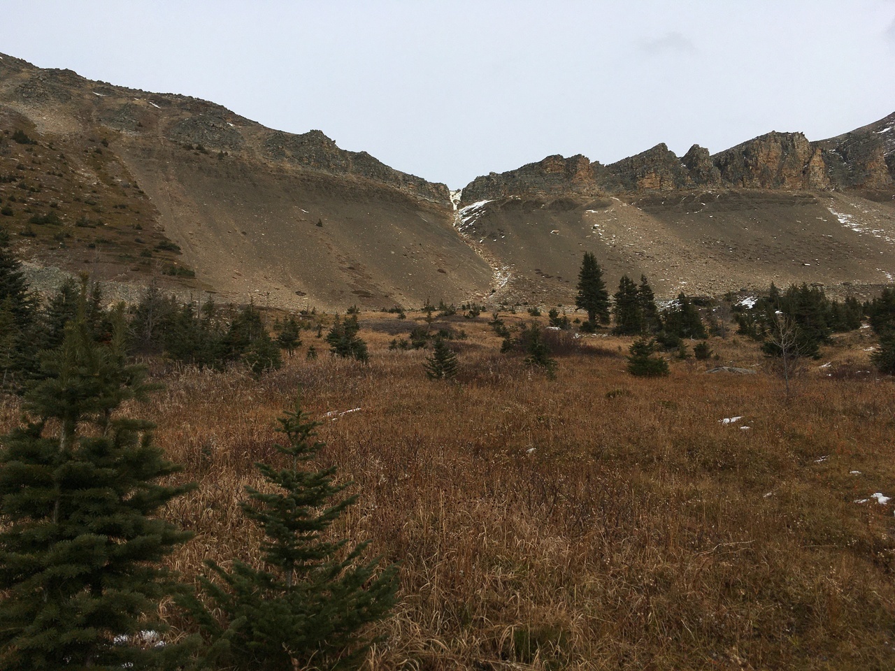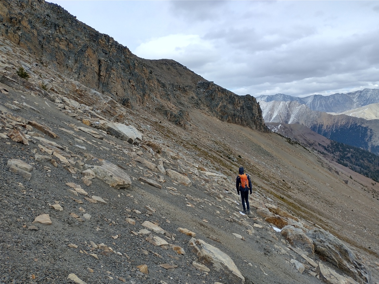 A little ways down the ridge, we angled left, to the plateau below the crest. We then followed the plateau to where everything seemed to funnel down to, hoping there would be a gully we could descend to the valley below...