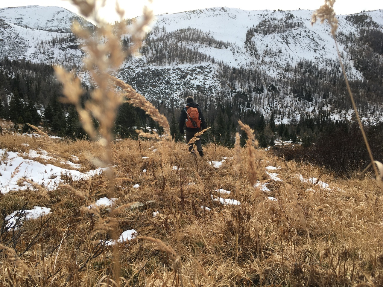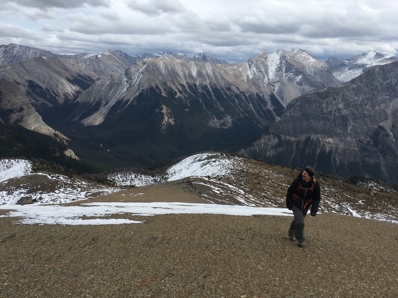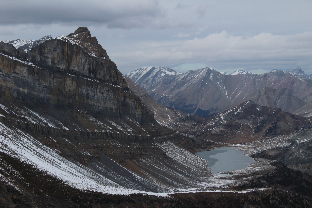 A little ways down the ridge, we angled left, to the plateau below the crest. We then followed the plateau to where everything seemed to funnel down to, hoping there would be a gully we could descend to the valley below...