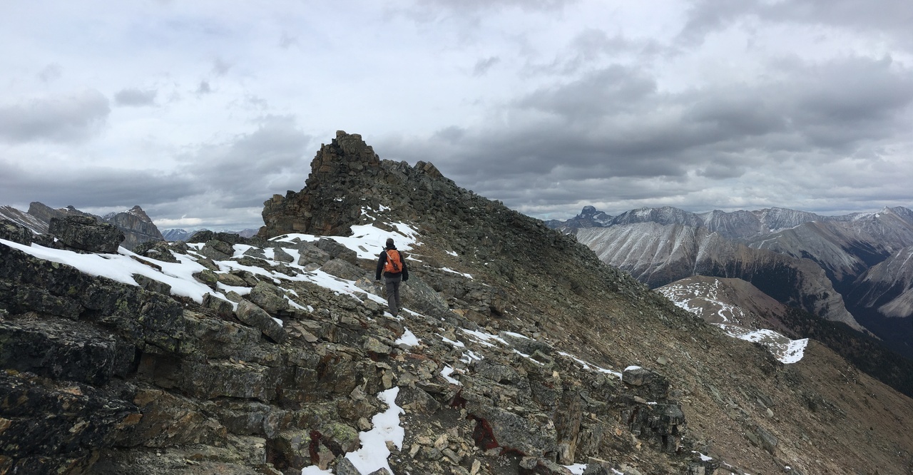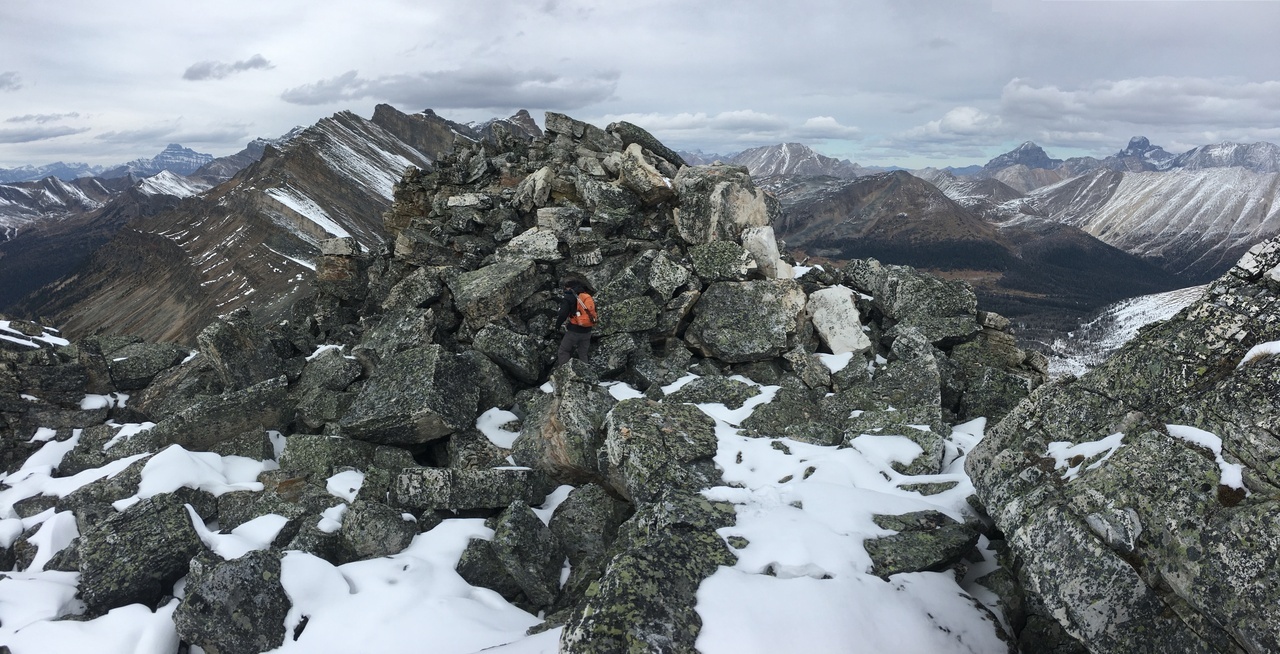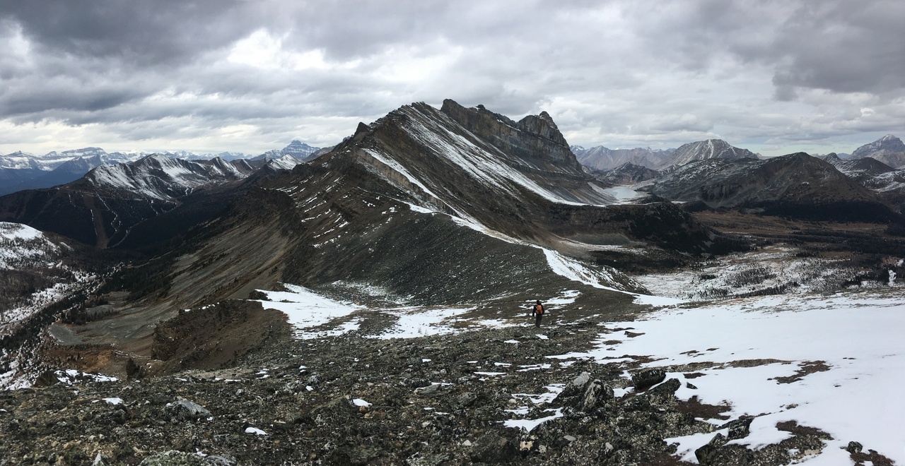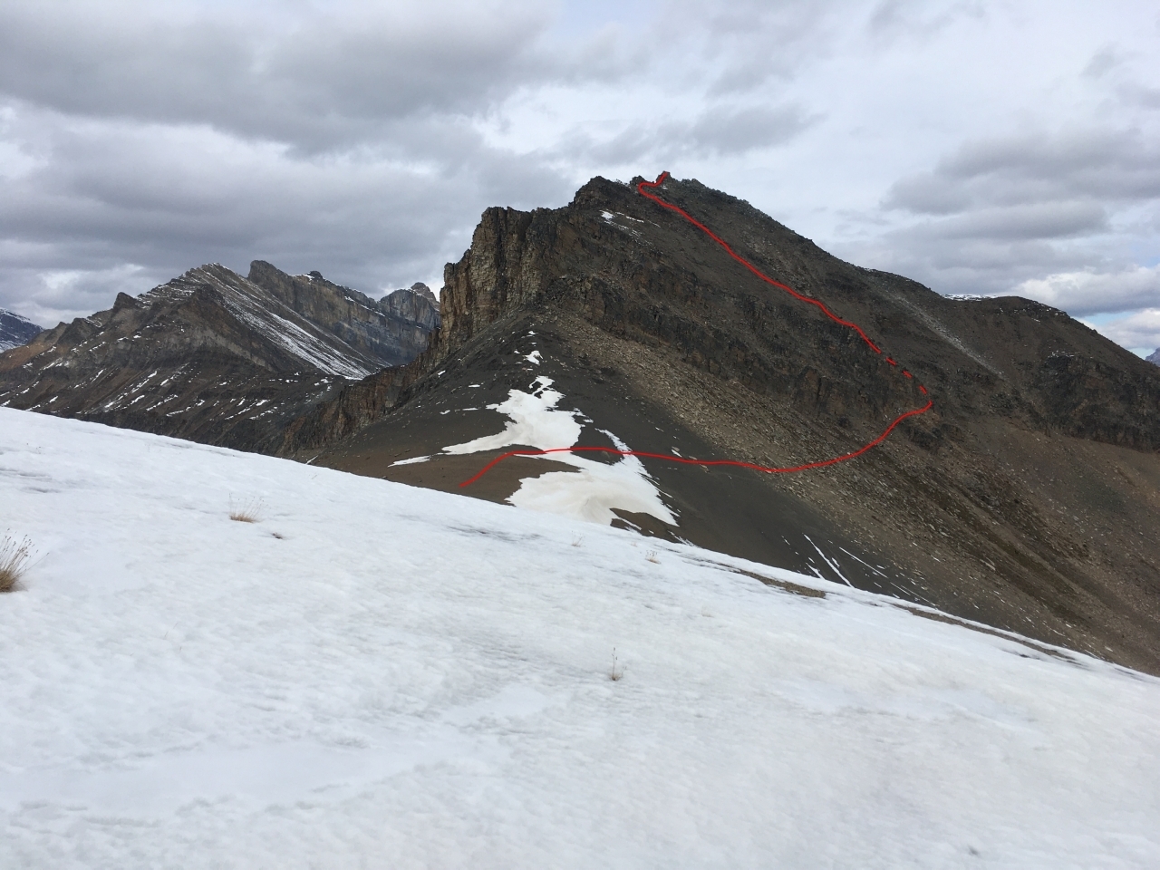 After climbing Lipalian Mountain and traversing to Purple Mound, the finale of our trip was to ascend Unity Peak to complete The Pumpkin Traverse, before descending Unity's north ridge towards Wolverine Valley! I had read that this loop was possible in Kane's Scrambles, but couldn't find any trip reports for more info...It appears most groups climb Unity as a single peak endeavour via our planned descent route. The cliffs guarding Unity on the south side sure looked intimidating, but apparently a moderate route broke through them and we were eager to find out!