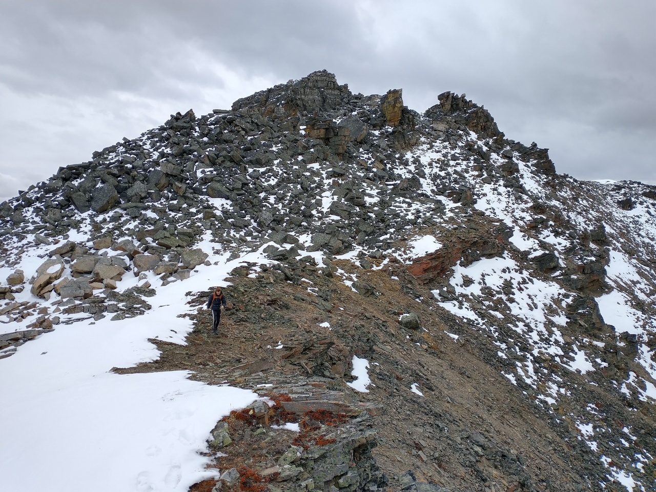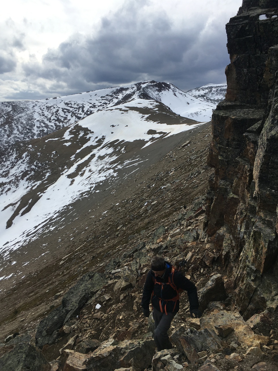 Heading down the north ridge, from the blocky summit. Photo credit: Dad