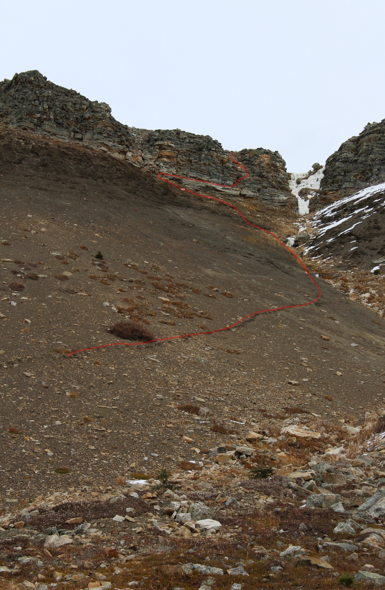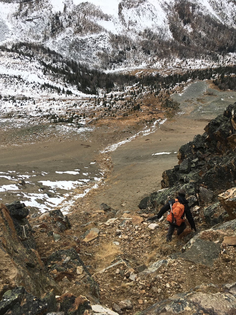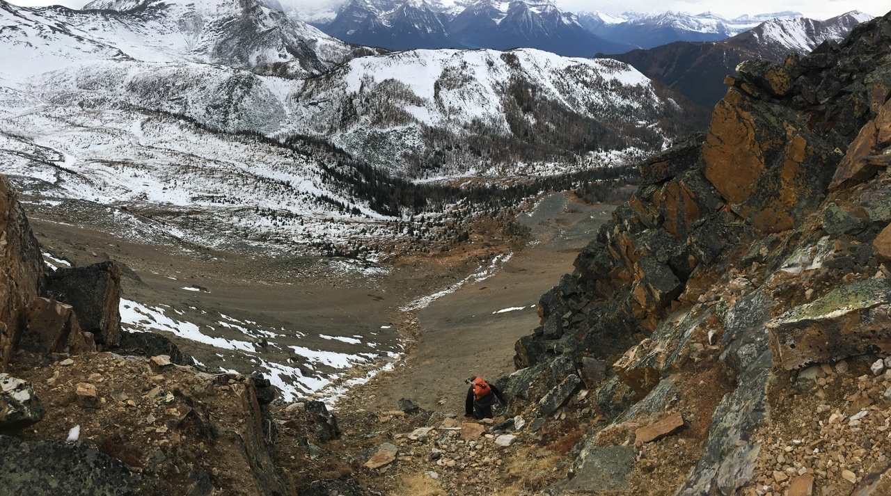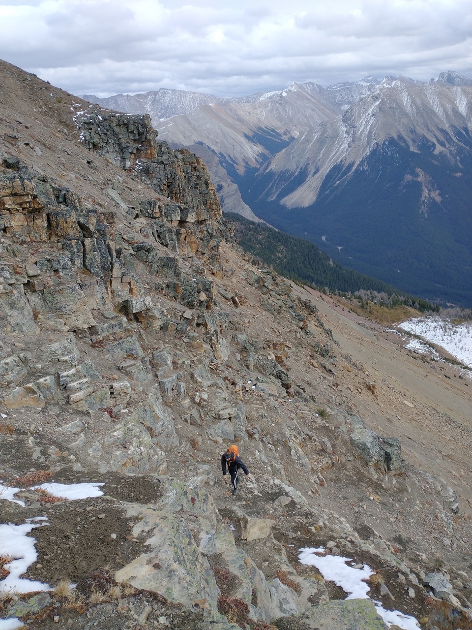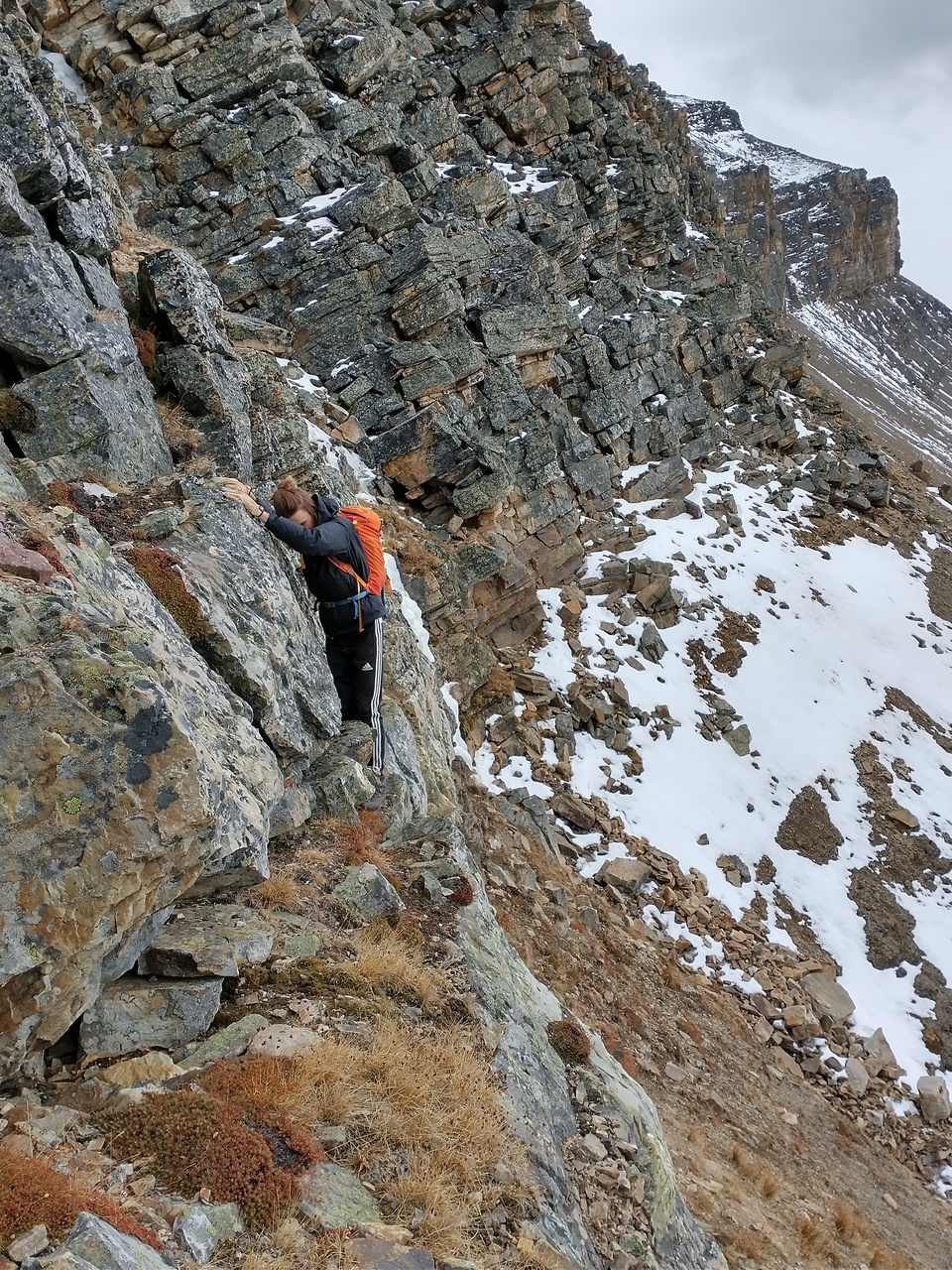 Just a few vertical meters away from the gentler scree slope below, we got cliffed out! Luckily there was a narrow ledge we could traverse across, and we were then able to loop down! The crux however, was getting onto the ledge...This involved carefully stepping on a downsloping, scree covered ledge (right on the edge of the short cliff), in order to reach the (more solid) traversing ledge. Photo credit: Dad