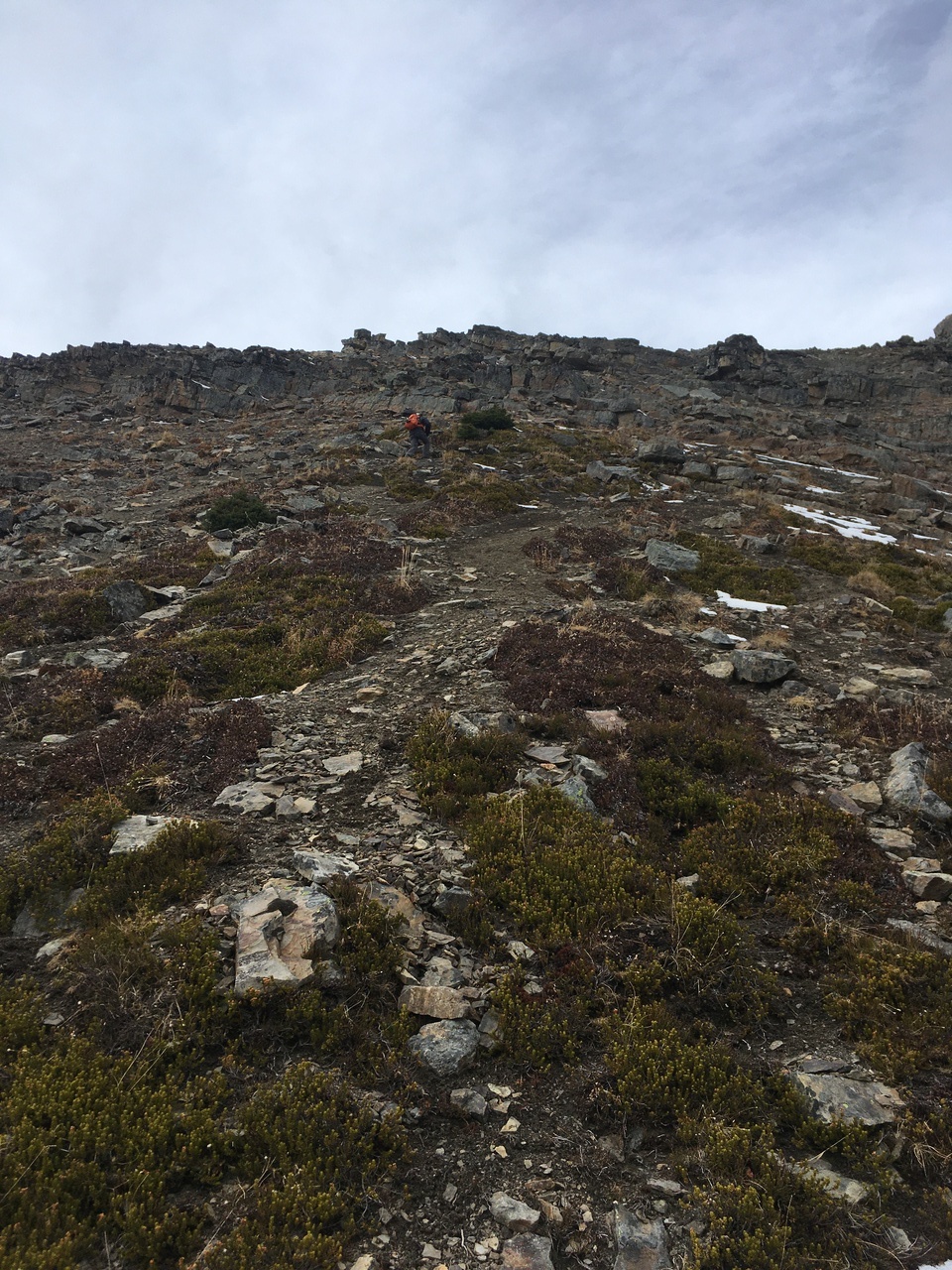 We traversed below the cliffs (to climber's right), looking for a weakness to ascend. Photo credit: Dad