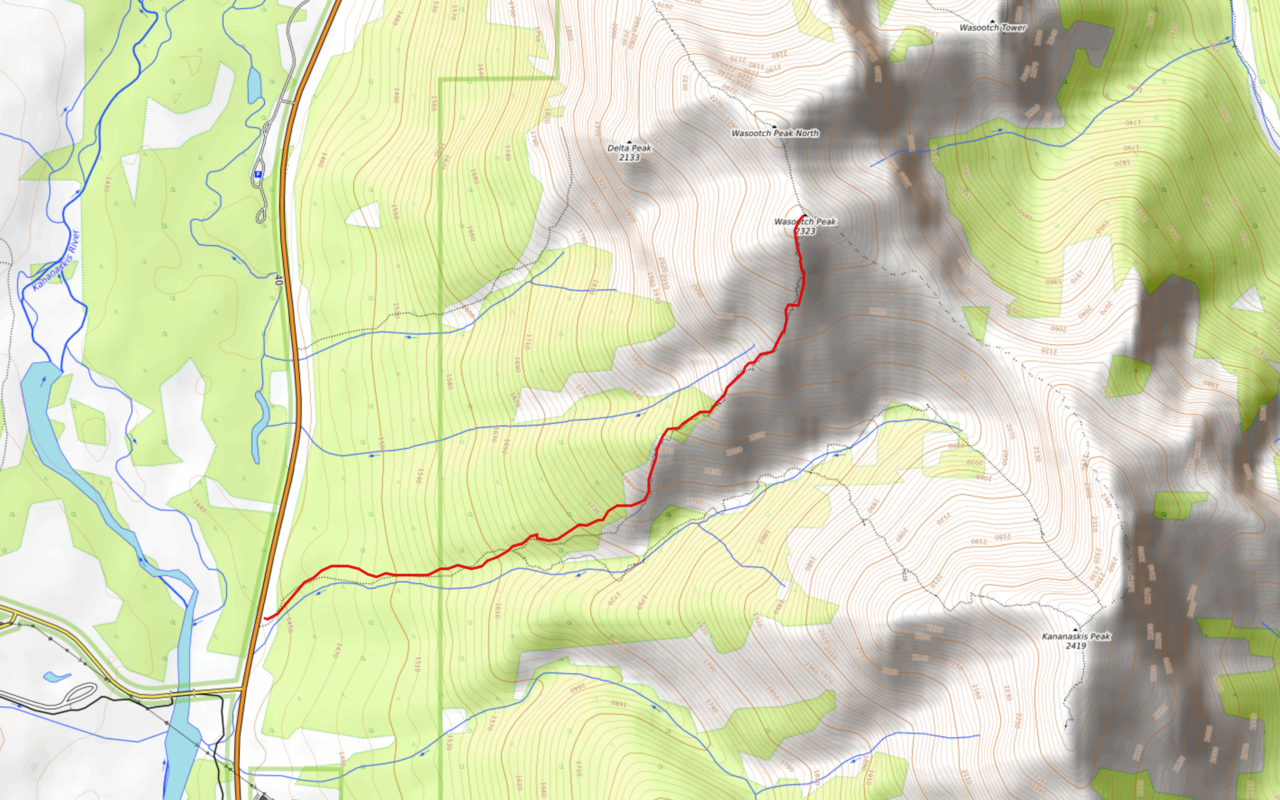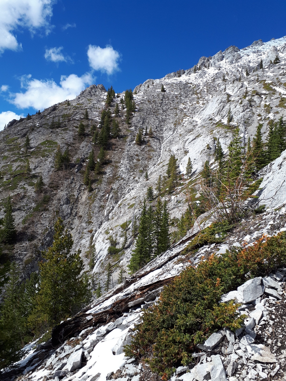 After the initial stretch through the trees, the summit finally comes into view! The ascent of Wasootch is very straightforward, and begins by following a drainage (that runs almost right to the highway) until a cairn prompts you to exit to climber's left. Then you simply follow a trail that soon gains elevation above the drainage, taking you up to the south ridge. As we gained elevation above the drainage, we started to feel the effects of the sun, and began to wonder if it was as much of a blessing as we had originally thought... Photo credit: Dad
