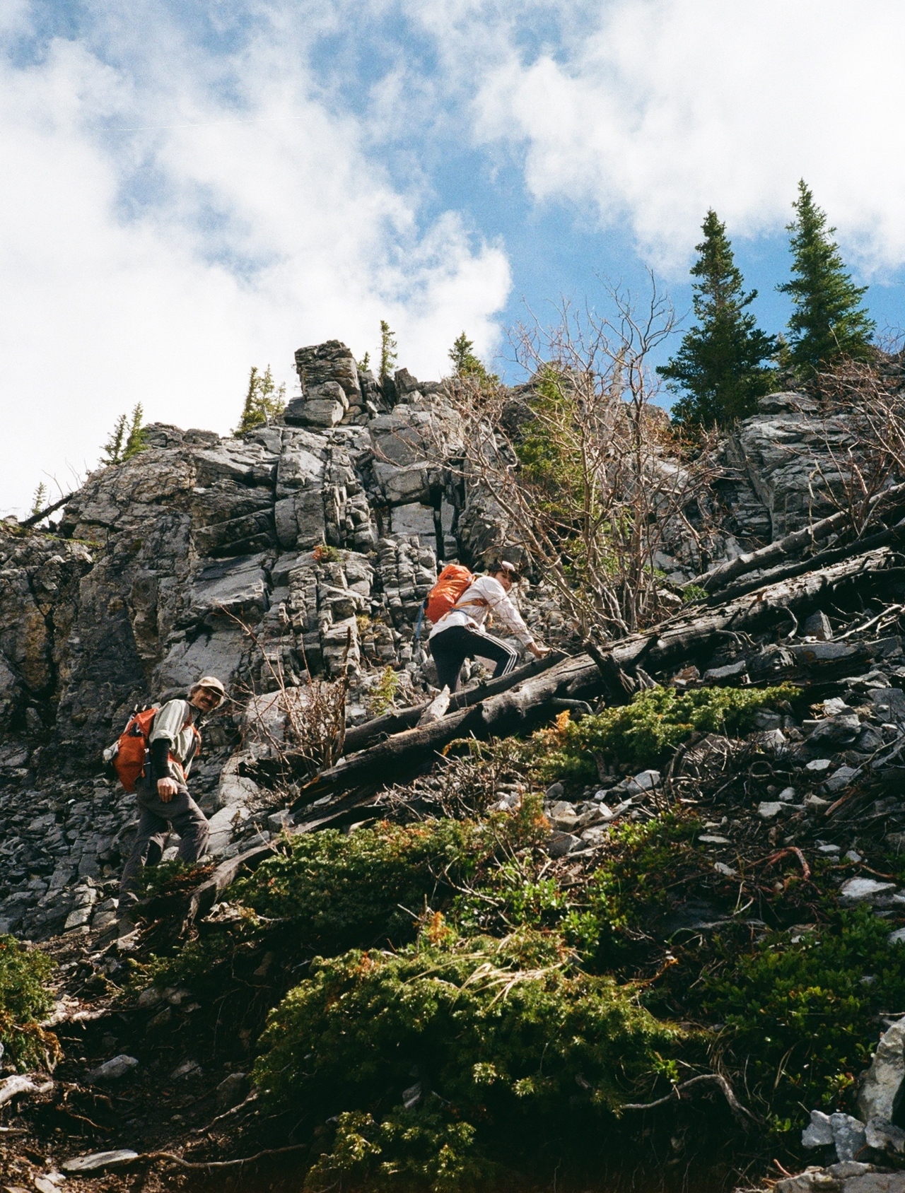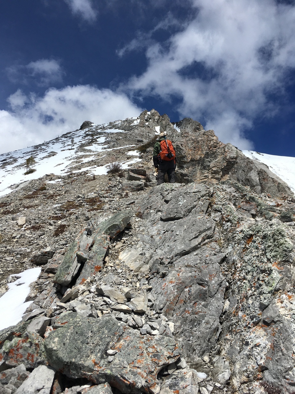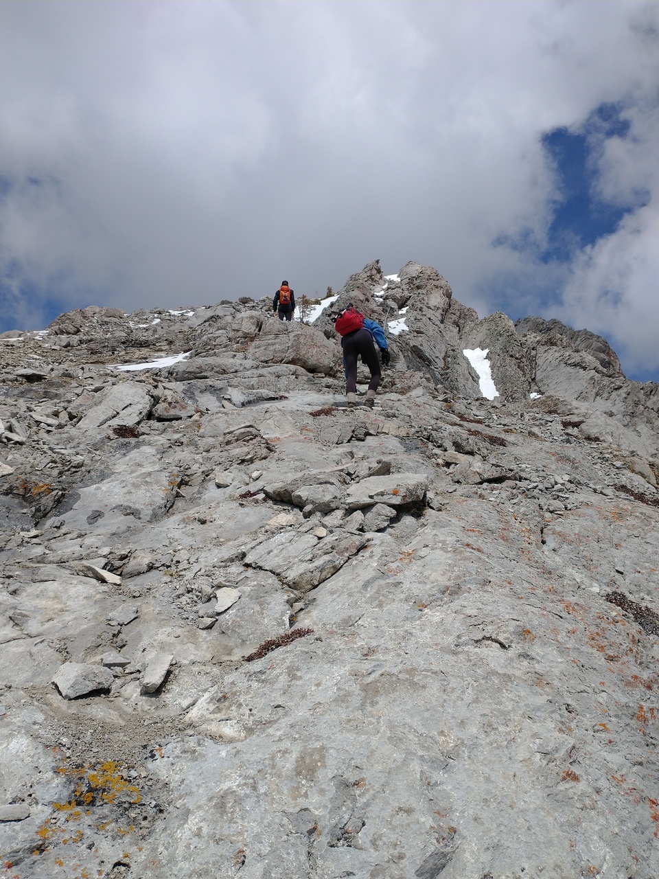 As the ridge curves to the east, the scrambling begins, but a well travelled trail continues to lead through most of the obstacles. Photo credit: Kaitlyn