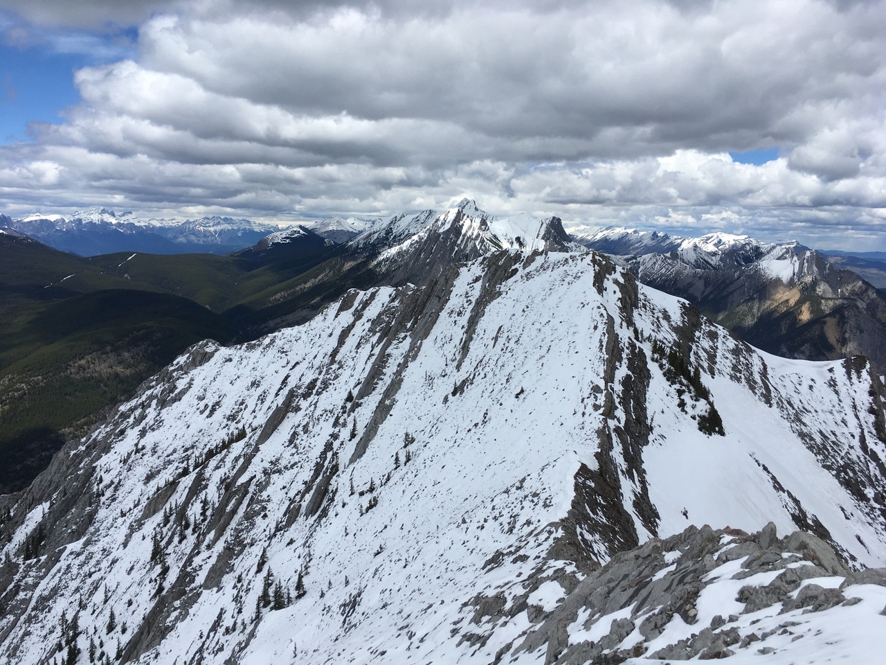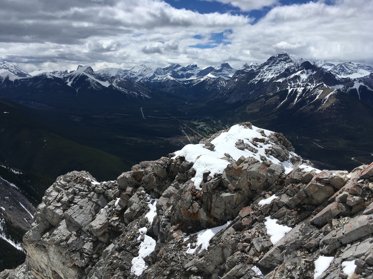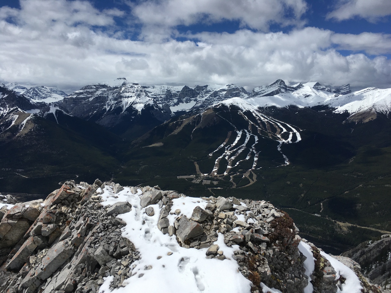 The Banff classics, Mount Rundle and Cascade Mountain are visible far in the distance, down the valley to the northwest.