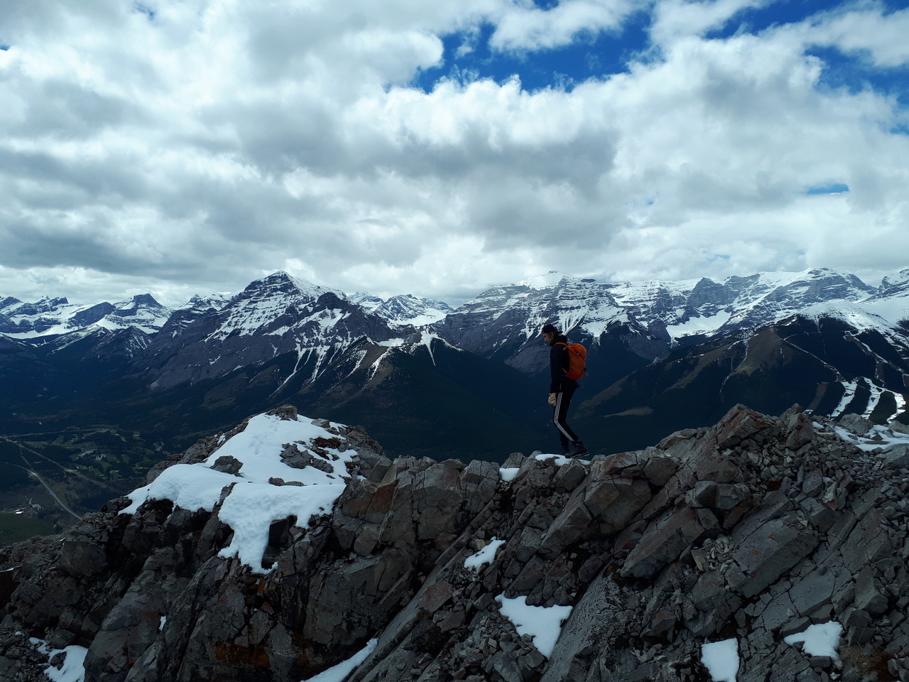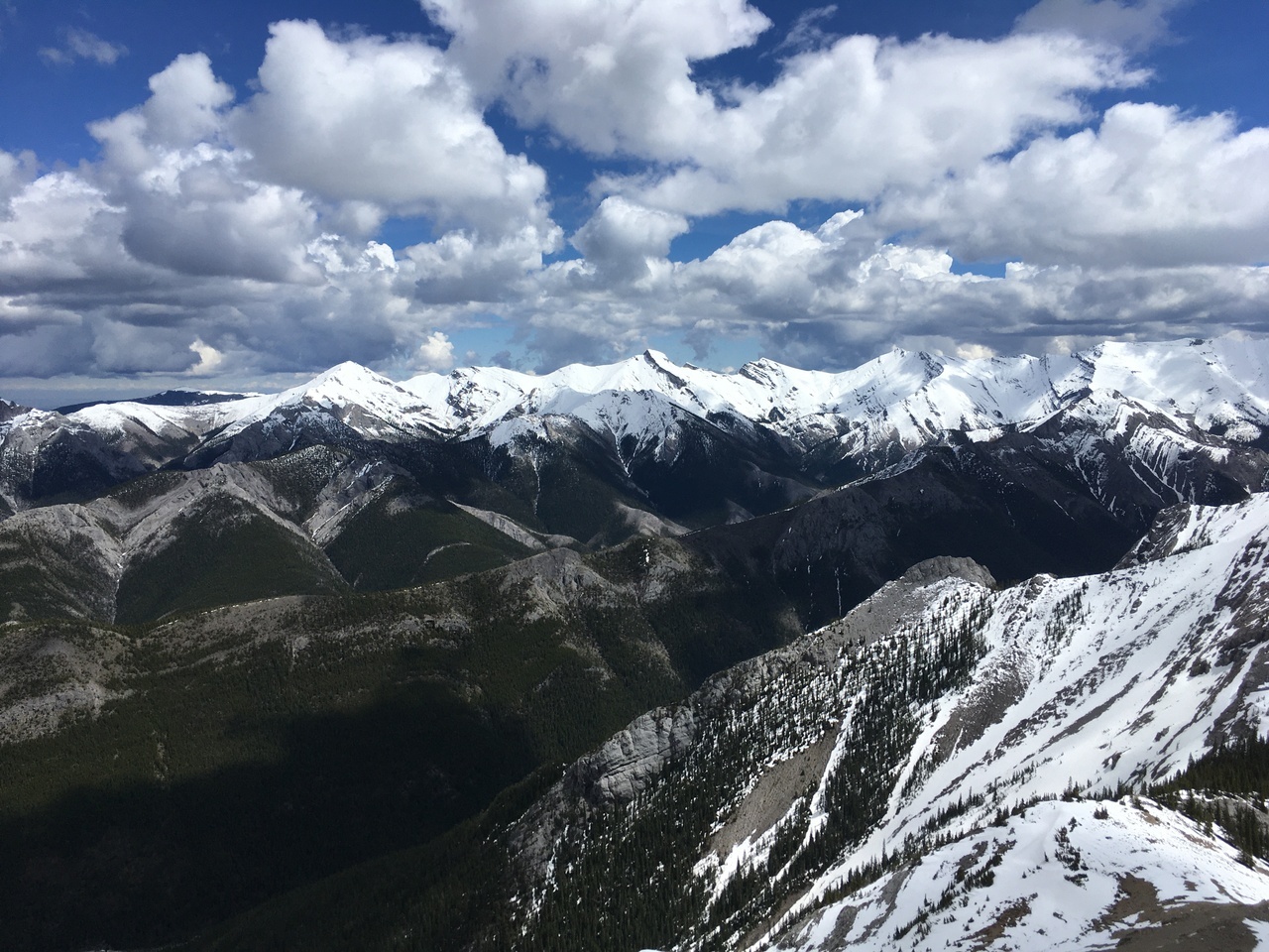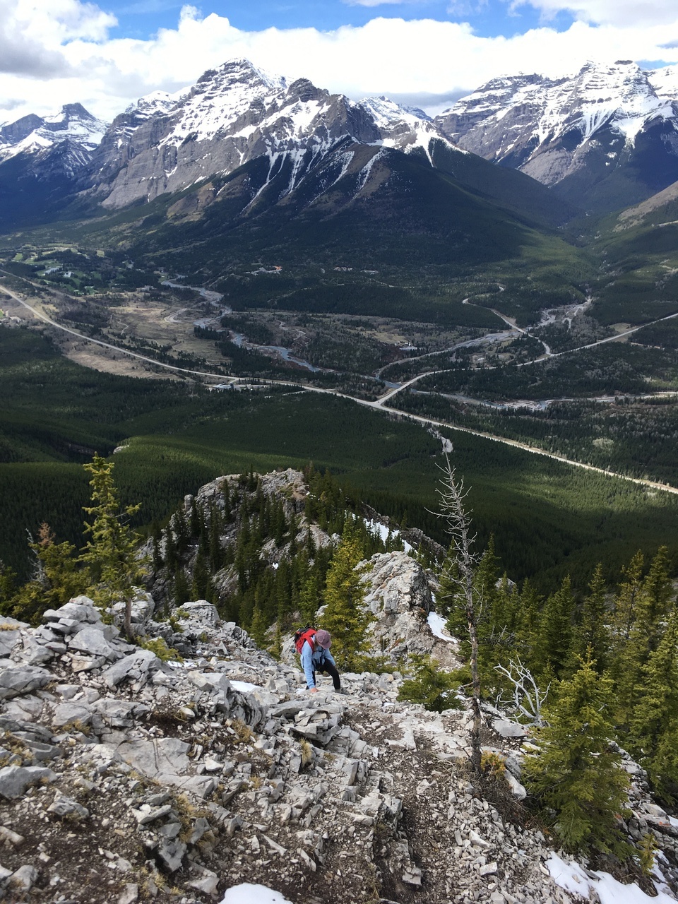 The Banff classics, Mount Rundle and Cascade Mountain are visible far in the distance, down the valley to the northwest.