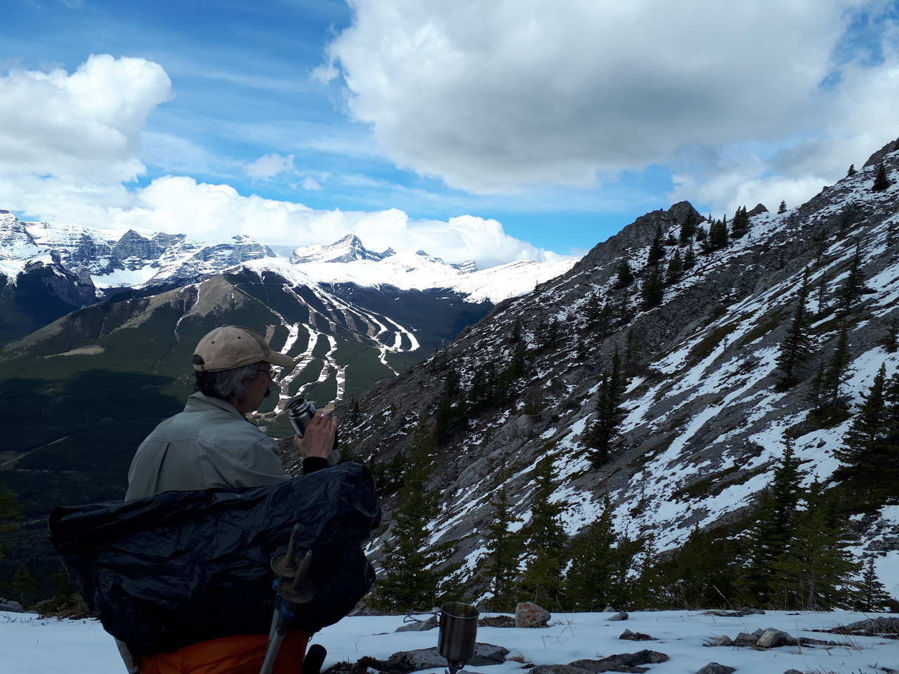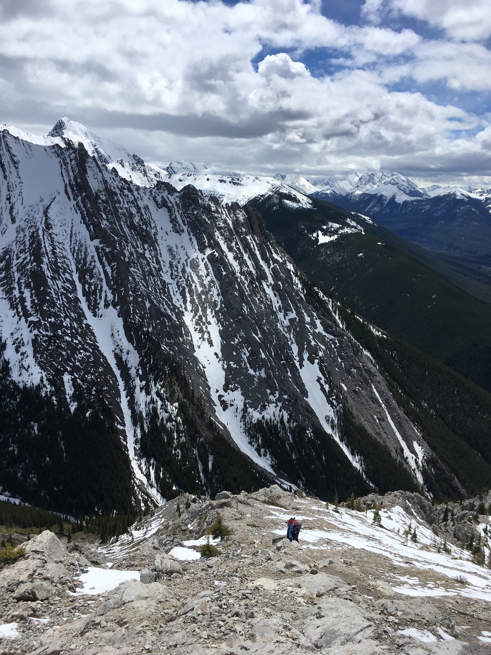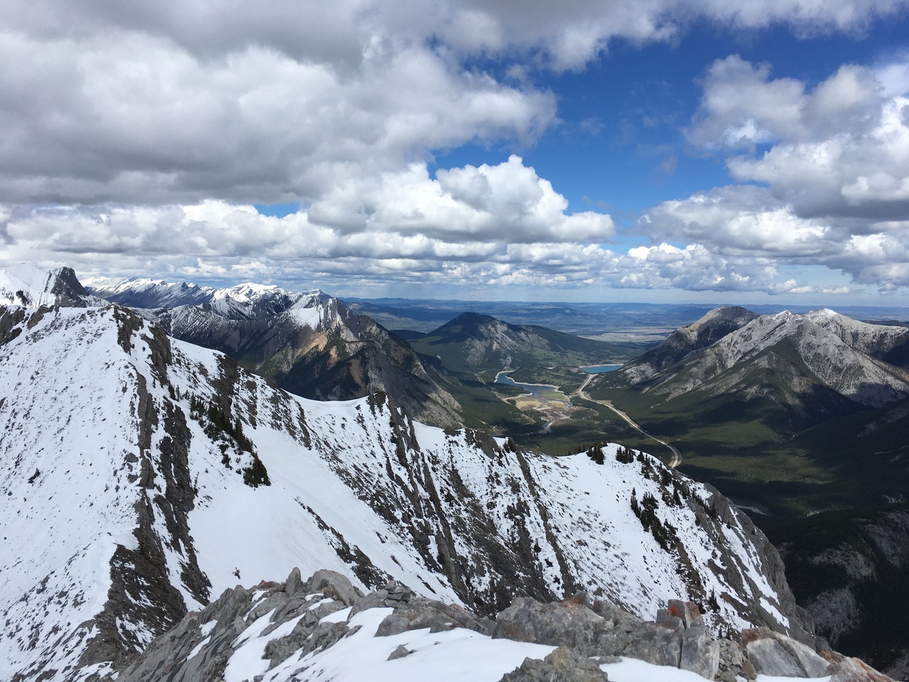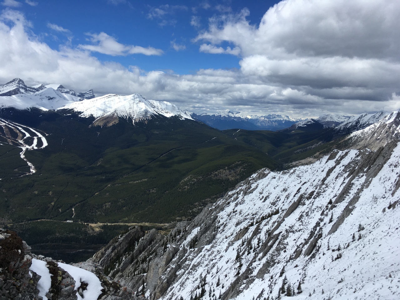 Looking back down the ridge. The initial ascent drainage is clearly visible (now far below) just before the Kananaskis Village turn-off.