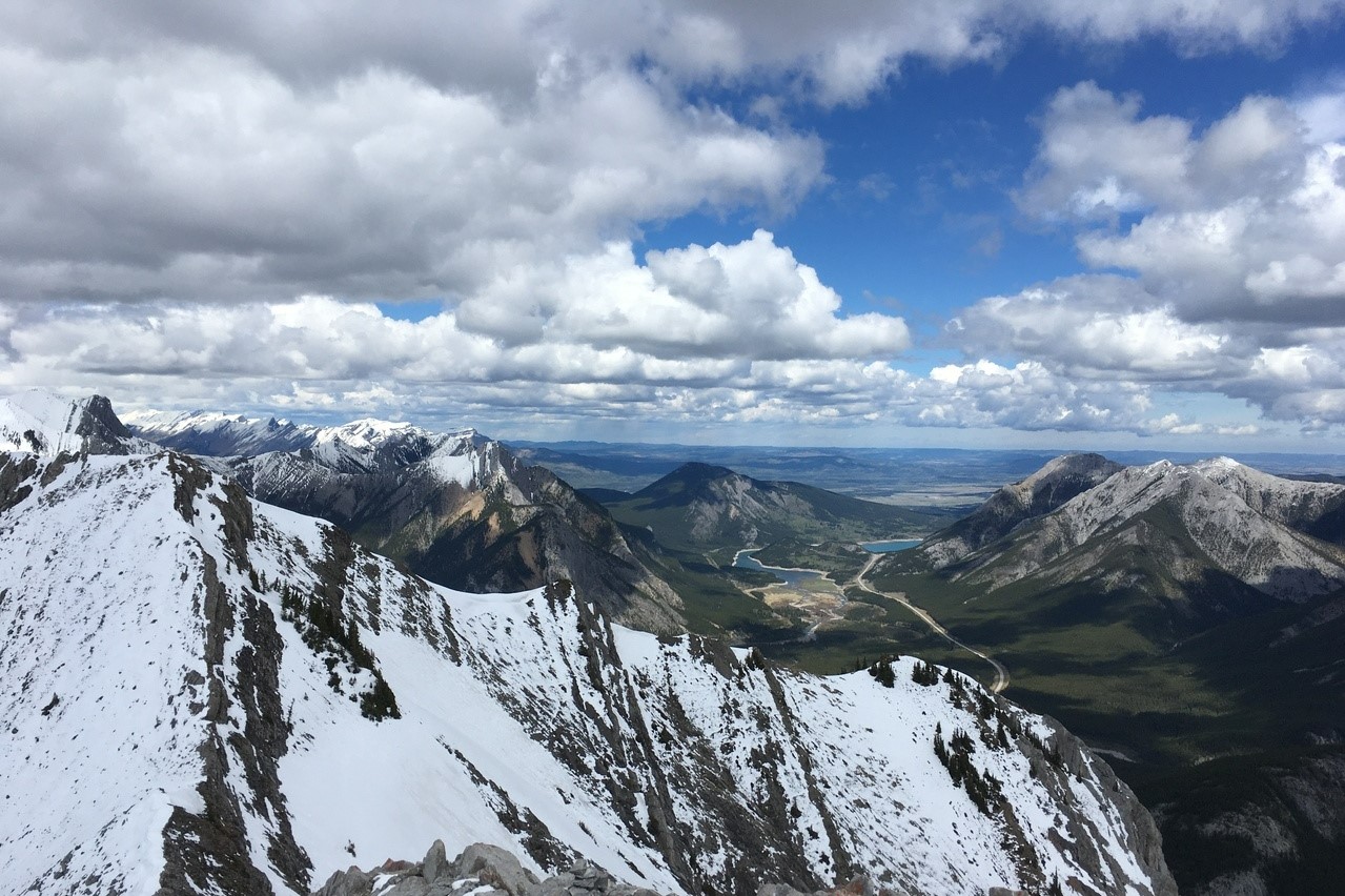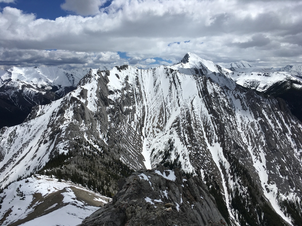 Olympic Summit, Mount Allan, and Mount Collembola form a triangle above Nakiska Ski Resort. Behind them, tower a collection of big peaks, including (from left to right) Mount Bogart rising over Ribbon Peak, Mount Sparrowhawk reaching the clouds, and Wind Mountain along with the rest of the peaks from Mount Lougheed.