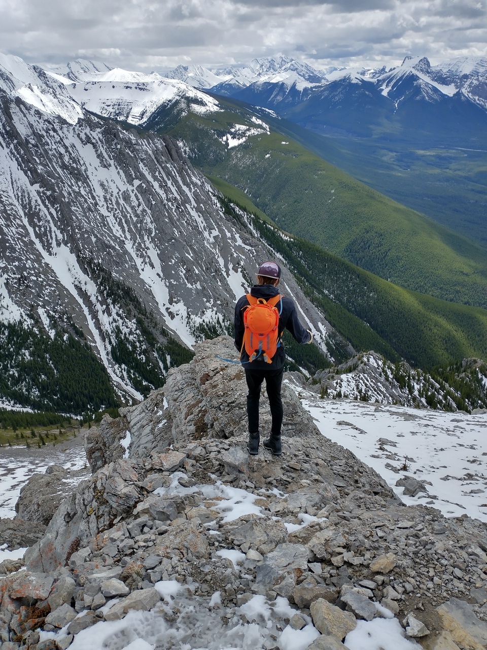 After a peaceful night at Canyon Campground (we were the only ones! Not that it should've been much of a surprise with all the piles of snow still kicking around...), we headed back down Highway 40, scoping out possible scrambles despite all the lingering snow. When we came to the pull-off where the scramble route up Wasootch Peak begins, the sun was beating down on the ascent slope, and this looked super inviting after a very chilly outing on Packenham Jr. the previous day! As such, the decision was easy, and off we went, hoping the remaining snow on the final scree slope wouldn't pose as much of a problem as the slick, snow-covered grass from yesterday did...