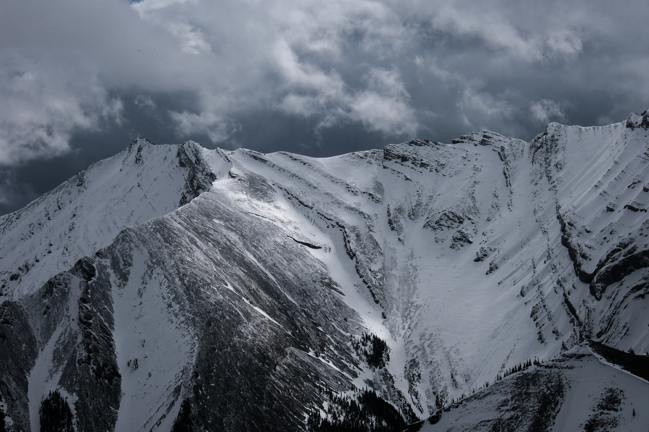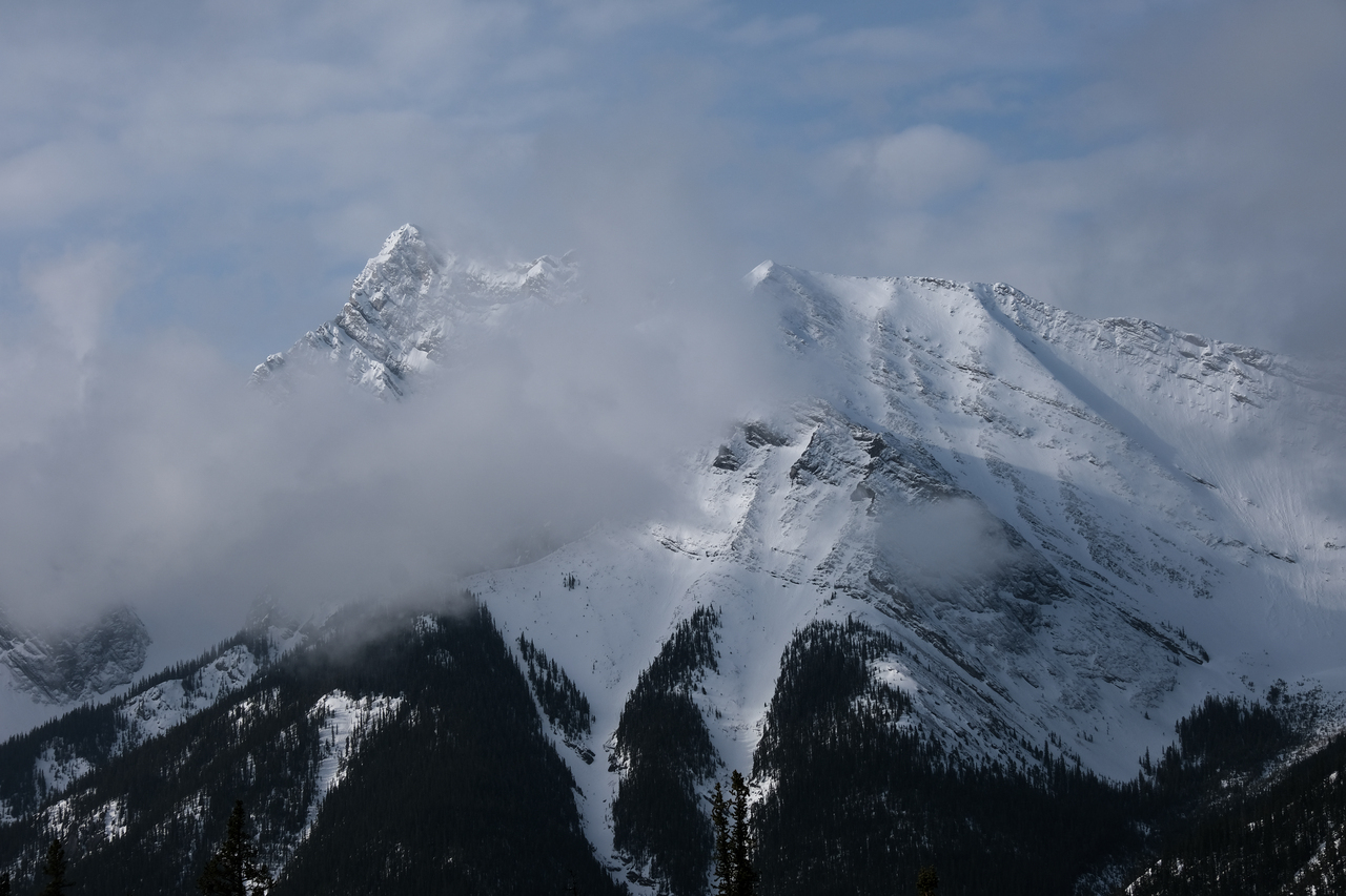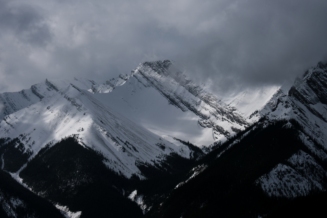 Wasootch Peak's double summit is highlighted for a brief moment. Wasootch Tower sits bottom right.