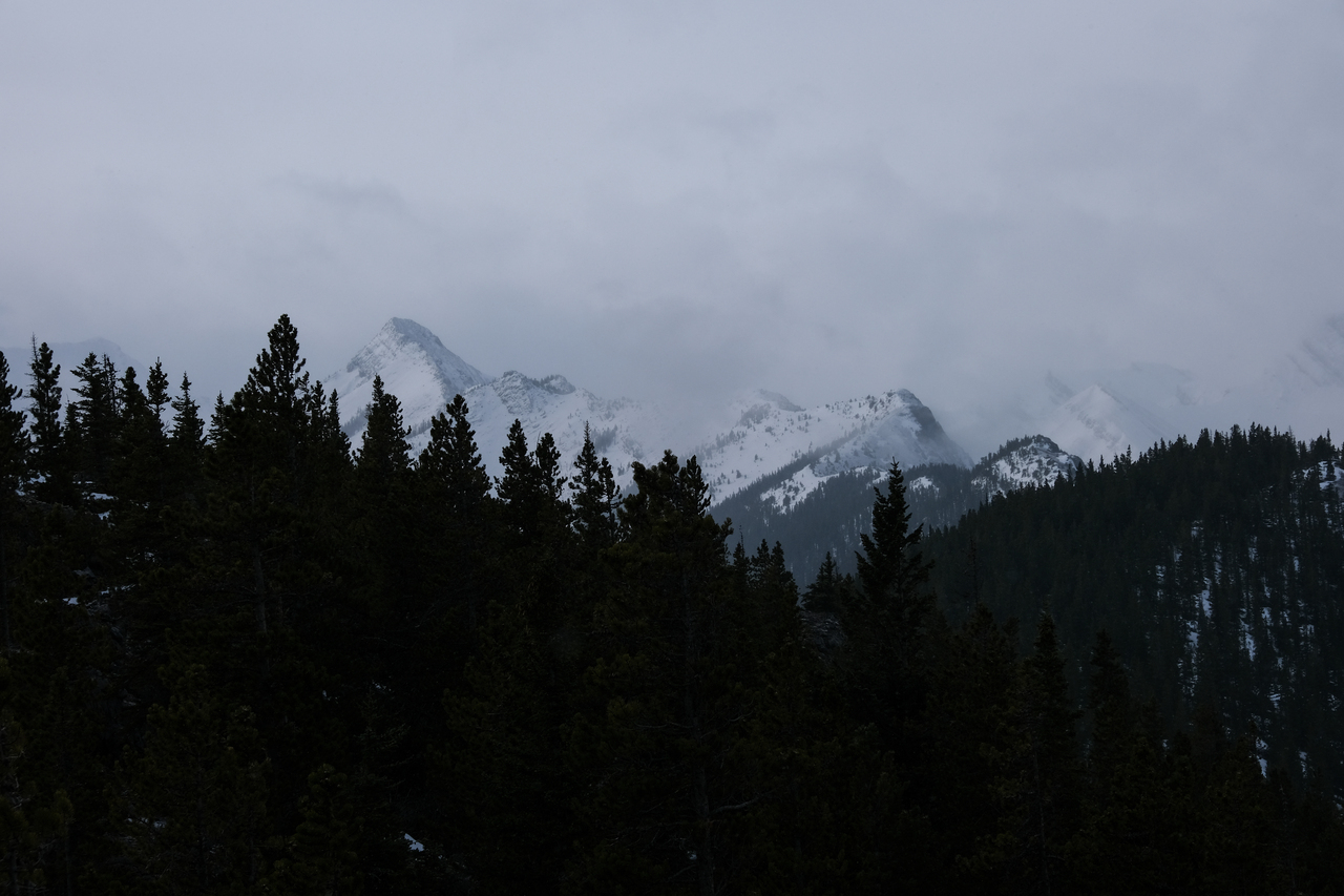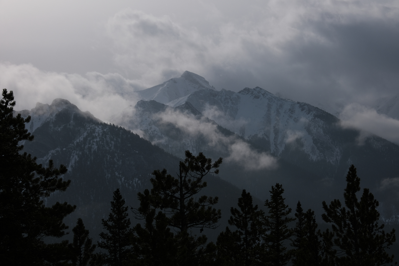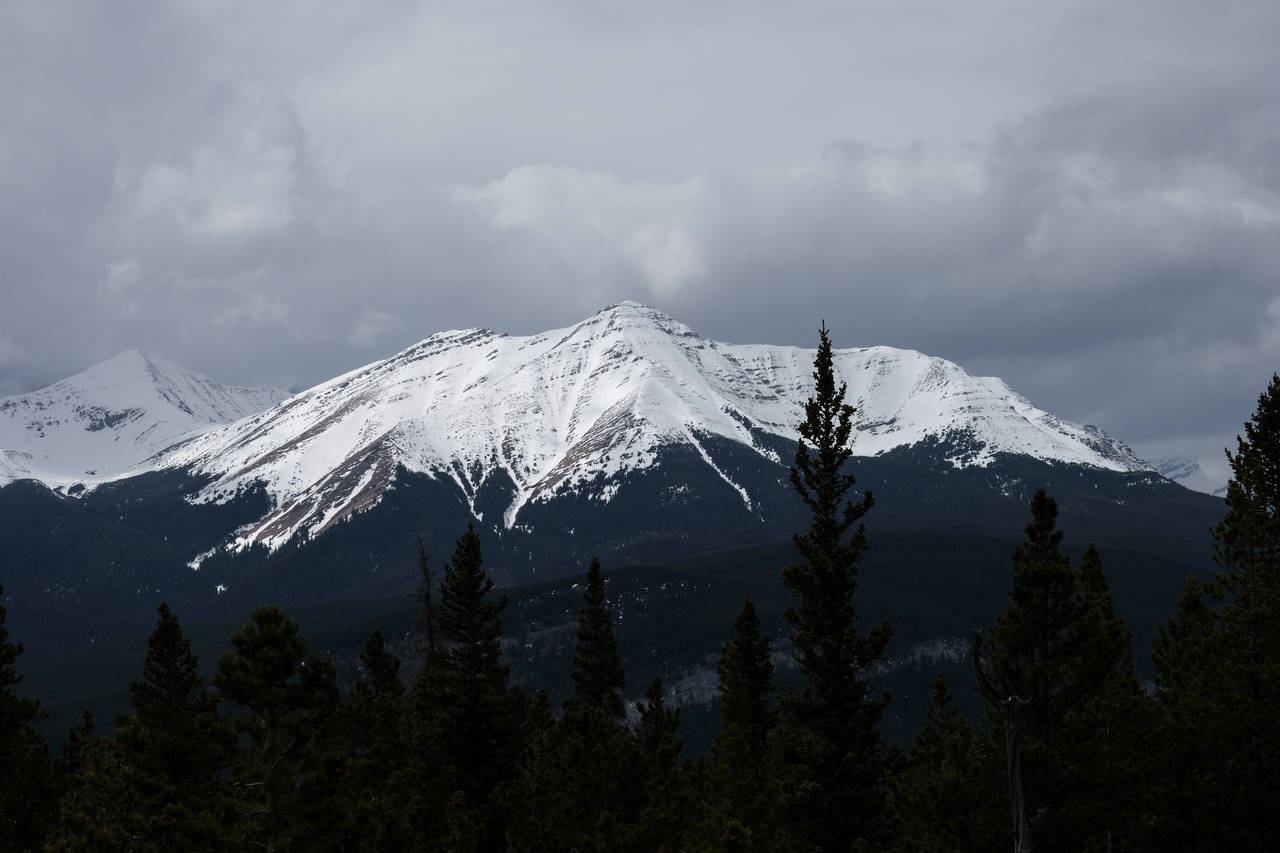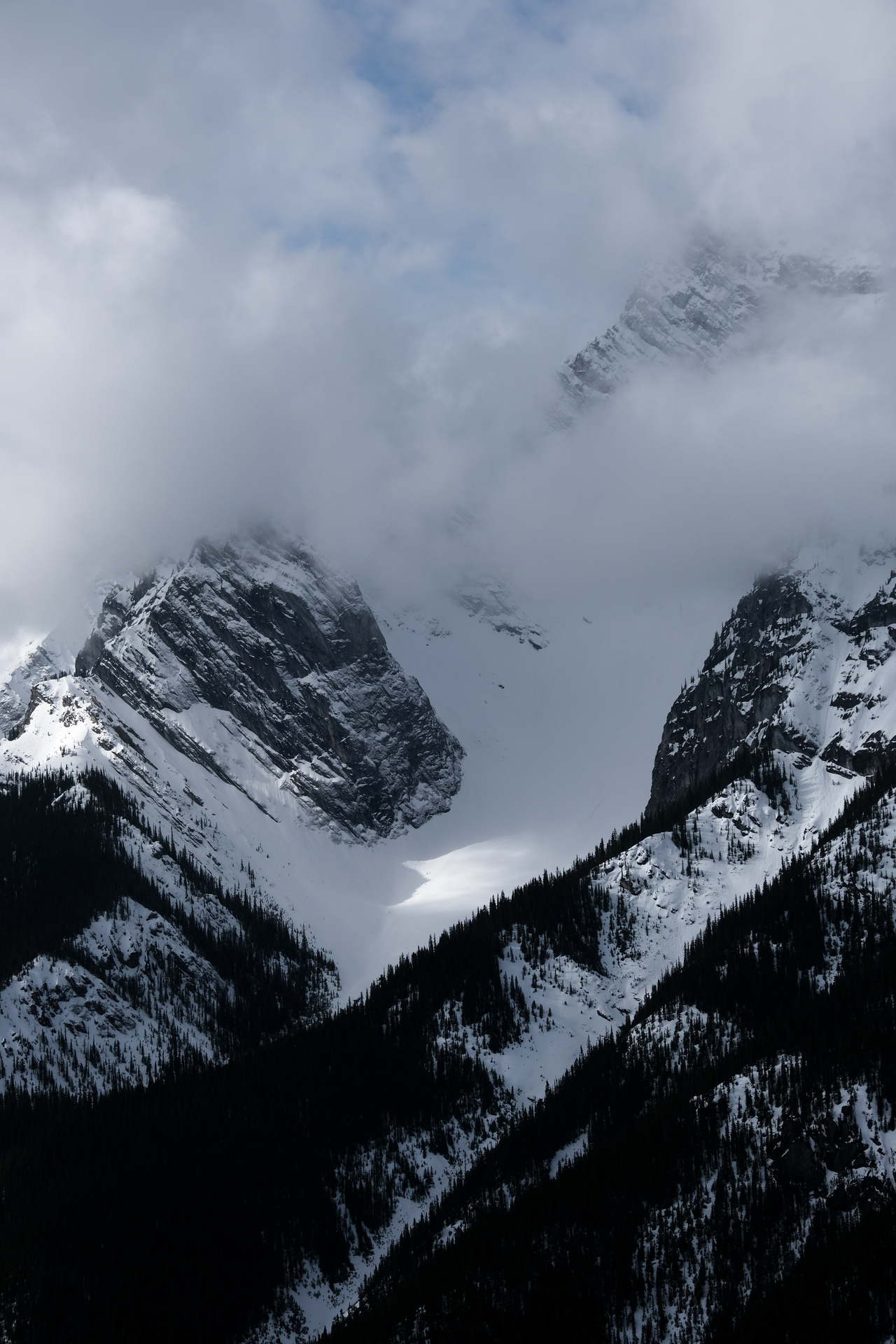 Wasootch Peak's double summit is highlighted for a brief moment. Wasootch Tower sits bottom right.