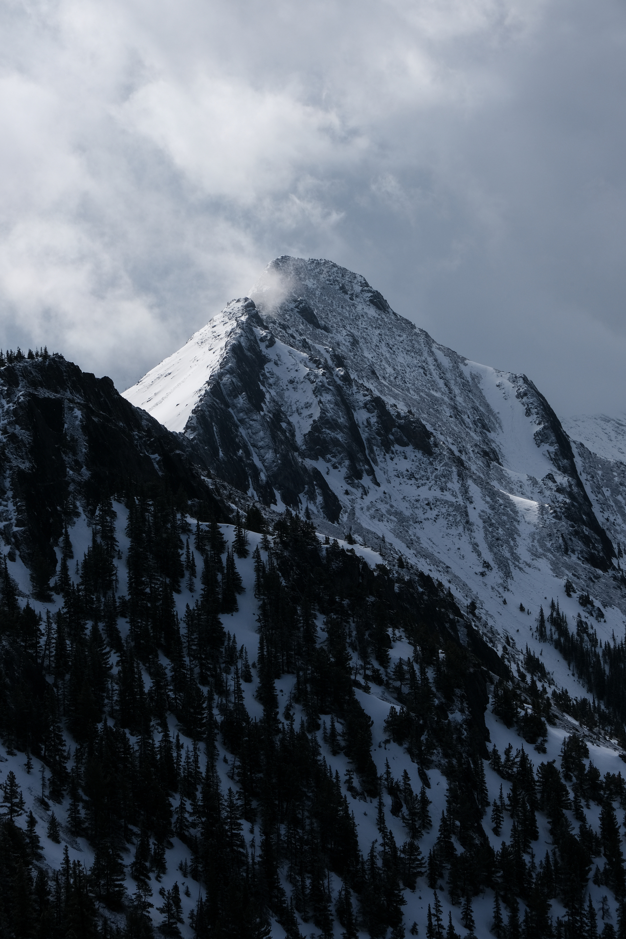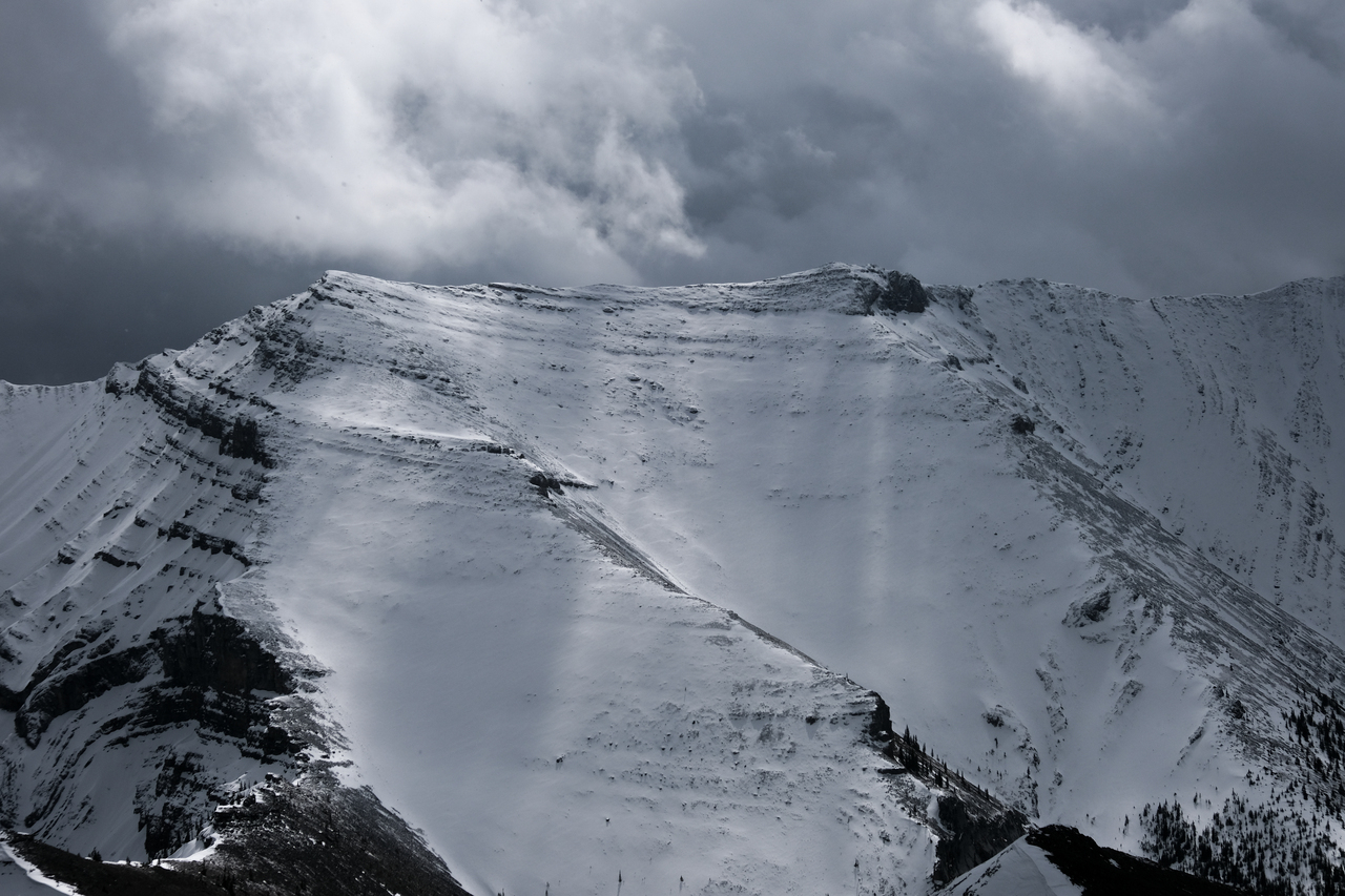 A hole in the clouds lets the sun break through, casting a spotlight on Bryant Ridge Peak 5.