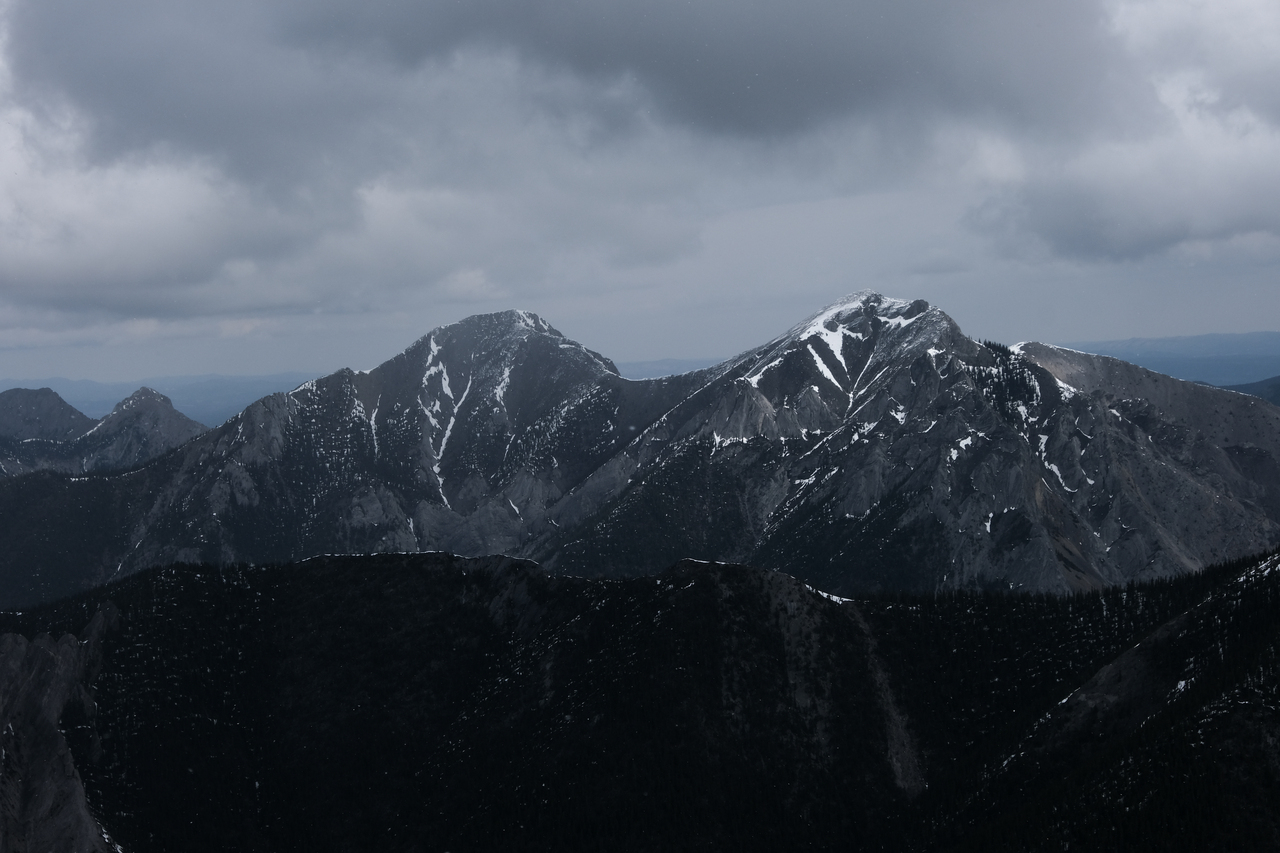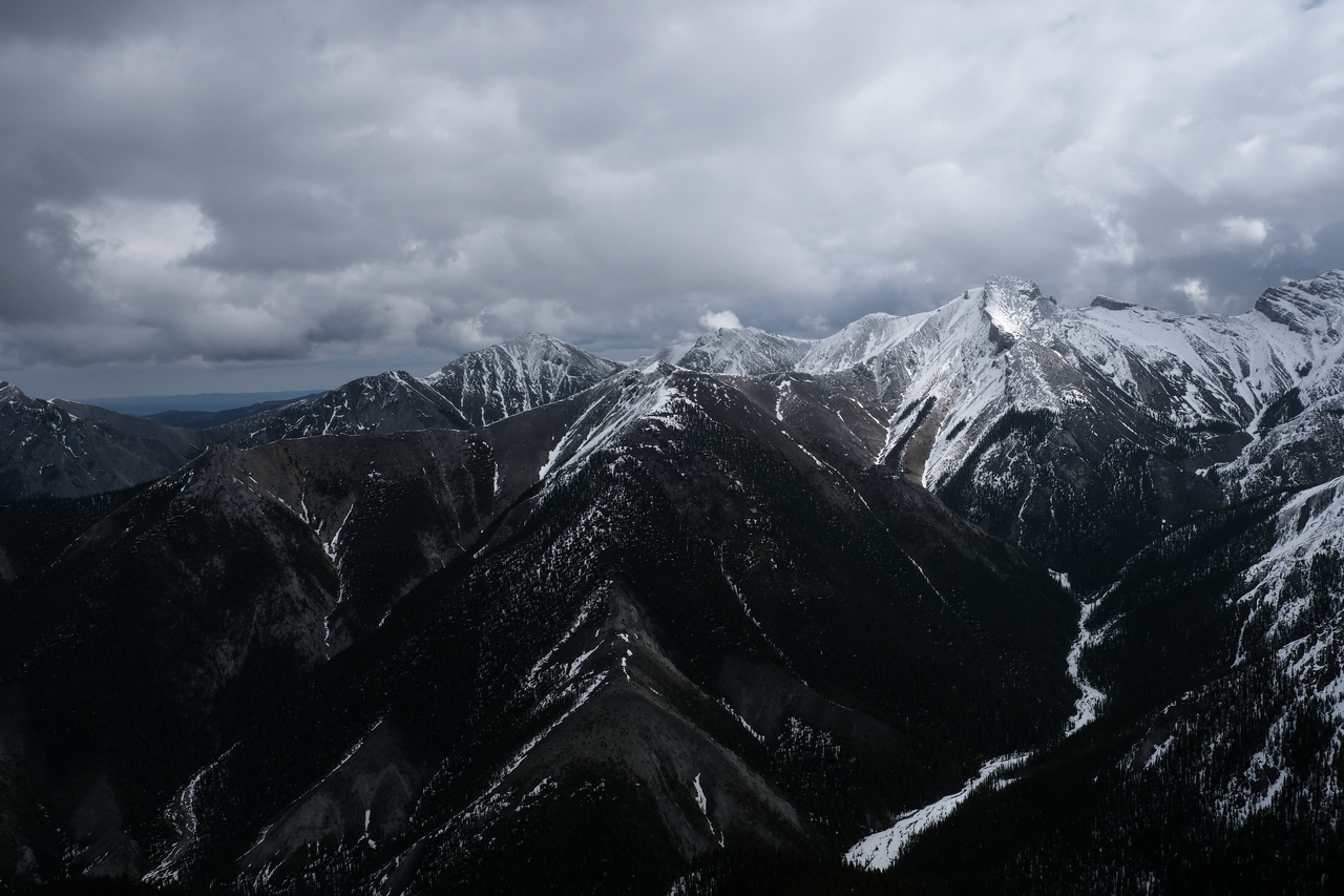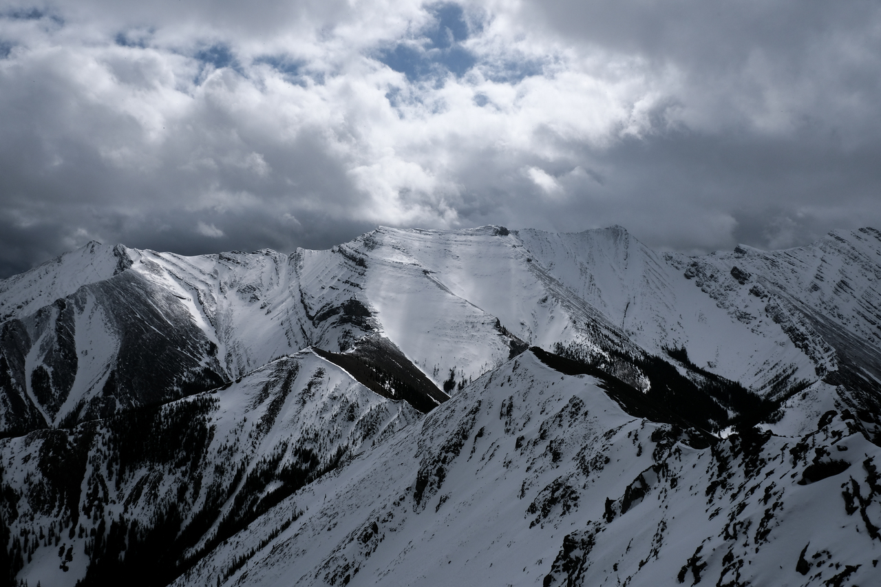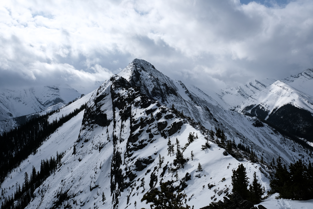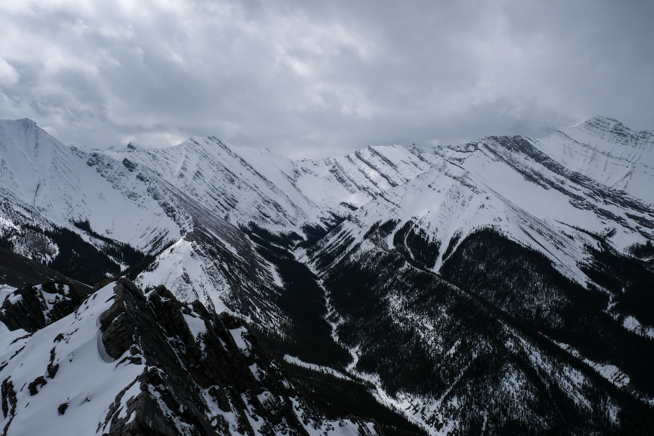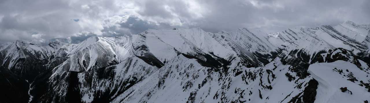 Comprehensive view to the south upon reaching the summit of Wasootch Ridge! Tiara Peak, Bryant Ridge Peaks 3, 4, 5, and 6, and finally Mount McDougall from left to right.