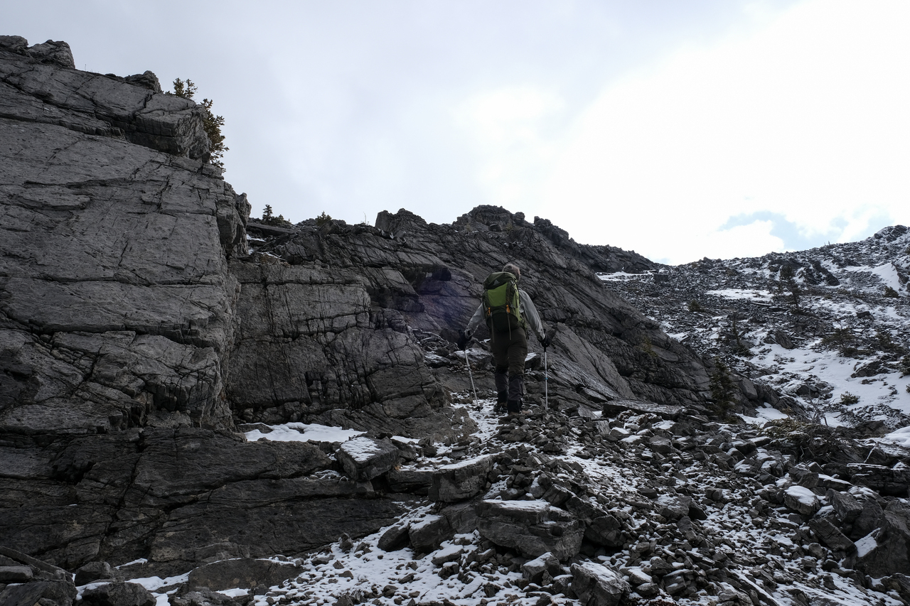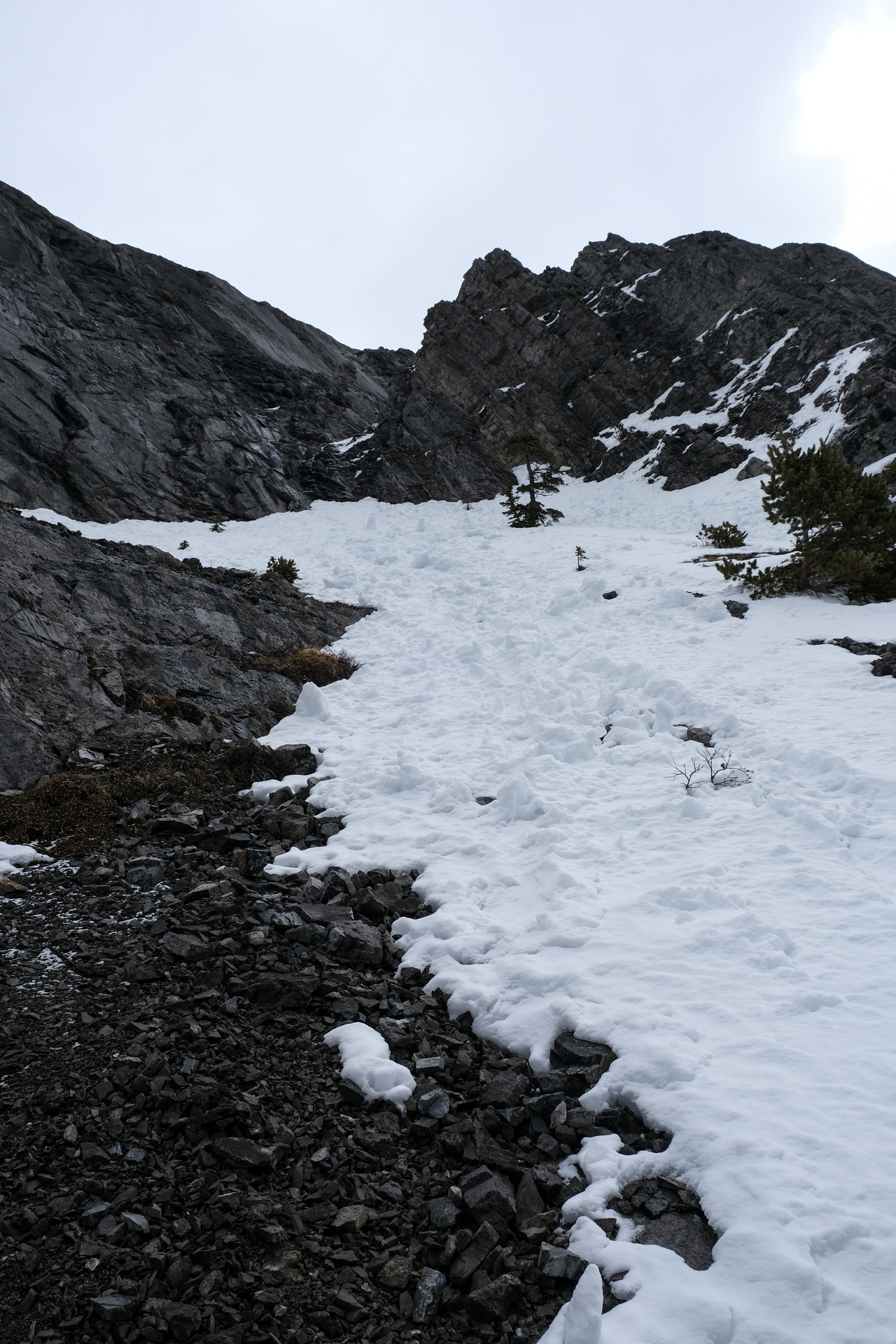 We soon reached the point where the ridge narrows and becomes blocky, and saw two trail runners (who had passed us earlier) turning around. They said that the terrain was a bit too much to stomach, and were calling it a day. With this information in mind, we were prompted to descend a short scree slope to climber's right, to try traversing below the slabby ridge crest. Definitely not the day to try a difficult route with all the slippery snow!